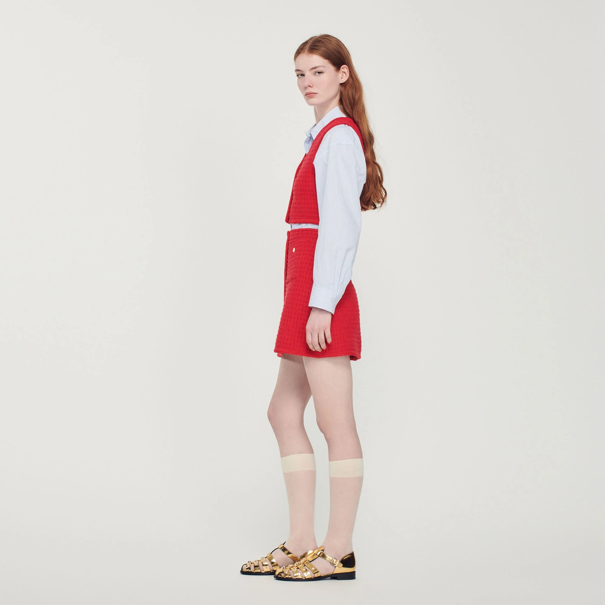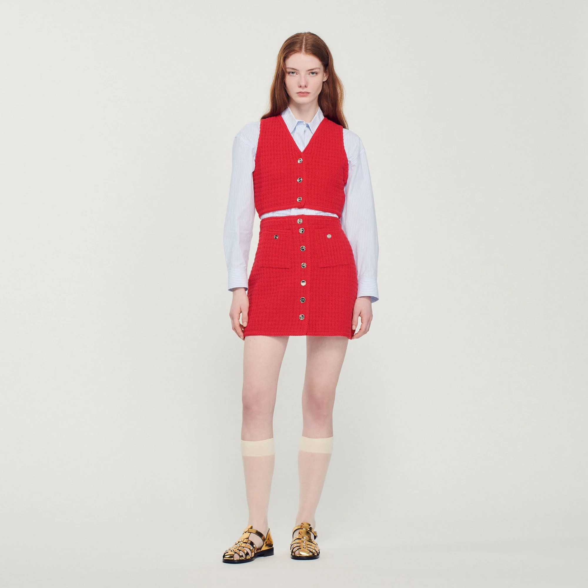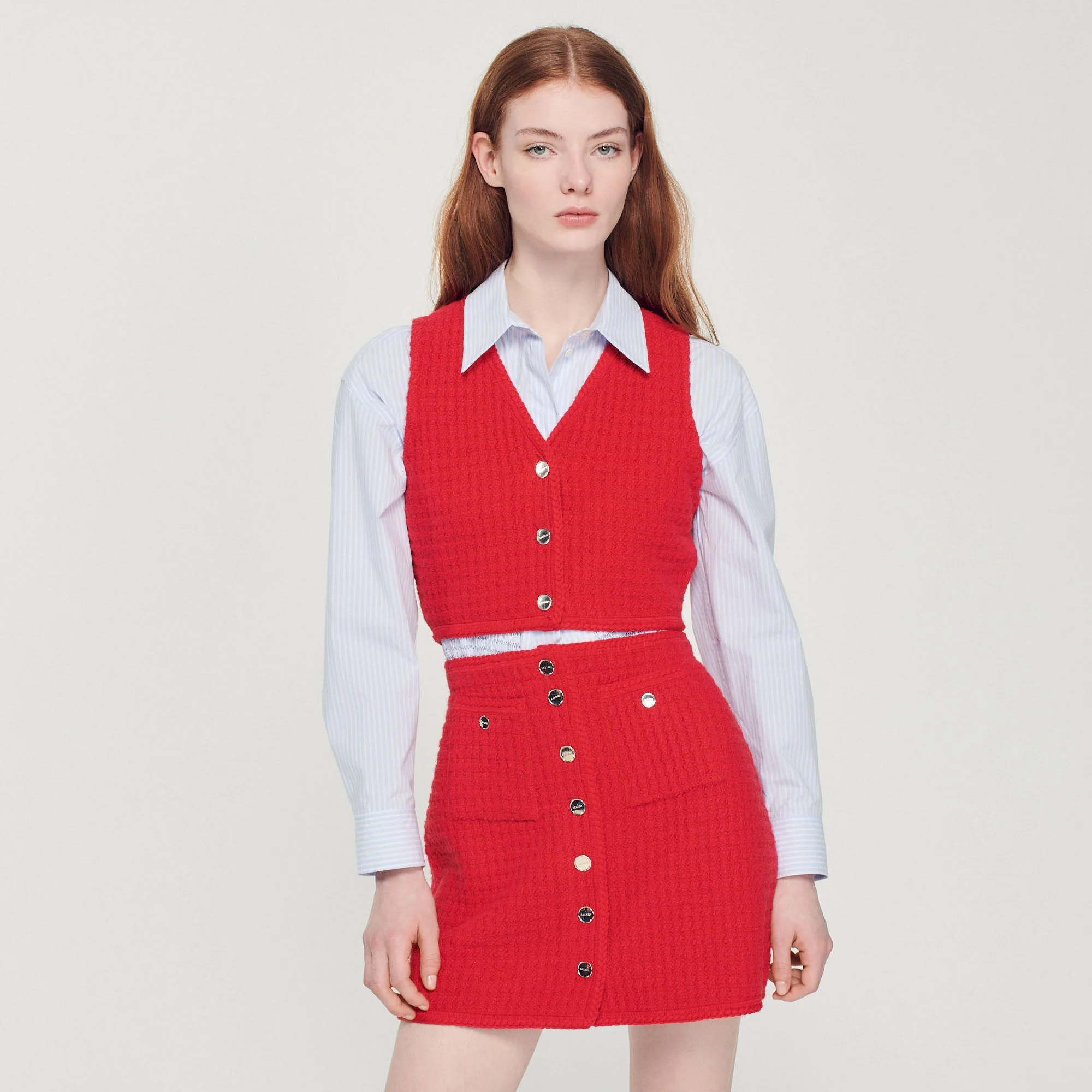 Jersey corto tipo corpiño sin mangas y escote en V de tweed con botones joya.