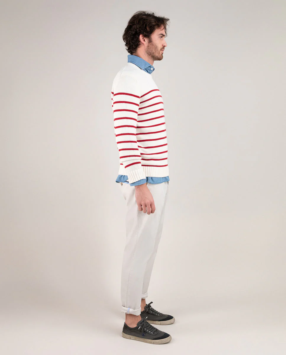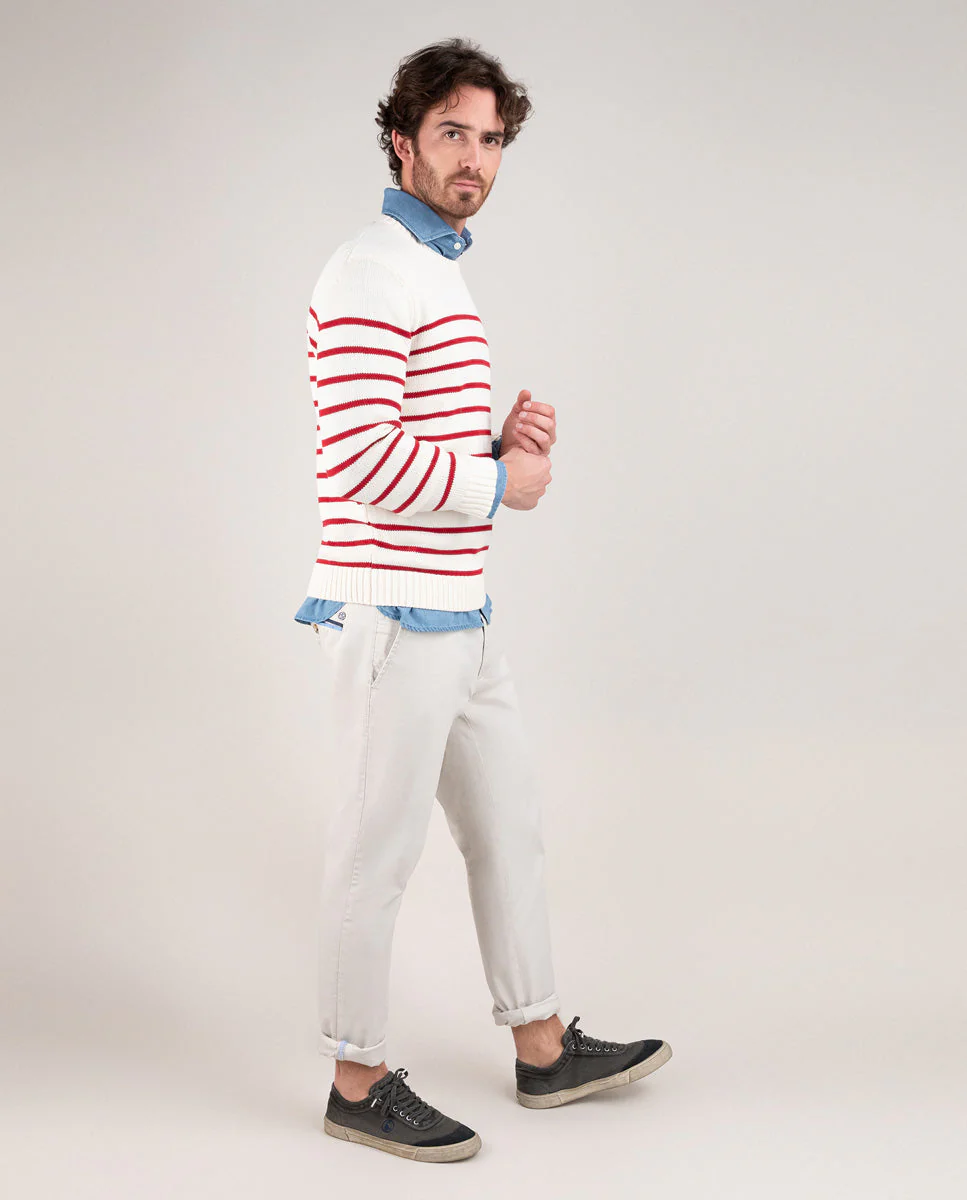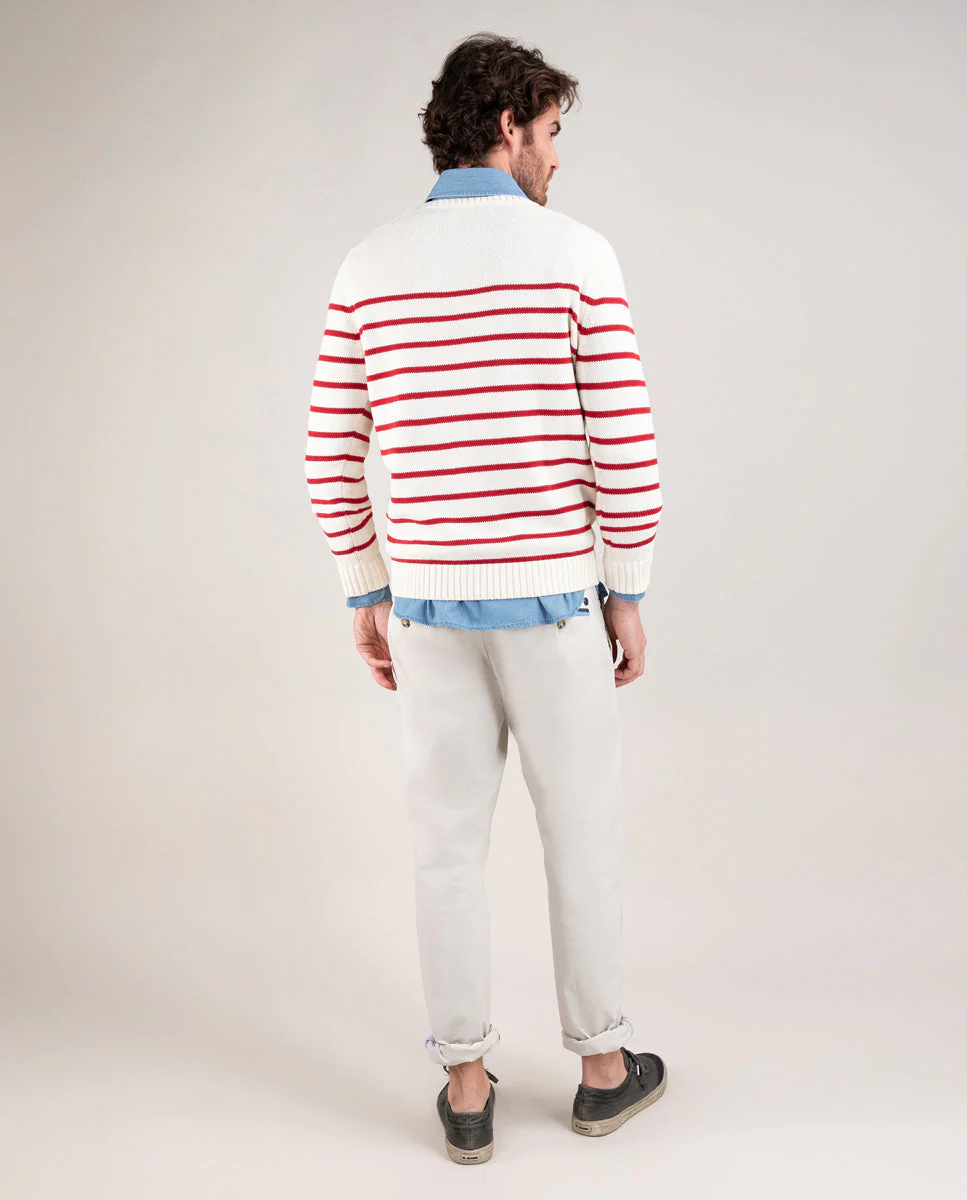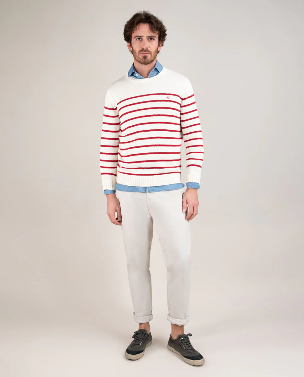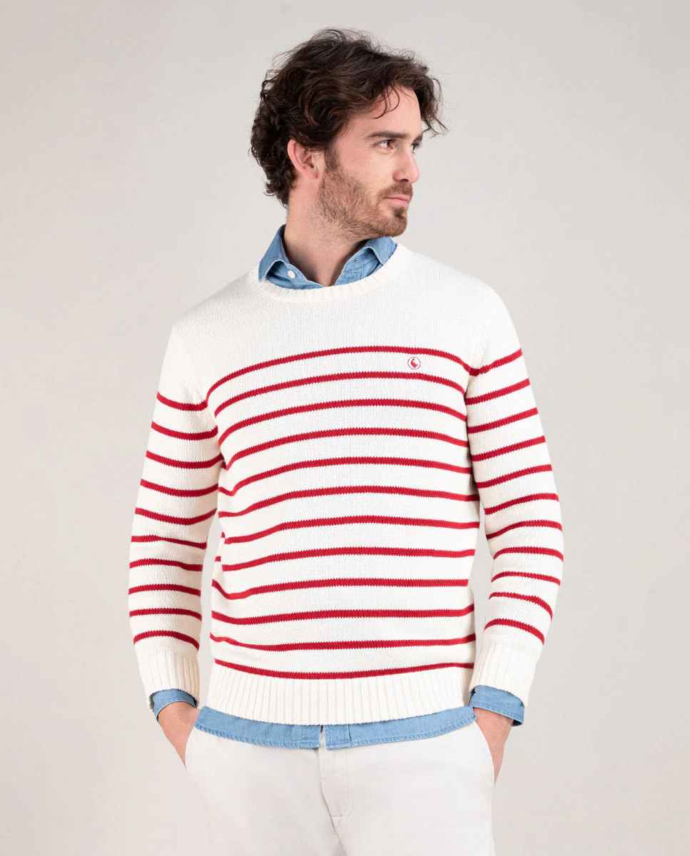 Jersey de rayas hombre cuello caja confeccionado en algodón. Corte regular fit. Manga larga acabada en rib. Logo bordado en el pecho.