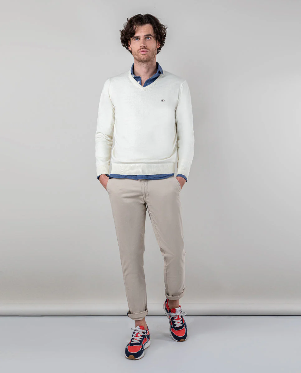Jersey confeccionado en tejido 100% algodón con hilatura melange. Corte Regular Fit, cuello de pico, coderas de antelina y manga larga acabada en rib. Logo bordado en el pecho. Detalles interiores a contraste de cinta corbatera.
