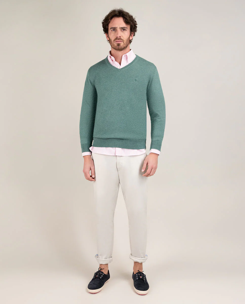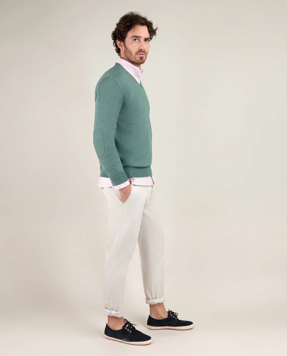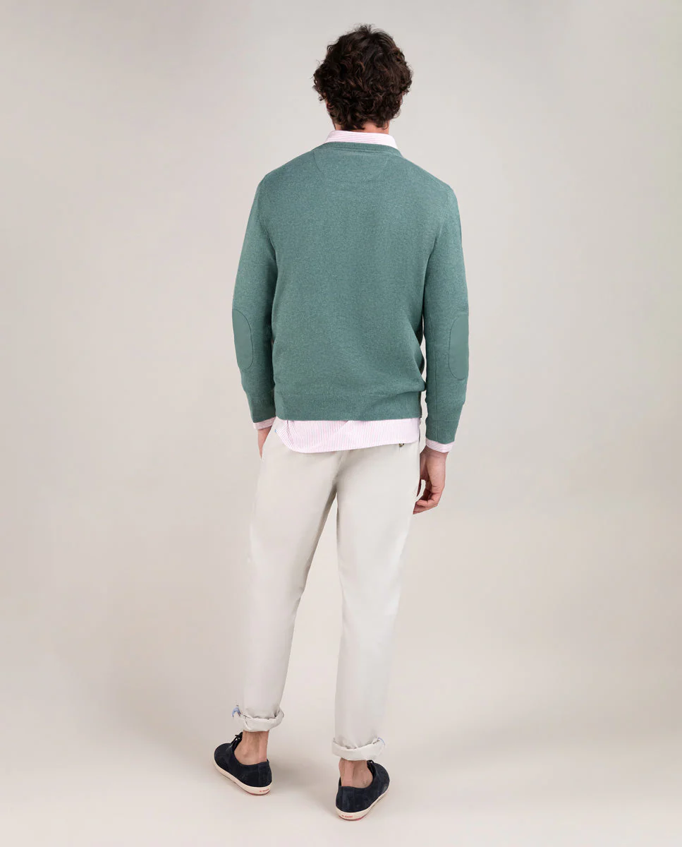 Jersey liso de hombre, fabricado en mezcla de algodón y cashmere para conseguir una calidad con mayor suavidad. Corte Regular Fit, cuello de pico y manga larga. Logo bordado en el pecho y coderas de antelina a tono.