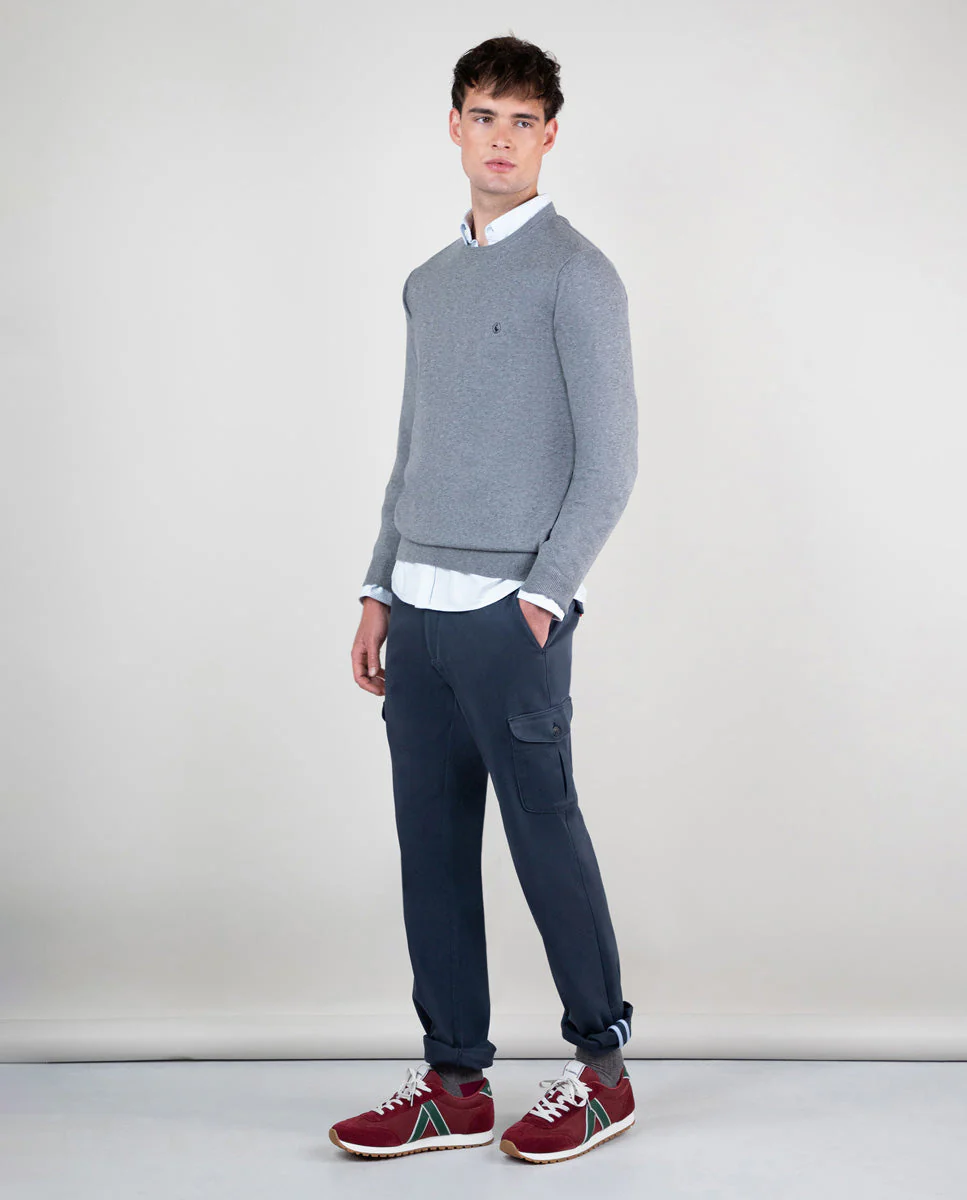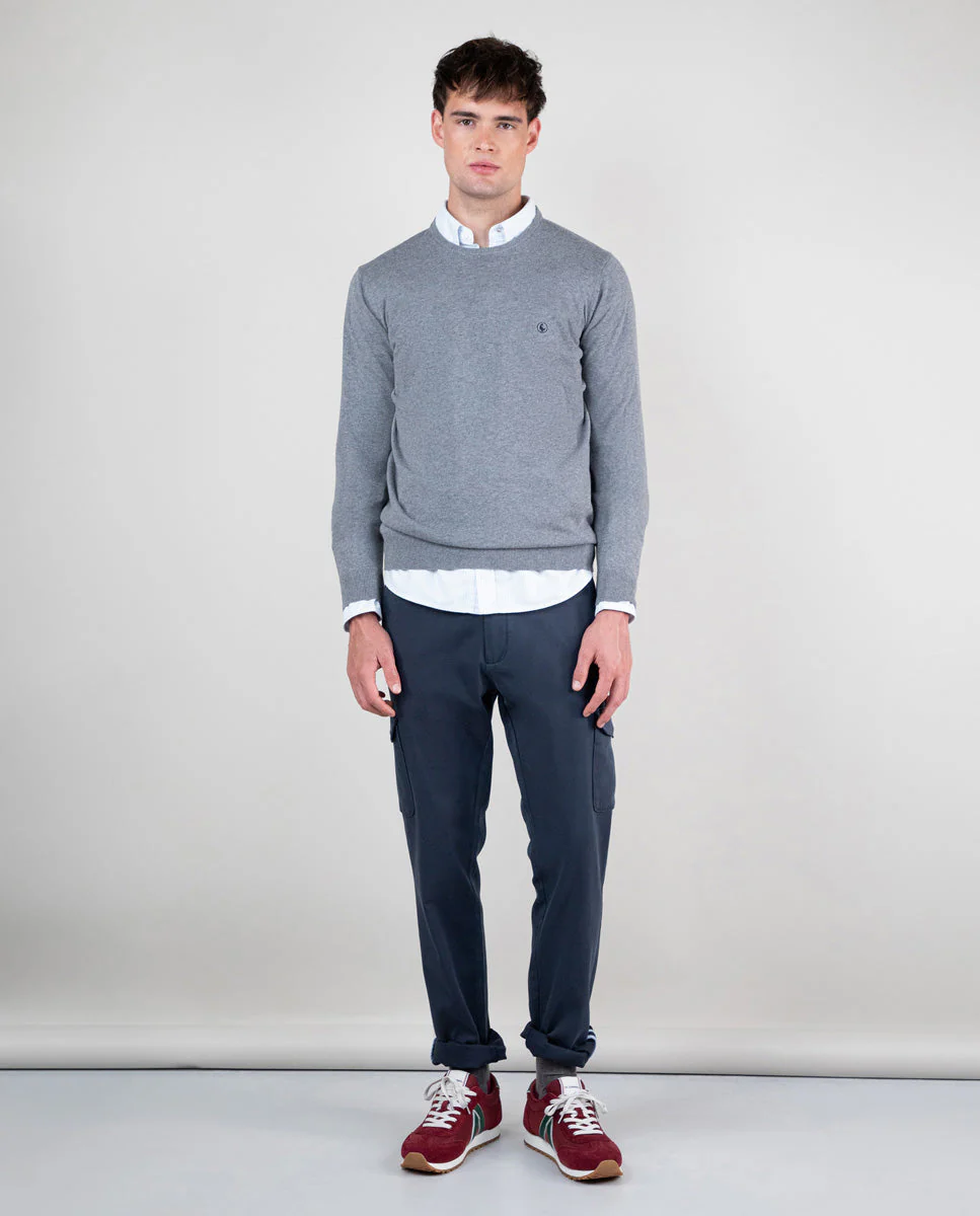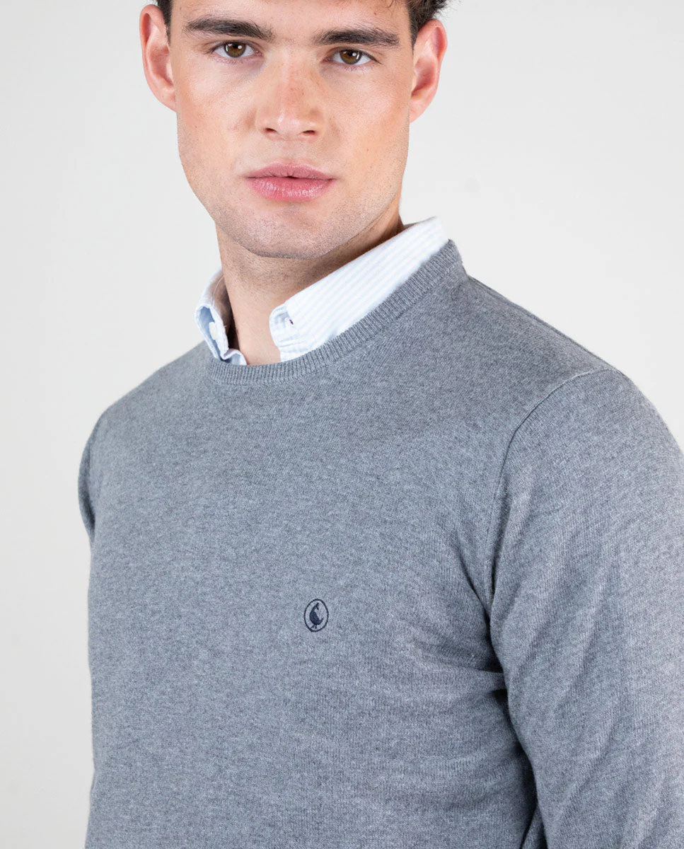 Jersey liso de hombre, fabricado en mezcla de algodón y cashmere para conseguir una calidad con mayor suavidad. Corte Regular Fit, cuello de pico y manga larga. Logo bordado en el pecho y coderas de antelina a tono
