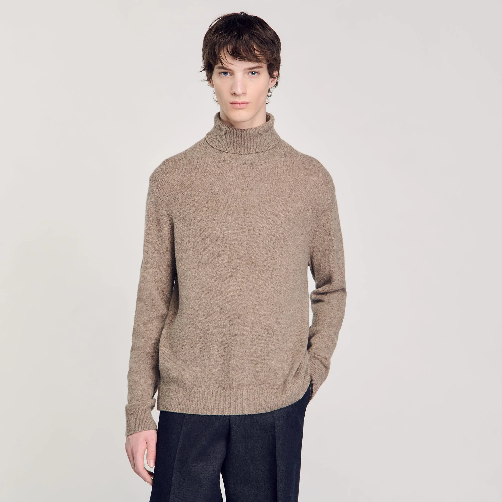 Jersey de cuello vuelto de punto suave de mezcla de lana, yak y cachemira, con mangas largas y bordes de canalé.