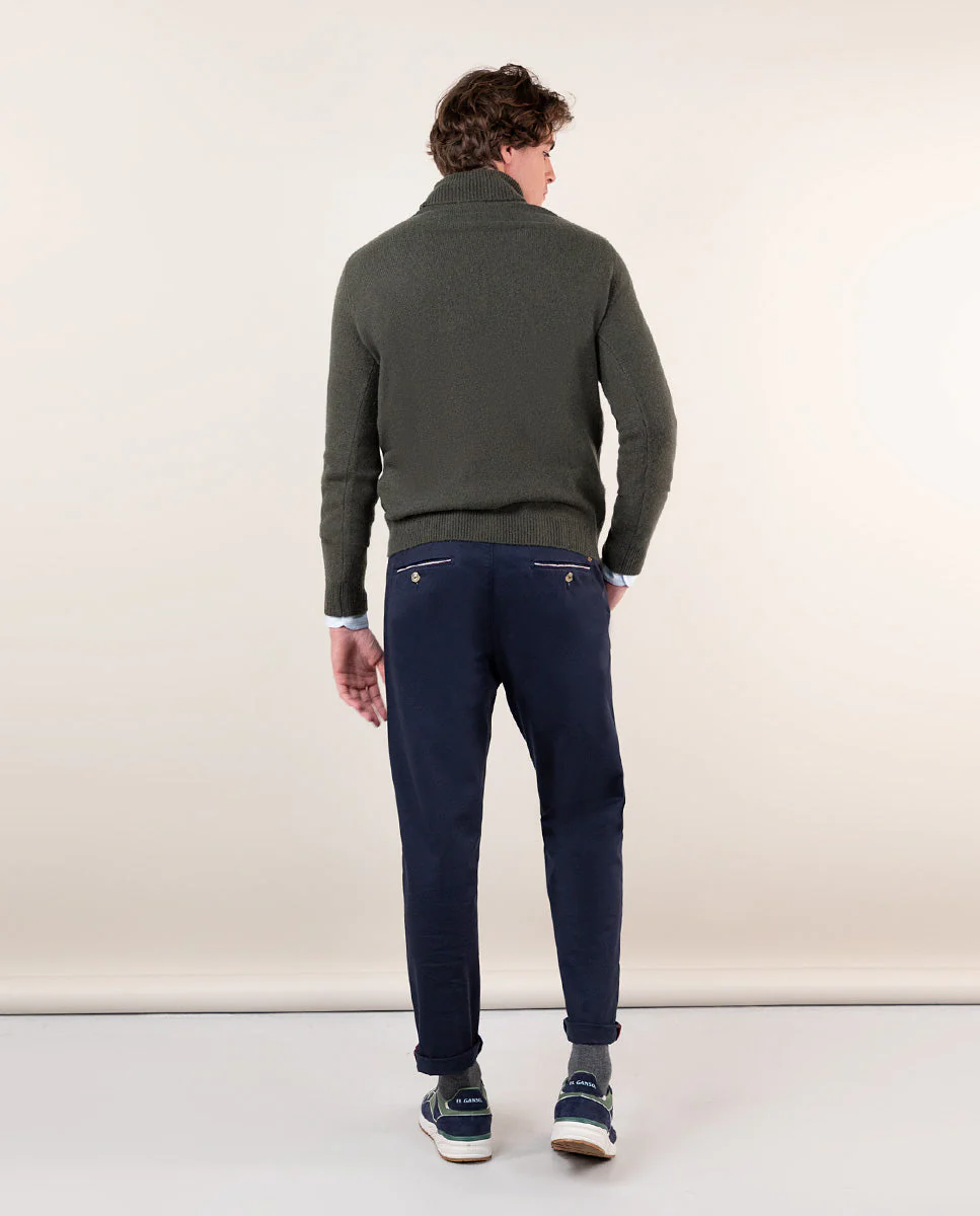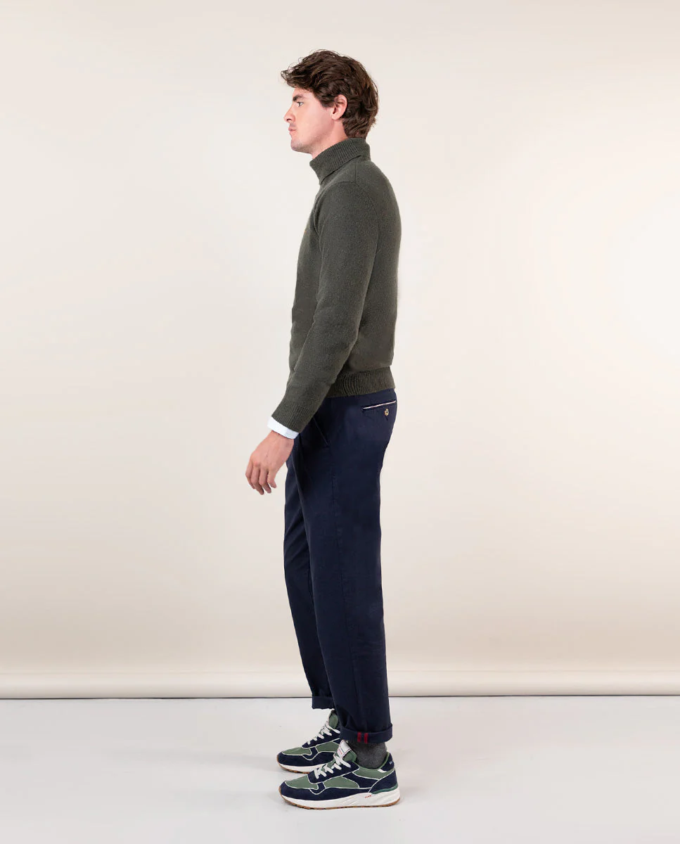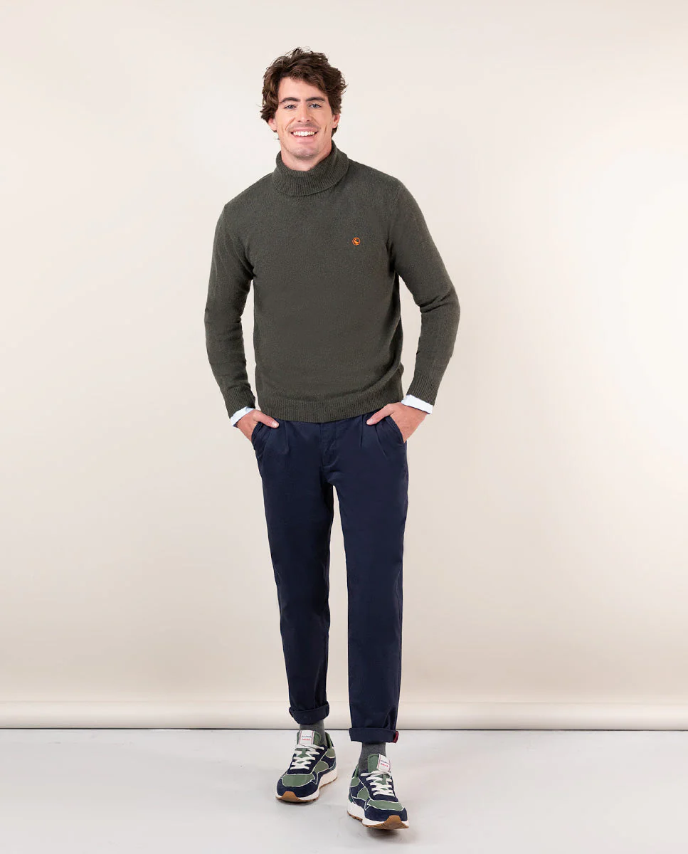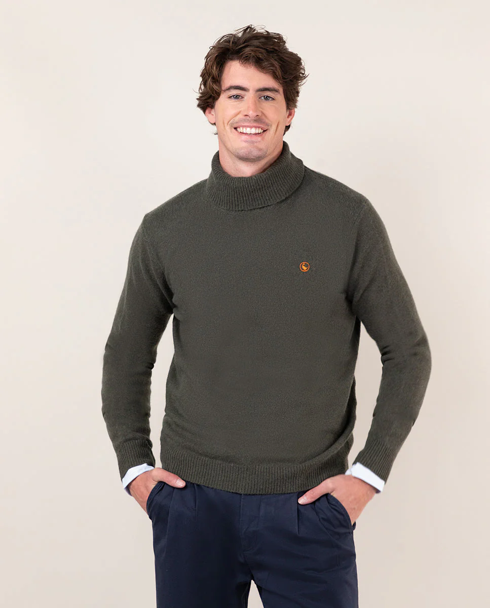 Jersey liso de hombre cuello vuelto confeccionado en tejido de lana. Corte regular fit, cuello vuelto y manga larga acabada en rib con detalle en el final. Logo bordado en el pecho.