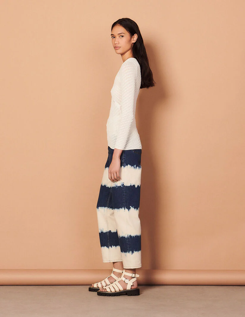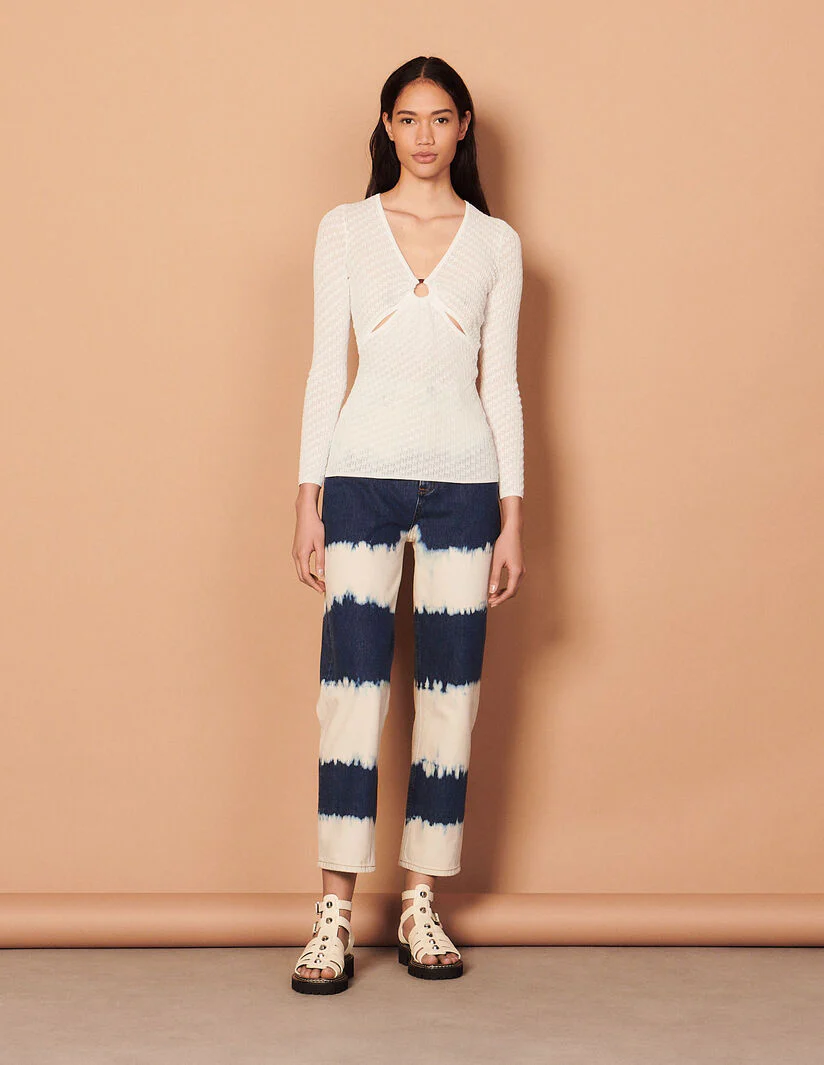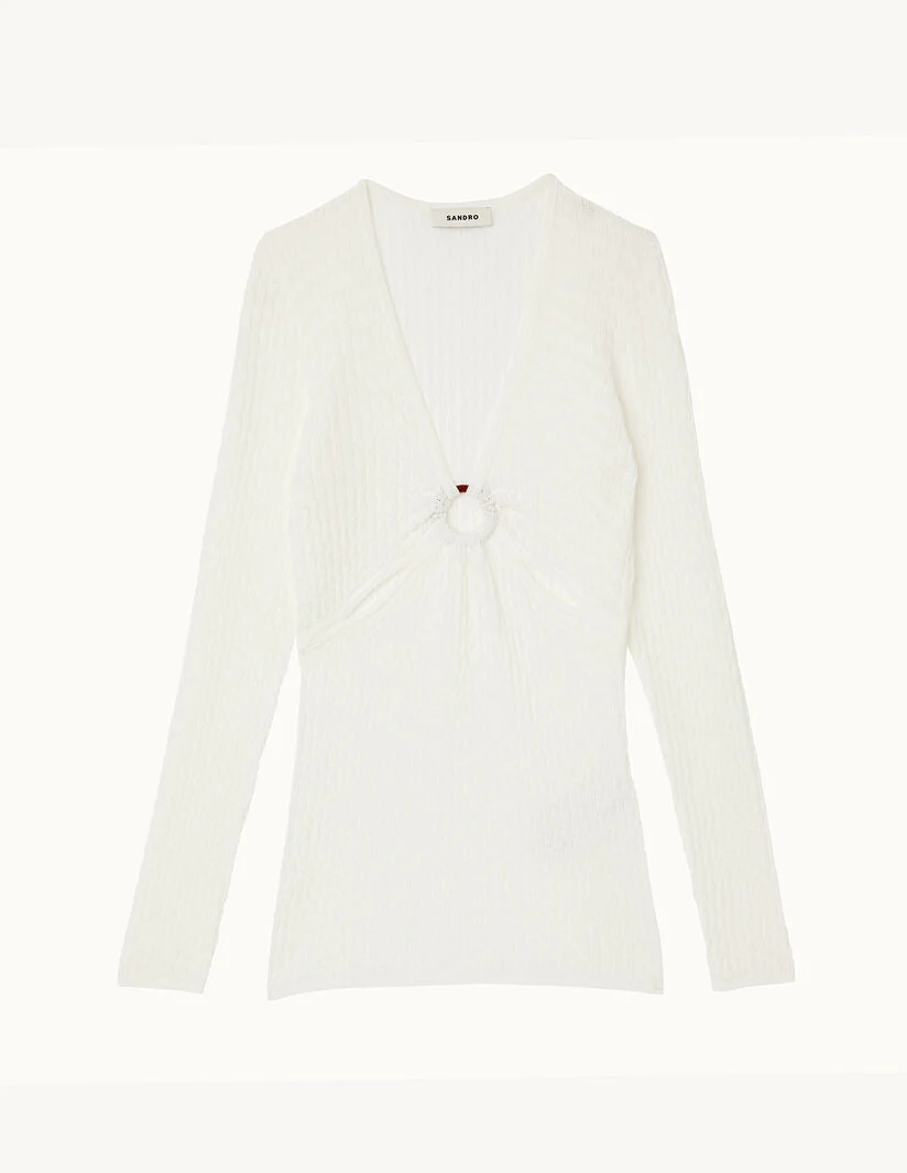 Jersey de punto pointelle calado con aberturas en los laterales, manga larga y escote en V adornado con una anilla.
