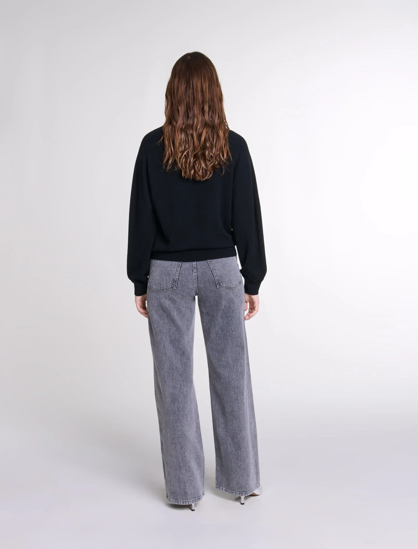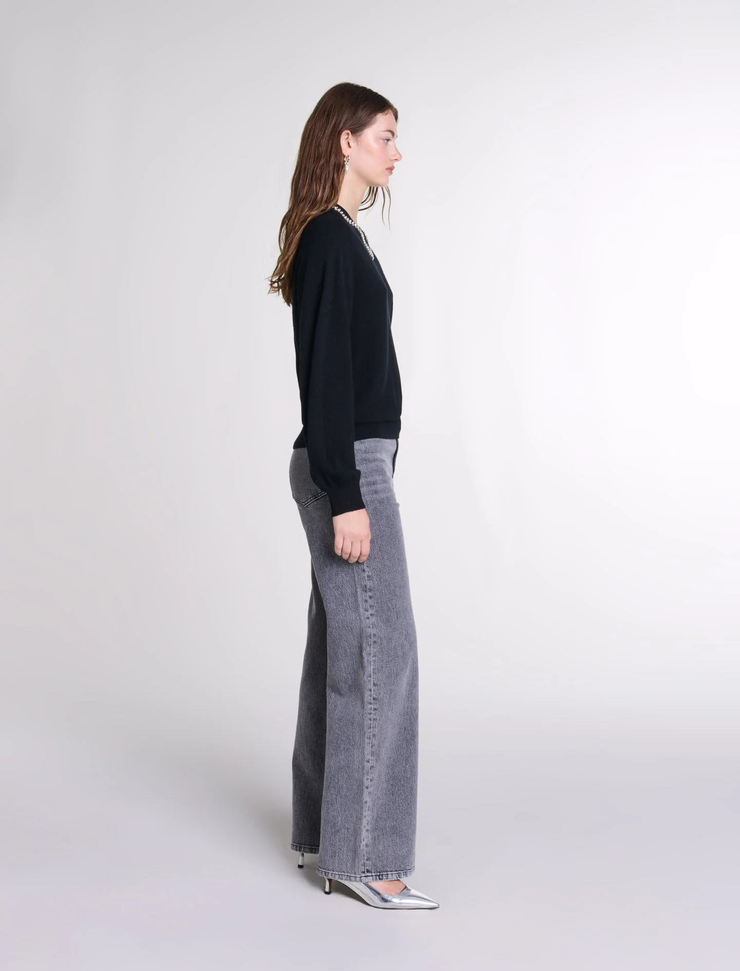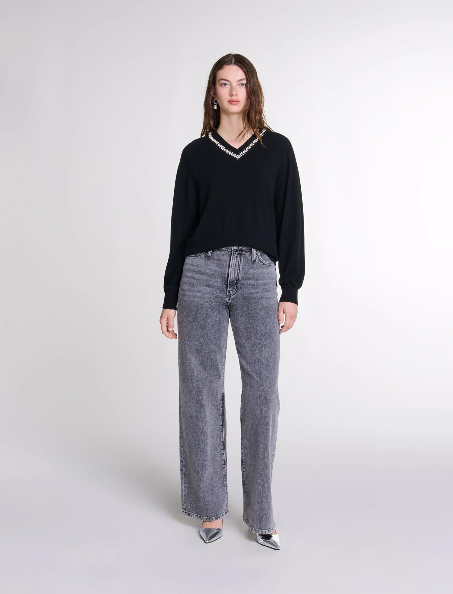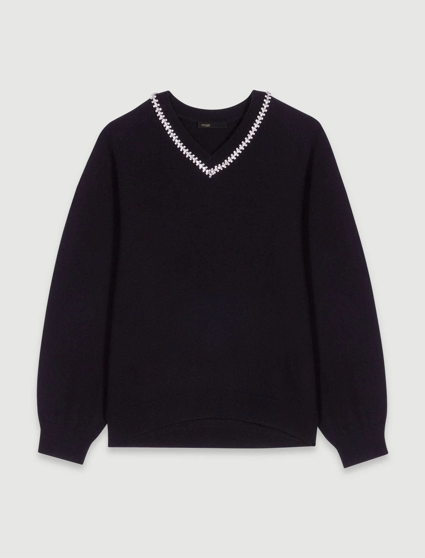 Este jersey, de punto suave y fino, presenta manga larga y bordes de canalé. Su escote en V, adornado con brillante pedrería, realza el look con sofisticación.