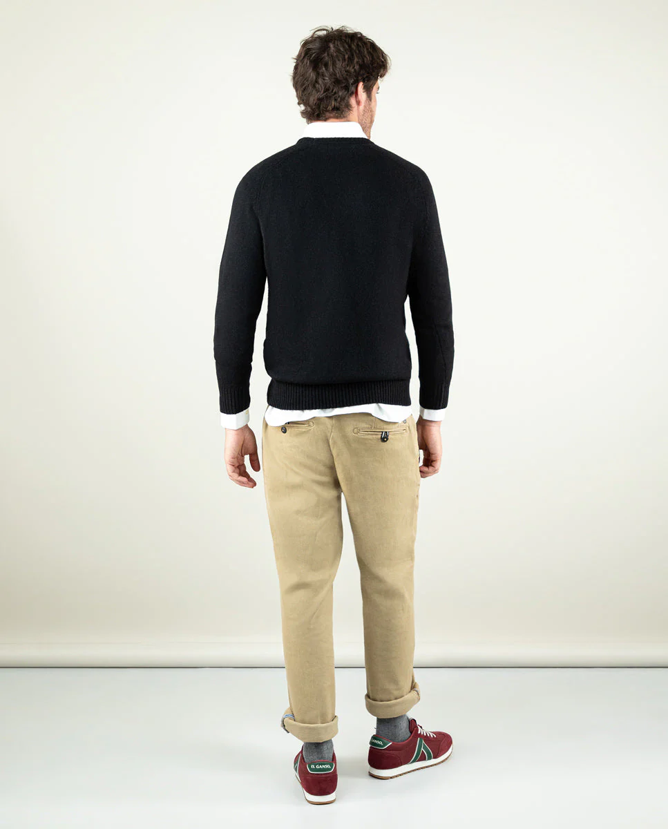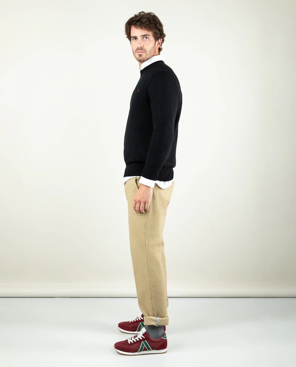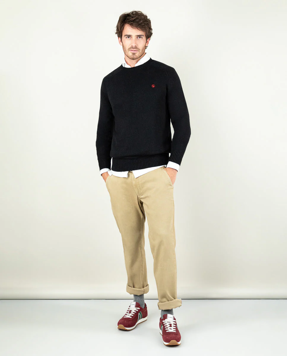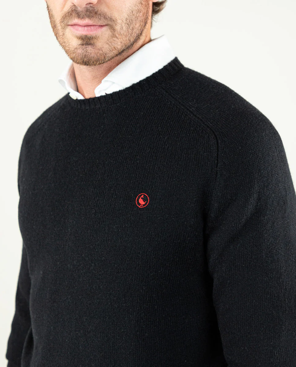 Jersey de hombre liso fabricado con lana merino. Corte regular fit, cuello redondo y manga larga con puños acanalados y bajo también. Logo bordado en el pecho.