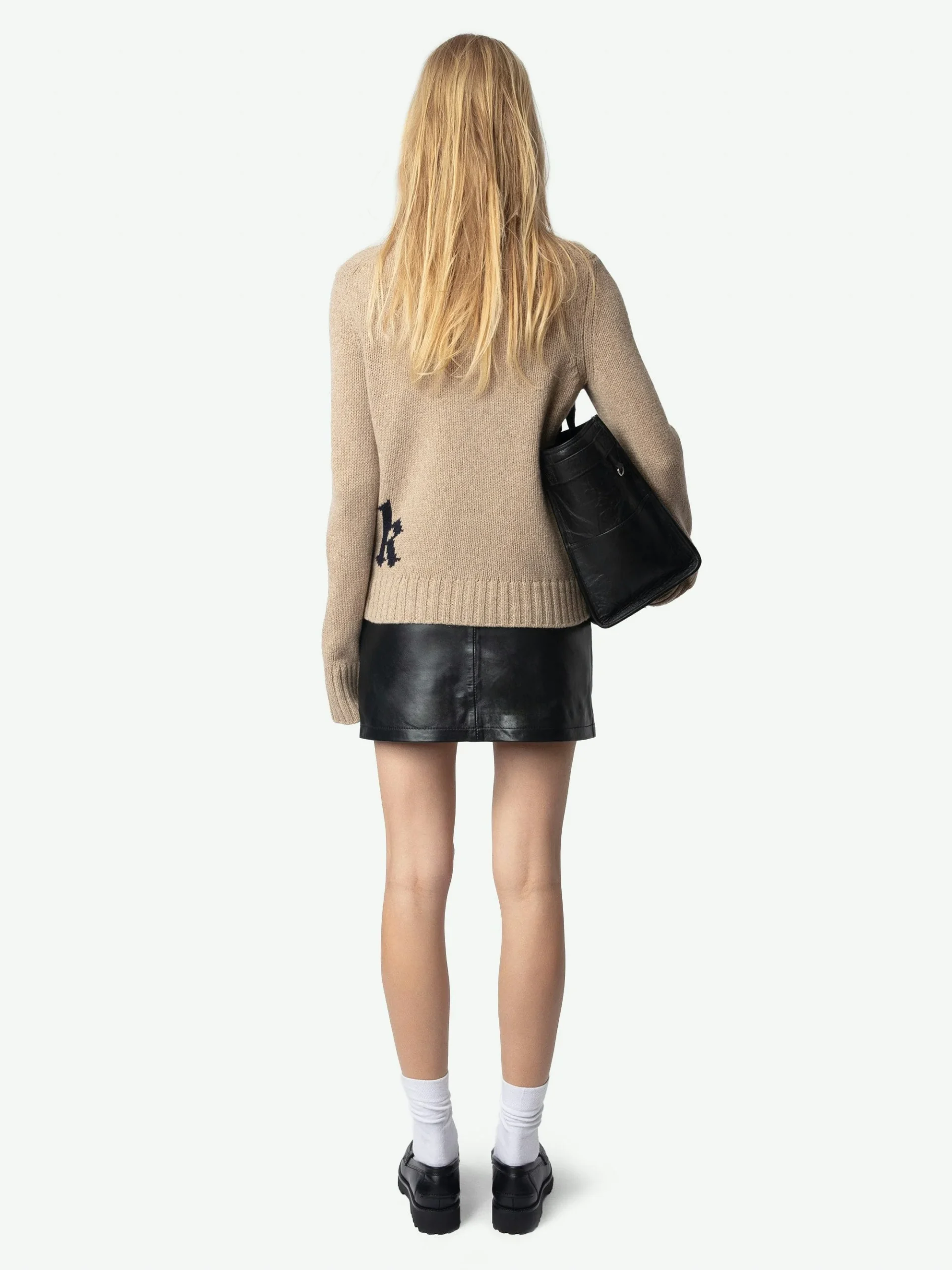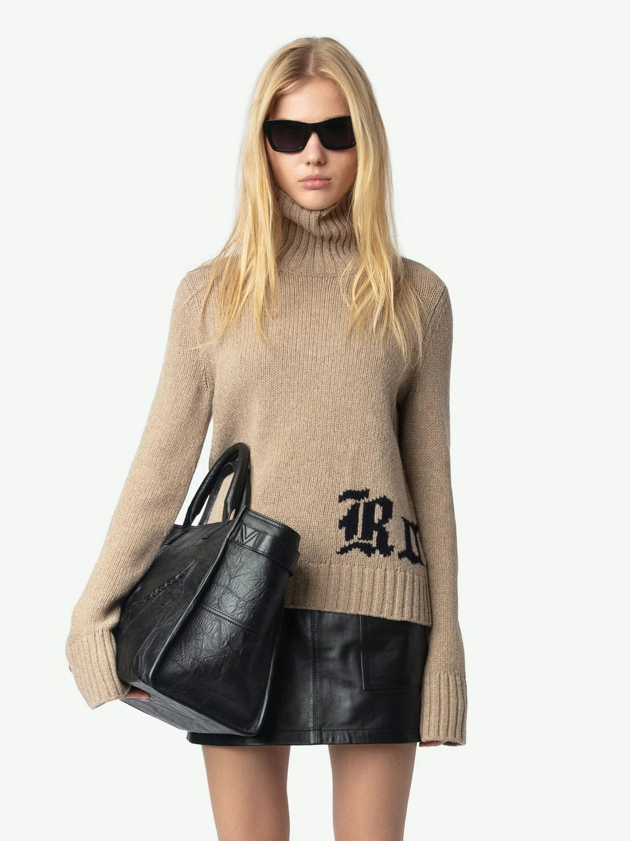 Jersey en 100% lana merino marrón claro con cuello alto e inscripción «Rock».