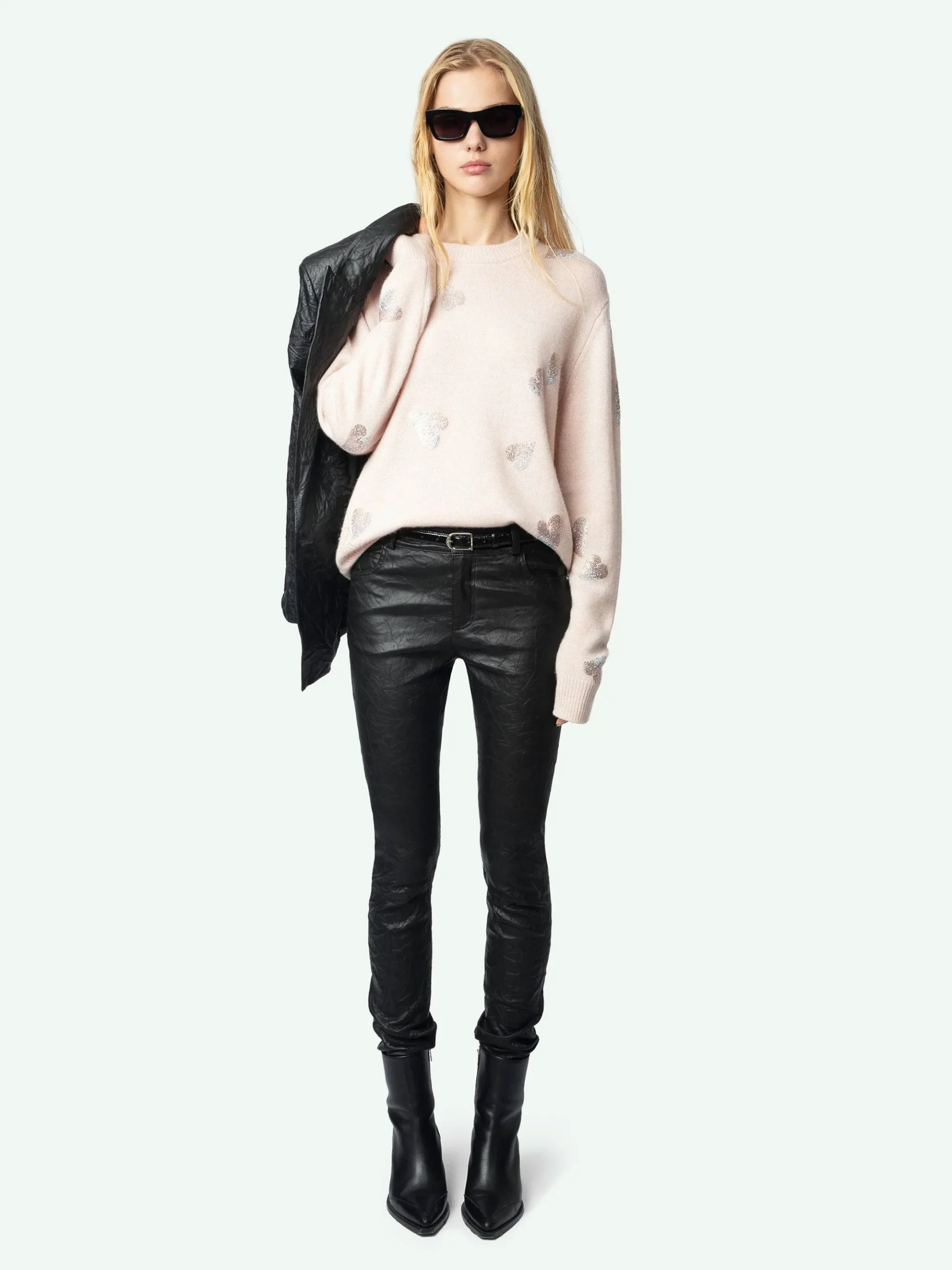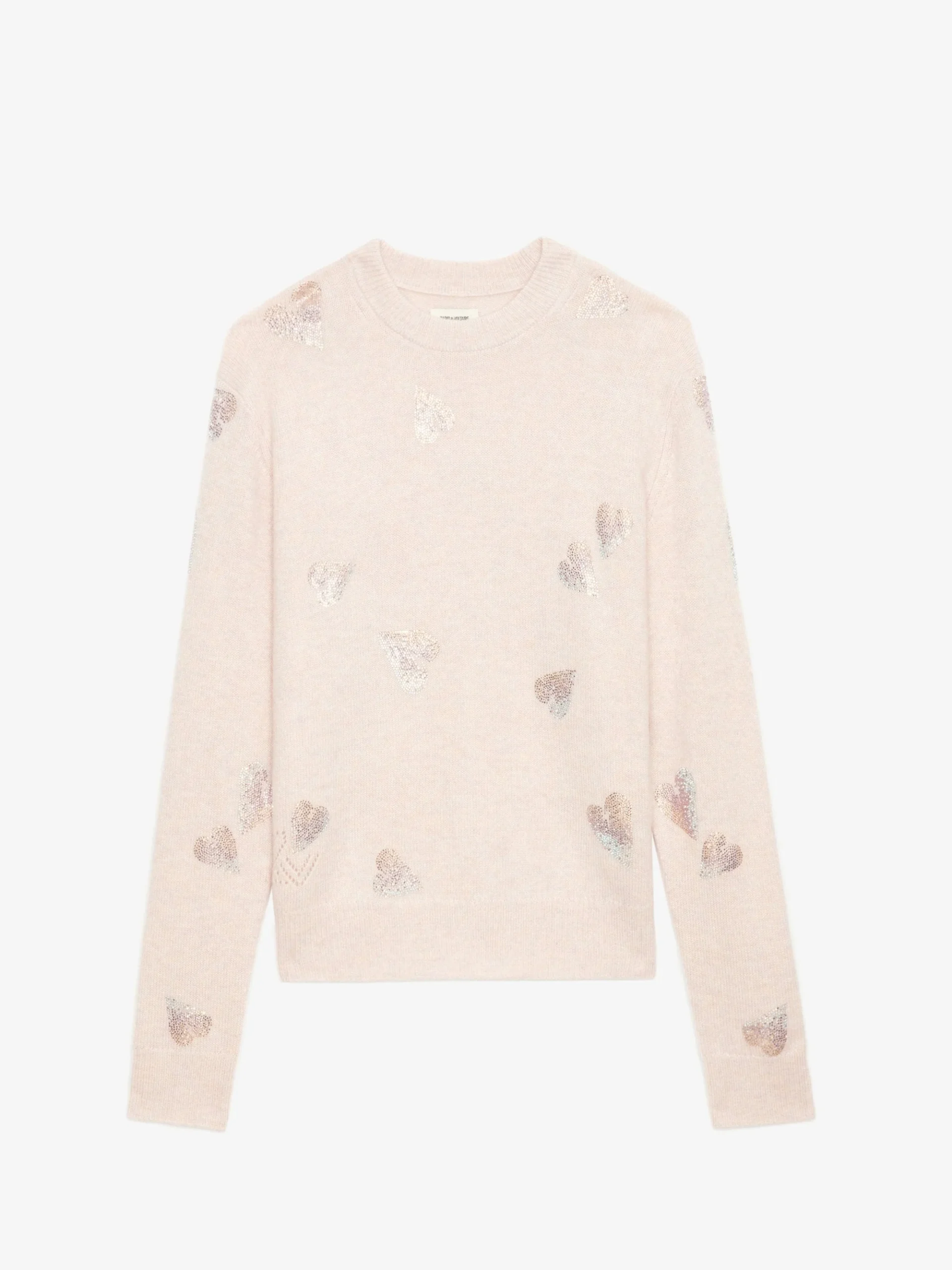 Jersey de 100% cachemir rosa claro con mangas largas y corazones adornados con cristales.