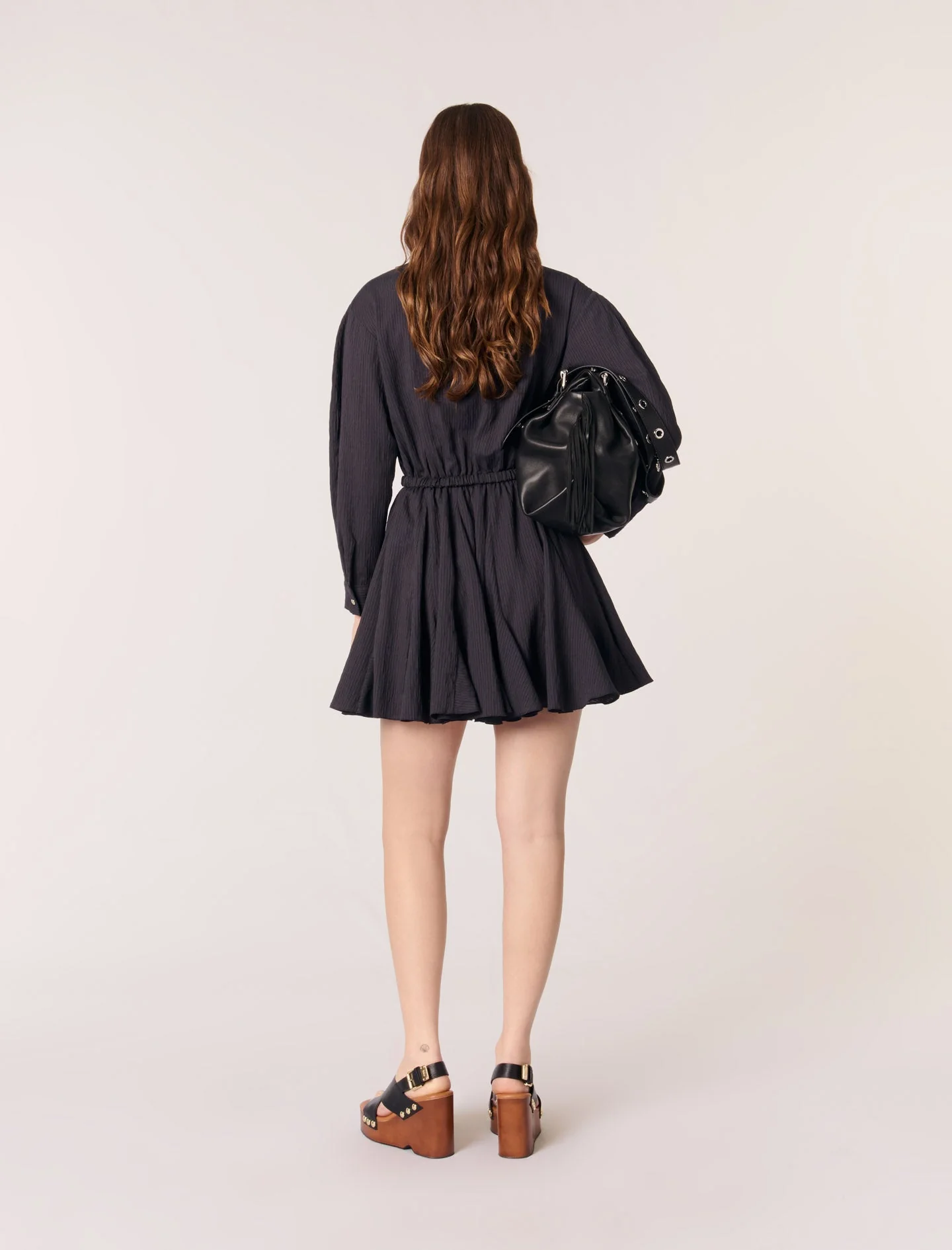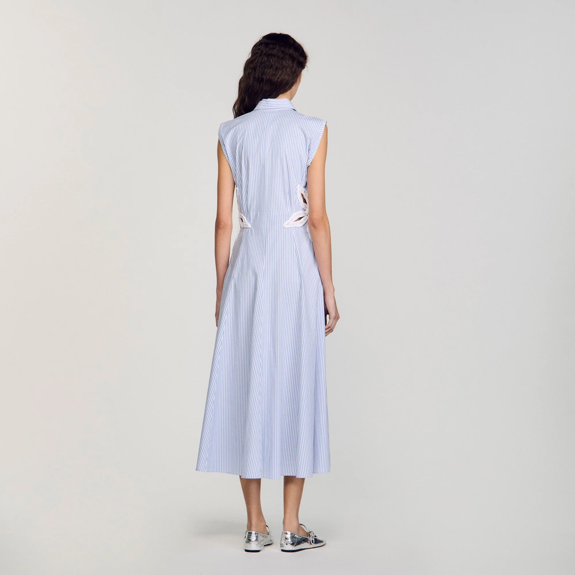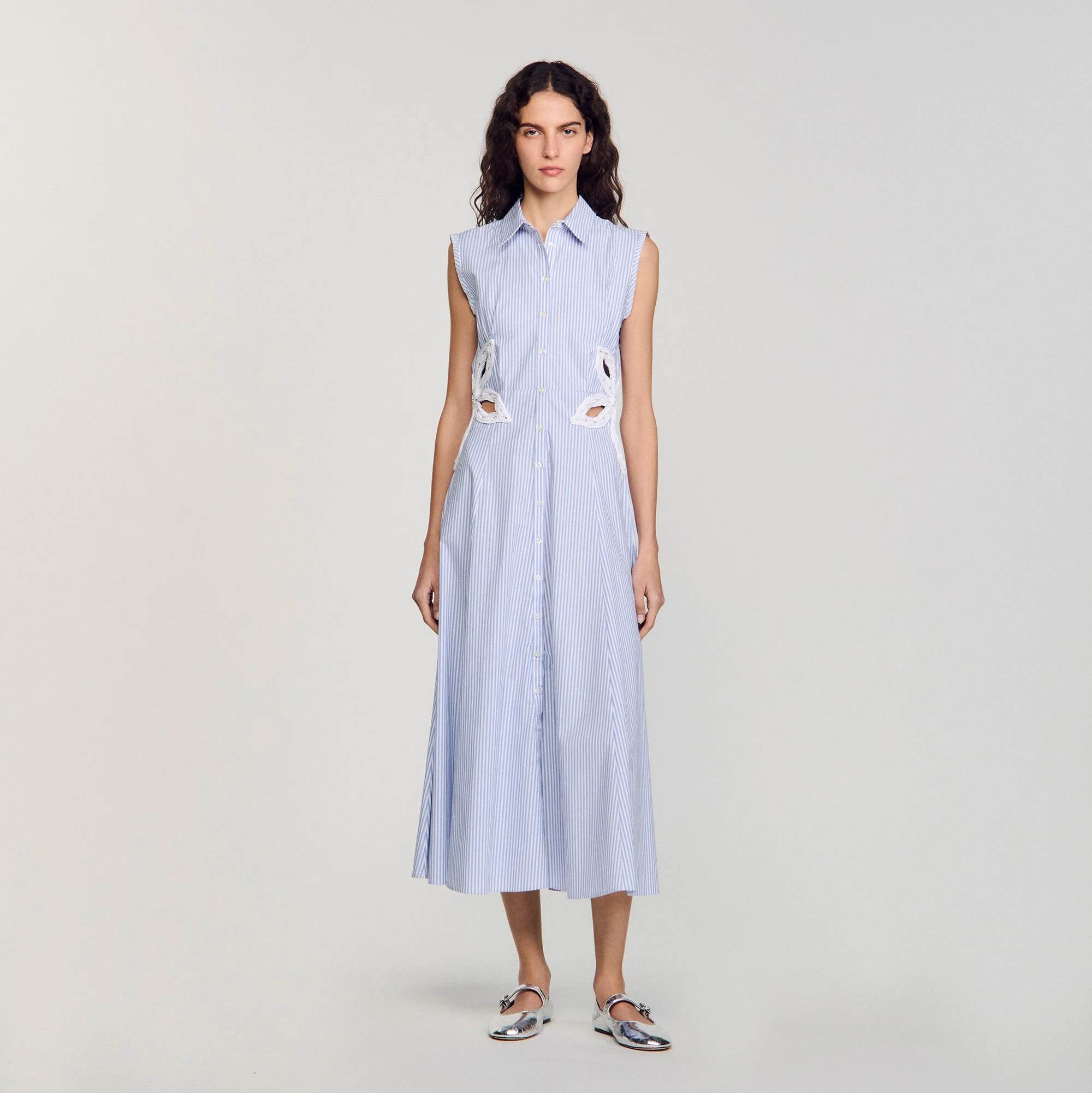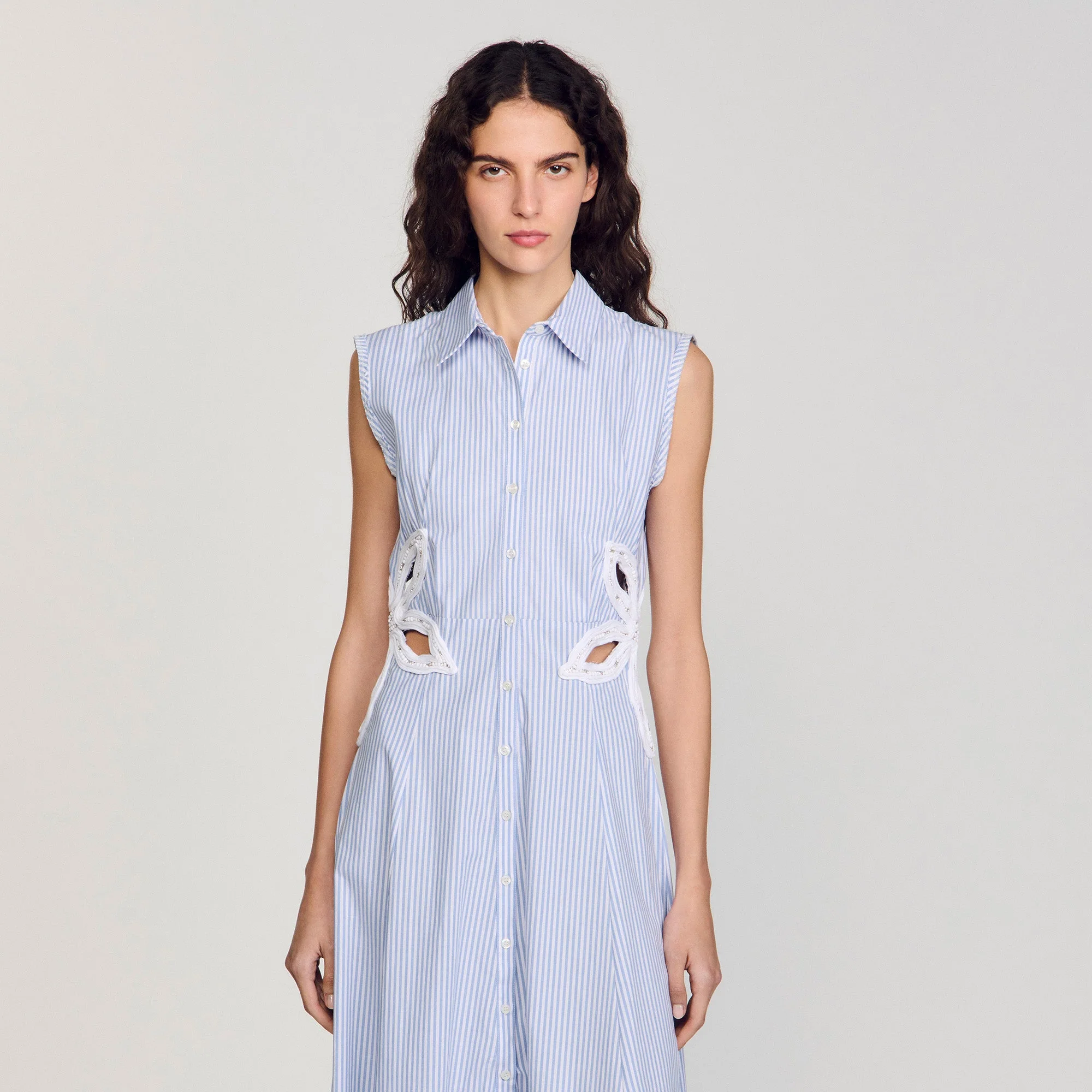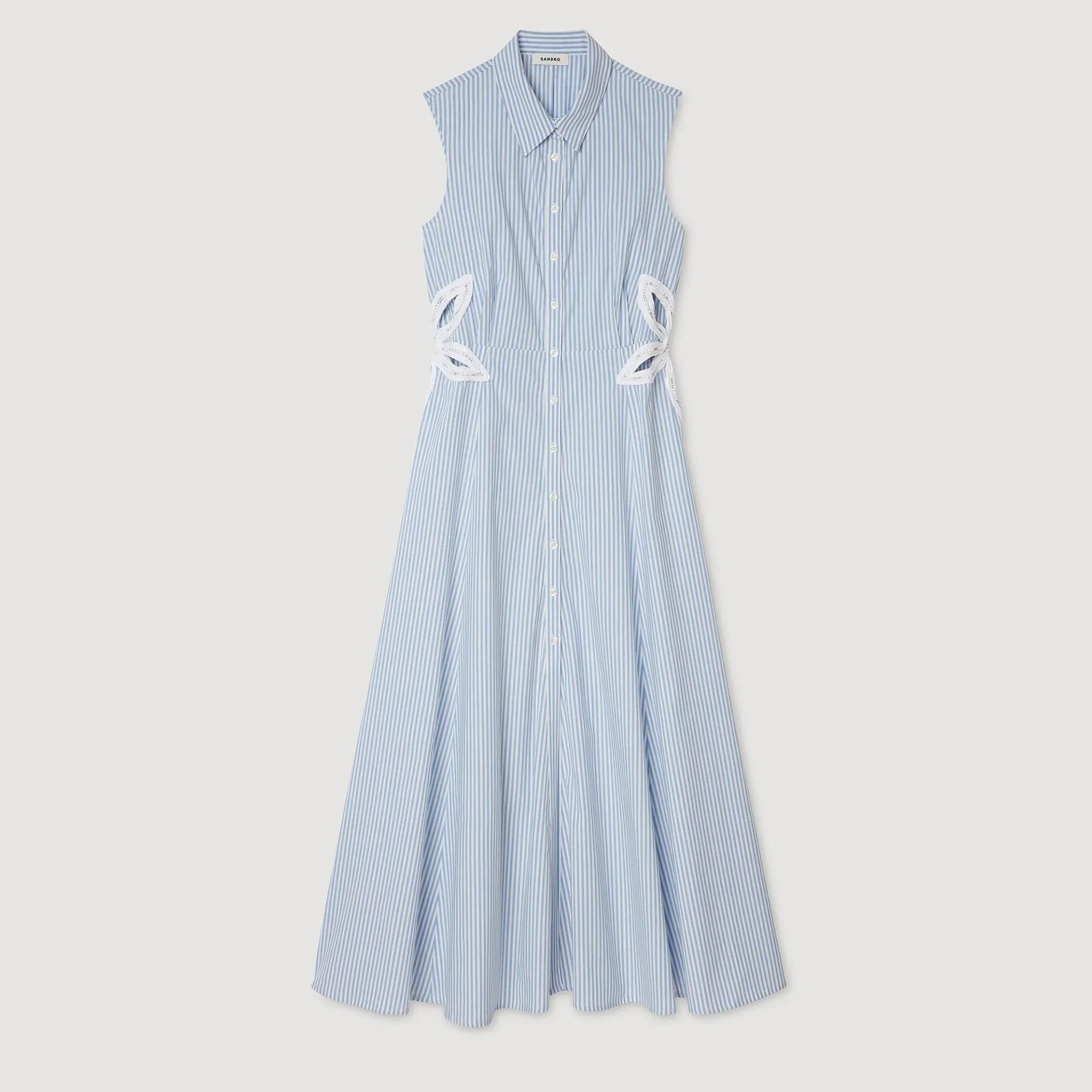 Vestido largo a rayas sin mangas con cuello camisero y tapeta de botones, adornado con apliques florales bordados con strass y perlas.