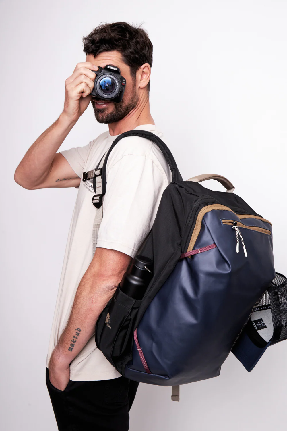 Incluye daisy chains frontales para enganchar tus cosas, bolsillo elasticado para tu botella, bolsillo secreto para el pasaporte y cinta trasera para engancharla a tu maleta.