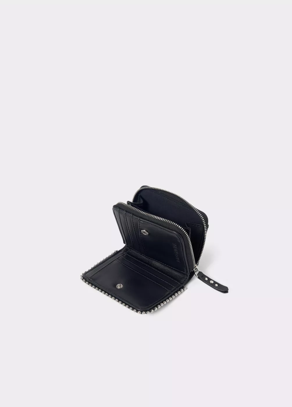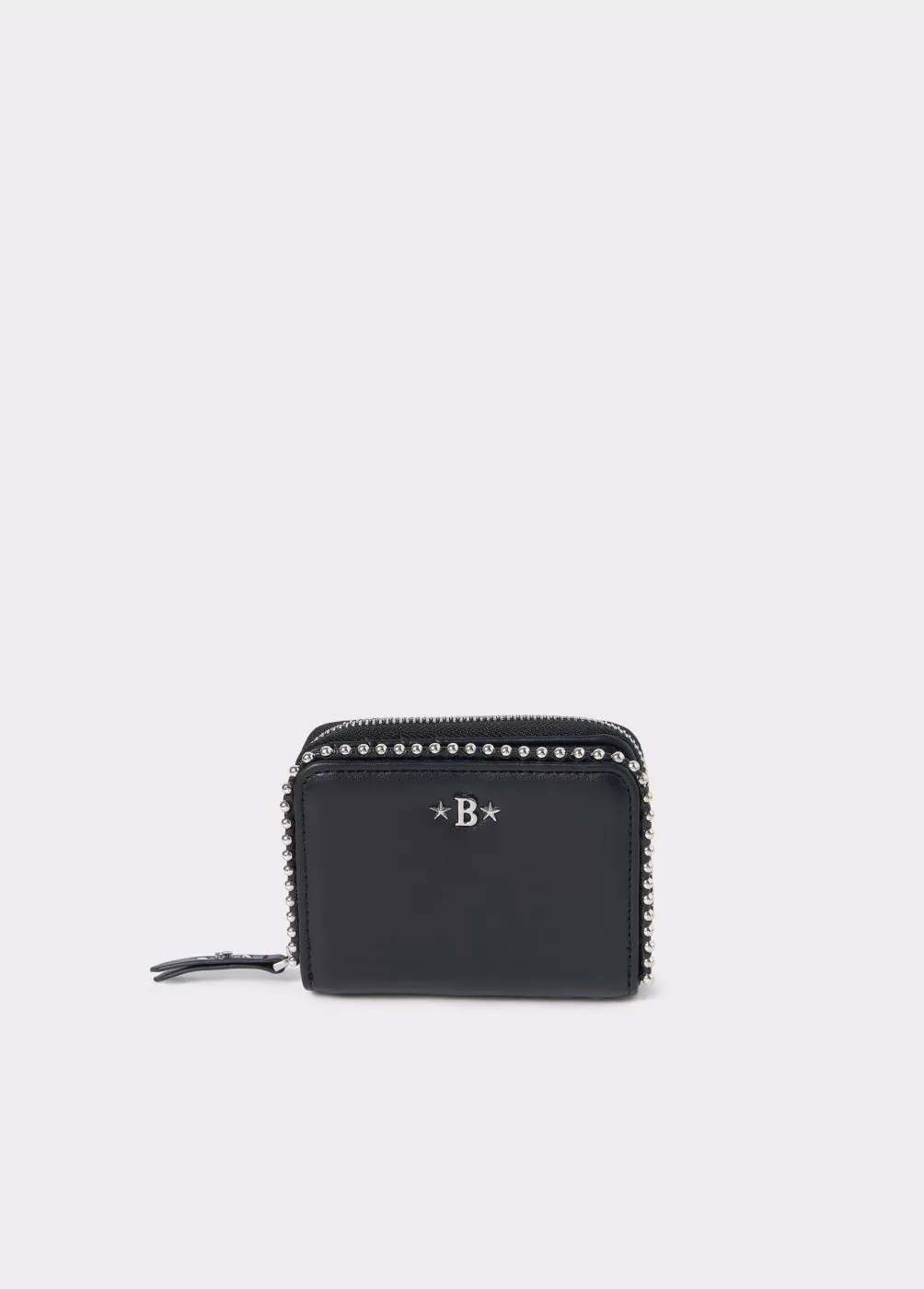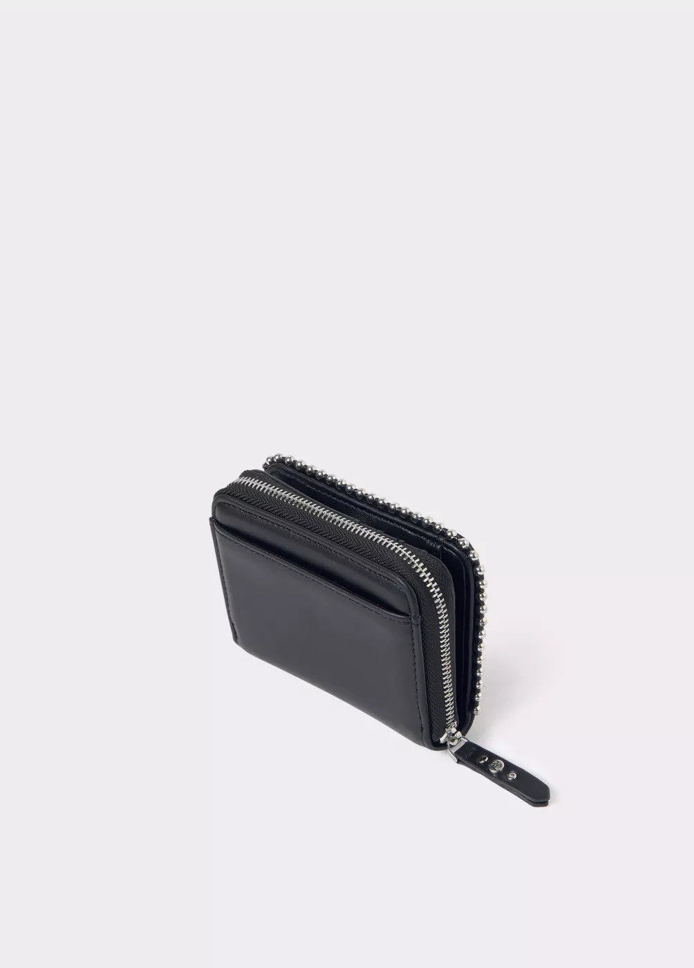 Monedero redondeado en color negro liso con bolitas y cremallera para guardar monedas.
