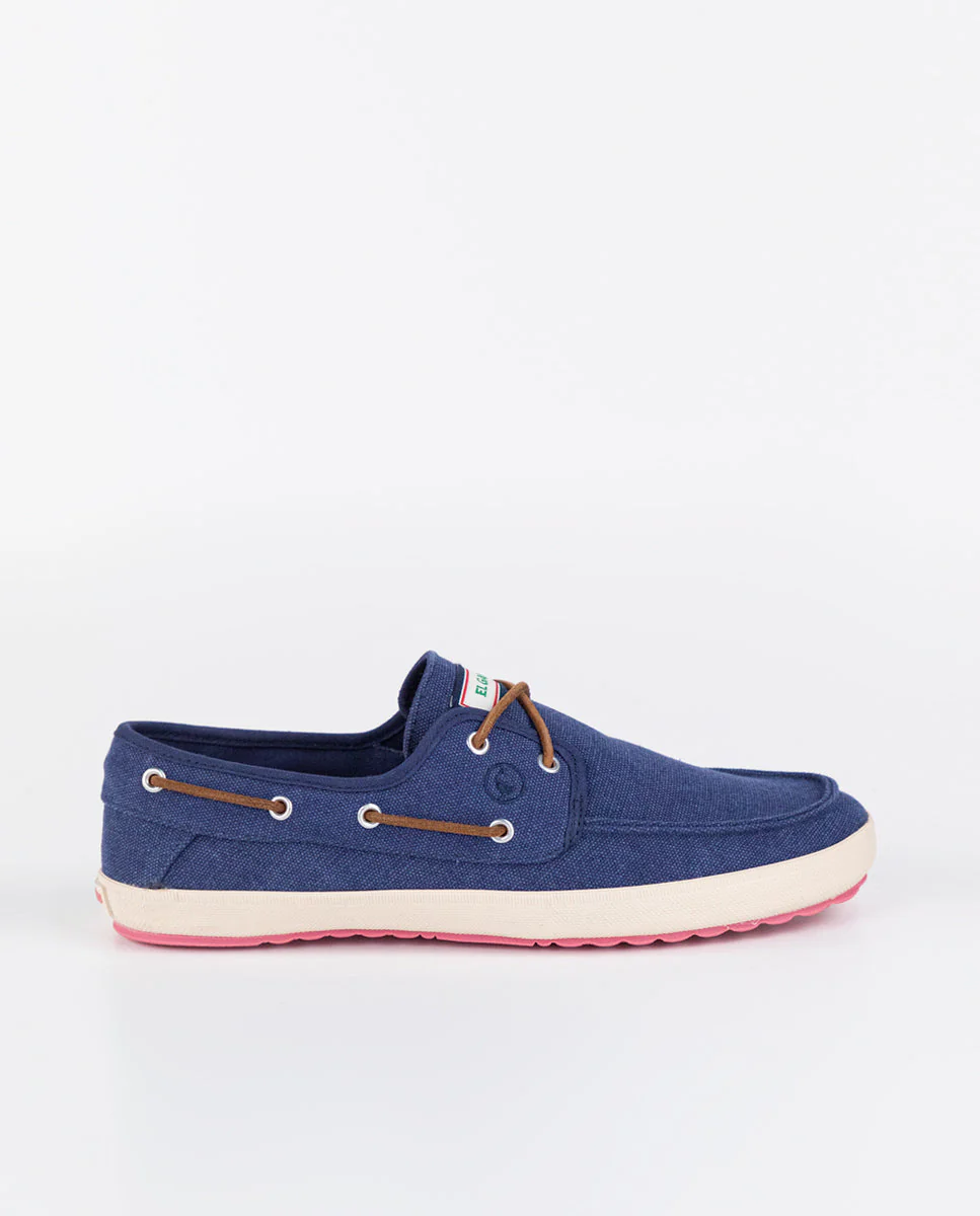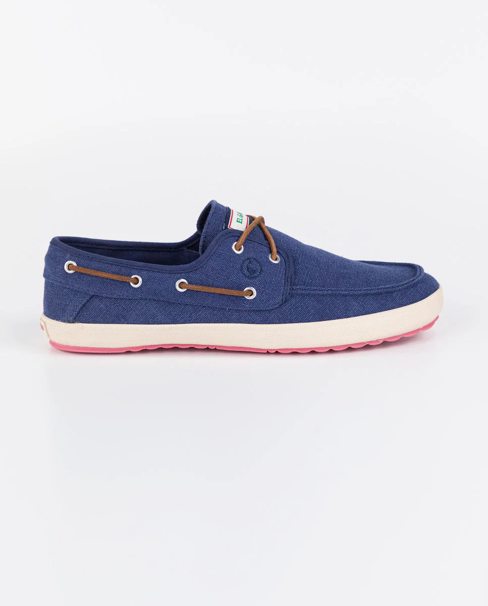 Náutico de hombre confeccionado en 100% algodón canvas lavado. Suela de goma vulcanizada de origen natural de color blanco, y planta de suela a contraste. Cordones de cuero y detalle de logo bordado en el perfil. Forro interior de algodón. Plantilla de alta confortabilidad.