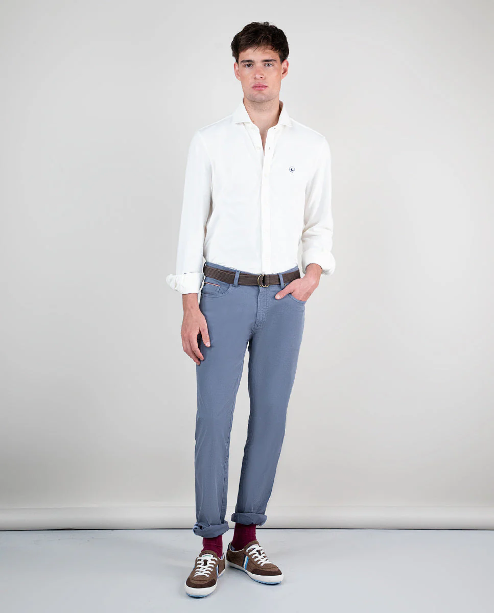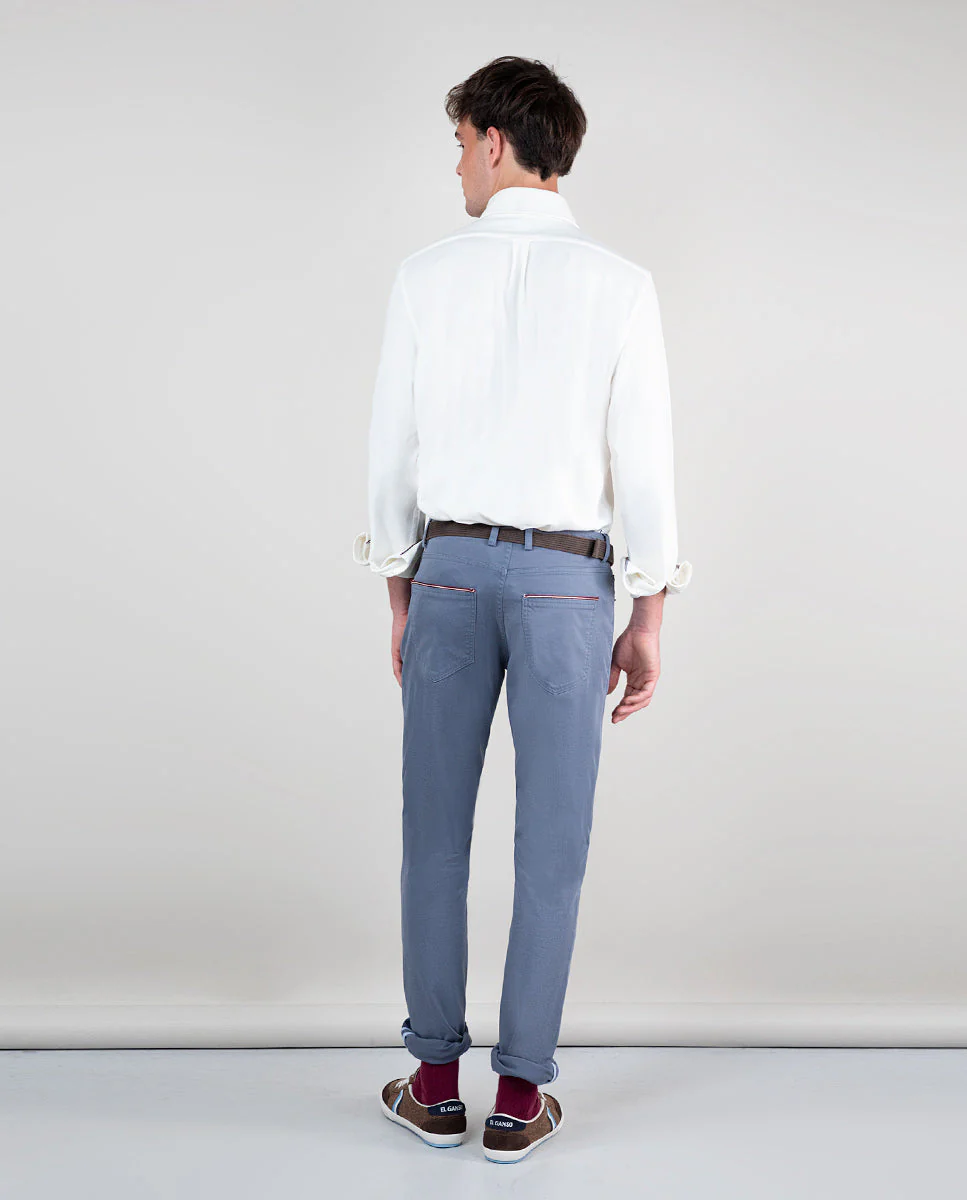 Pantalón 5 bolsillos de hombre confeccionado en tejido de sarga con 77% algodón, 20% de algodón reciclado y 3% elastano que aporta un mayor confort y un fit más cómodo. Tiene un lavado especial que dota a la prenda de una imagen auténtica y vintage. Corte slim fit, tiro medio y cierre mediante cremallera oculta por tapeta y botón. Cinco bolsillos y trabillas. Lleva como detalle una cinta corbatera de 3mm en bolsillos traseros, interior de bajo y bolsillo cerillero. Incluye cinturón de canvas.