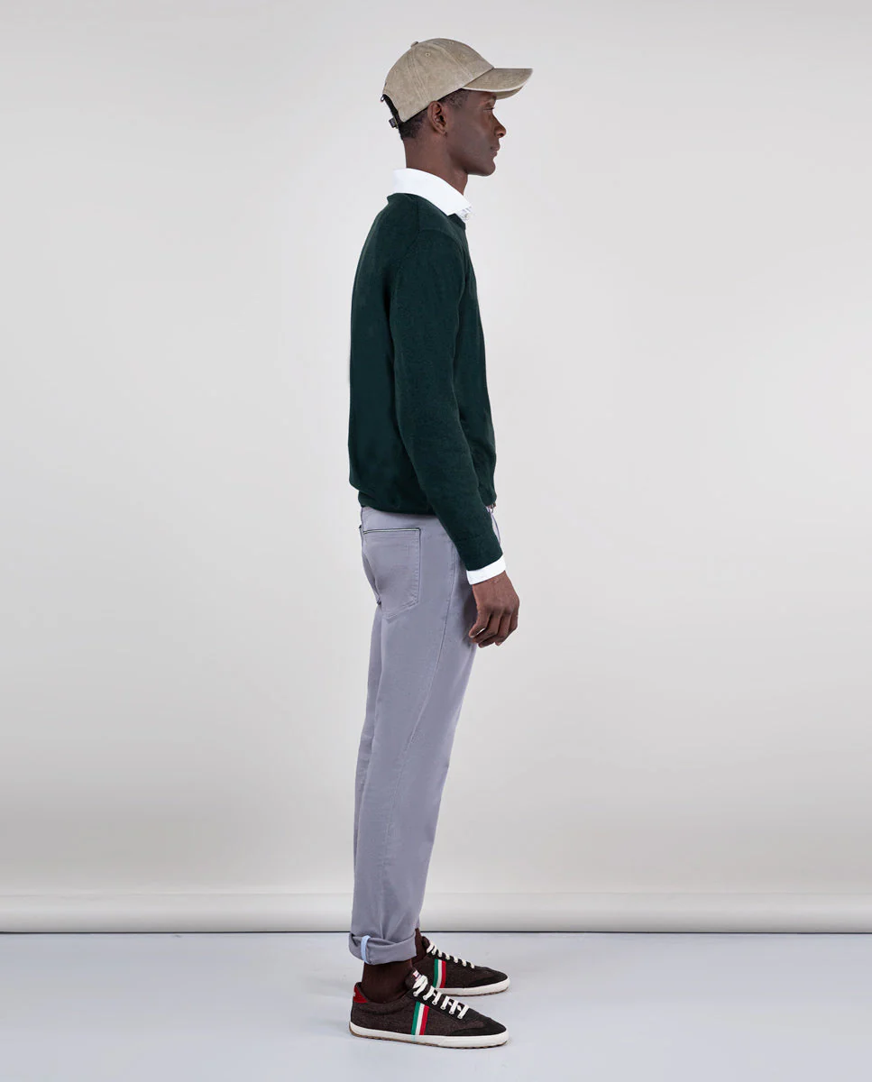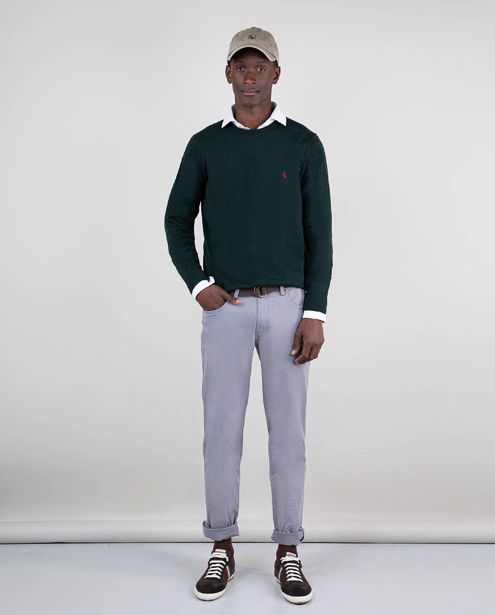 Pantalón 5 bolsillos de hombre confeccionado en tejido de sarga con 77% algodón, 20% de algodón reciclado y 3% elastano que aporta un mayor confort y un fit más cómodo. Tiene un lavado especial que dota a la prenda de una imagen auténtica y vintage. Corte slim fit, tiro medio y cierre mediante cremallera oculta por tapeta y botón. Cinco bolsillos y trabillas. Lleva como detalle una cinta corbatera de 3mm en bolsillos traseros, interior de bajo y bolsillo cerillero. Incluye cinturón de canvas.
