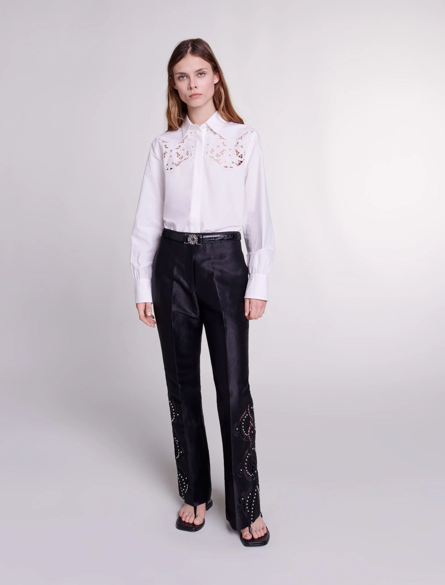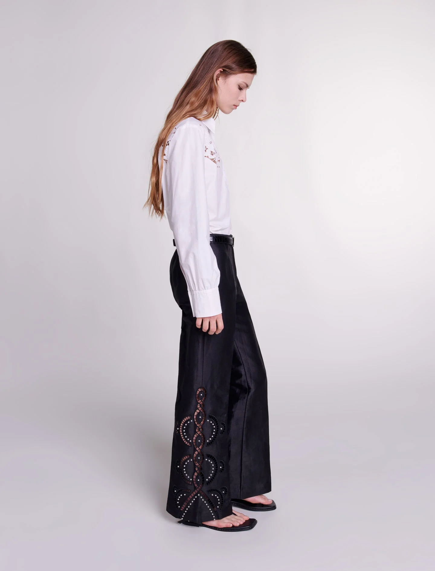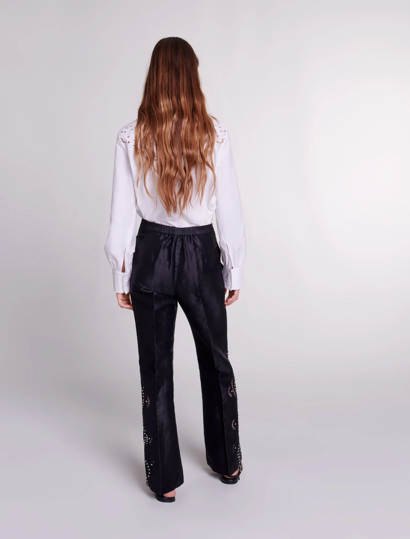 Para la nueva colección, las prendas icónicas se renuevan audazmente para crear un vestuario de elementos esenciales con un estilo atemporal.Este pantalón de lino, impregnado de ligereza y audacia, desvela una silueta estructurada realmente elegante. Dotado de un cierre de cremallera con corchete y de una parte trasera con elástico, luce un bajo acampanado aderezado con detalles calados y bordados, y realzados con remaches plateados.Ref.: MFPPA00579