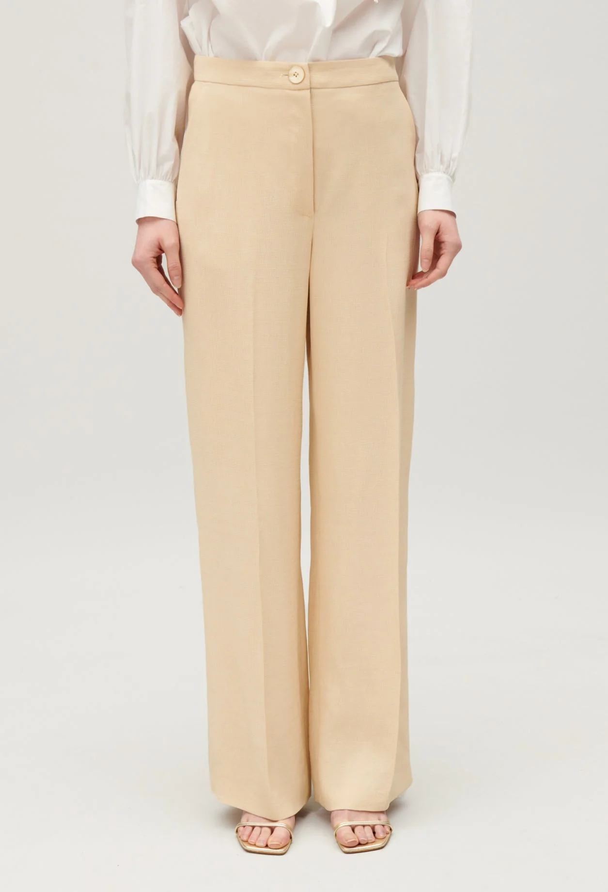 Pantalón de pierna ancha con tapeta de botones de presión en la cintura, cierre de cremallera y bolsillos laterales amplios.
