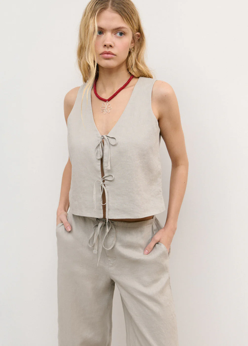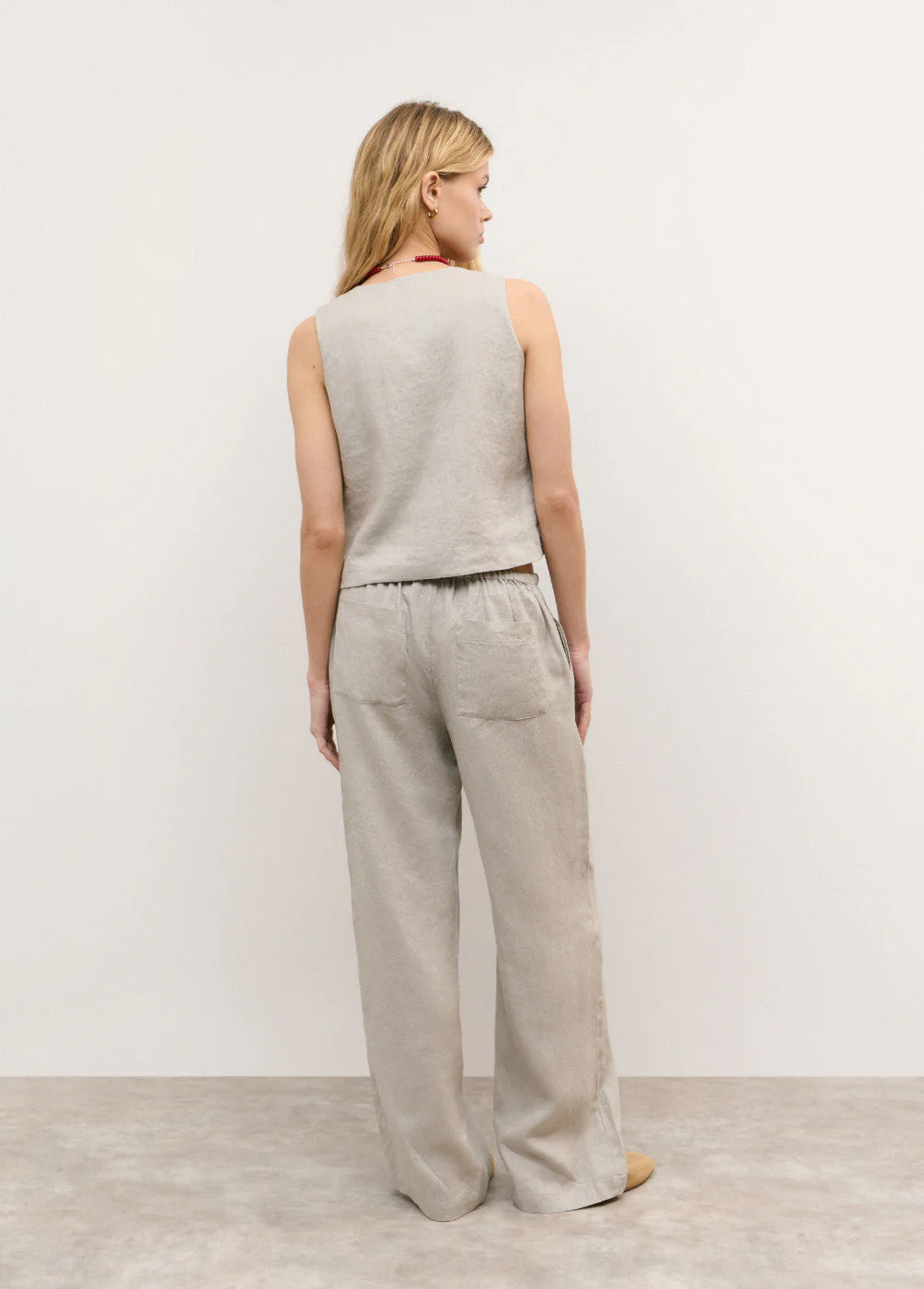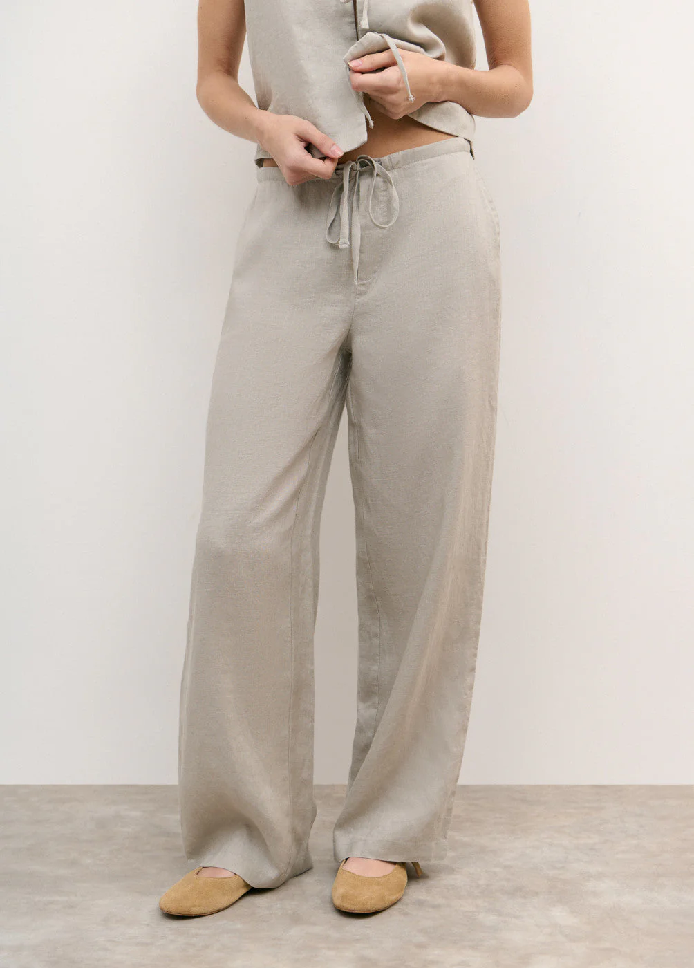 Pantalón bajo de lino con bolsillos y goma en la cintura con lazada.