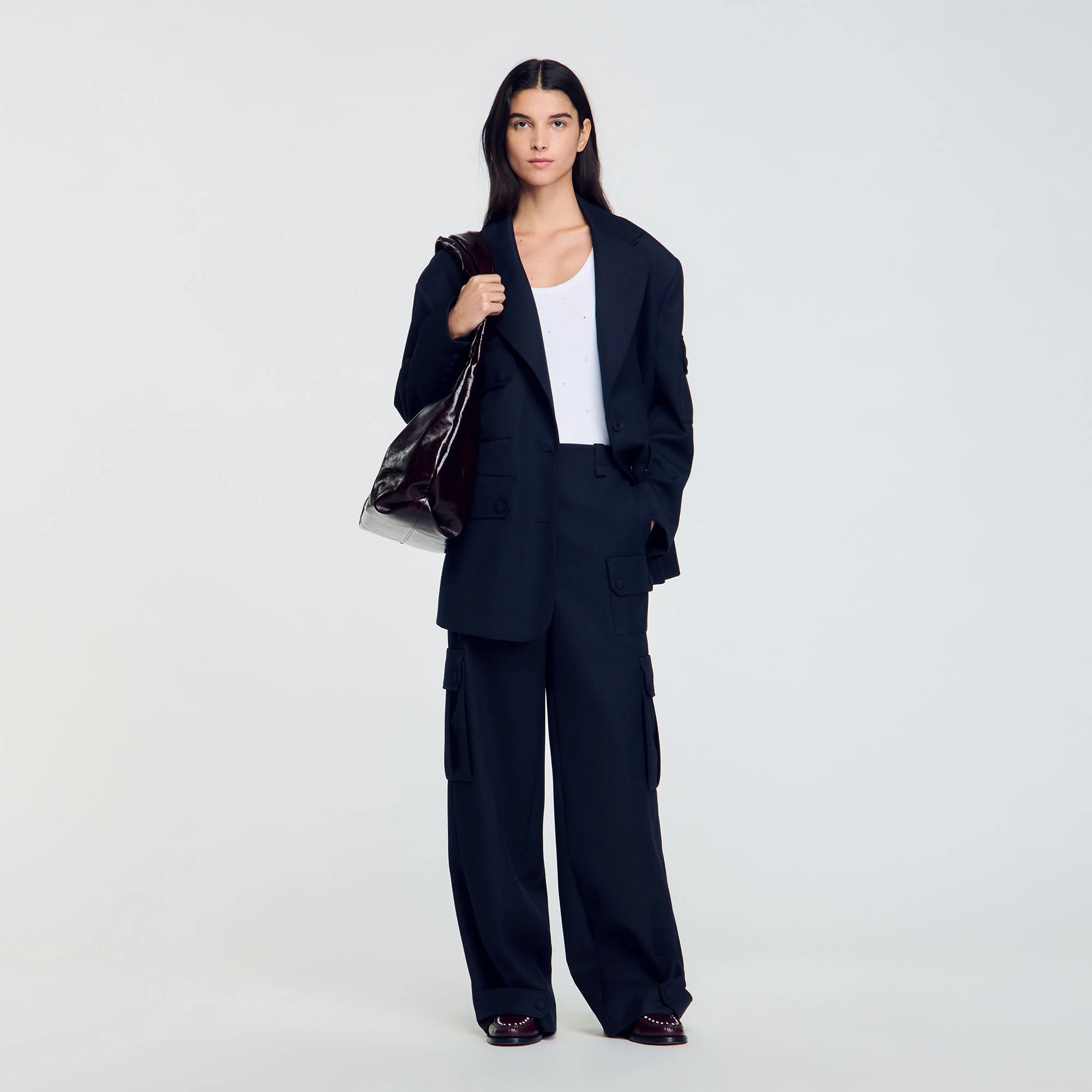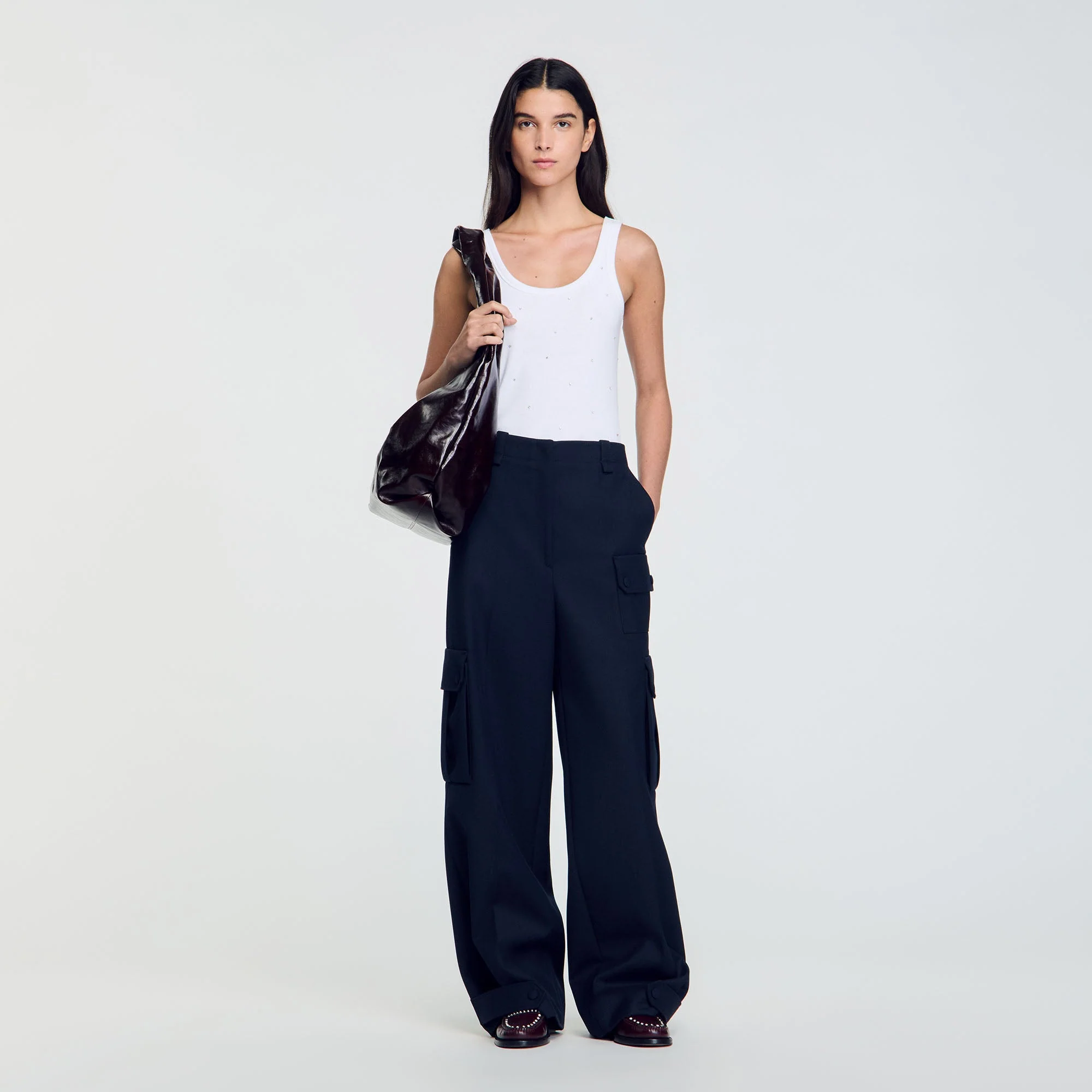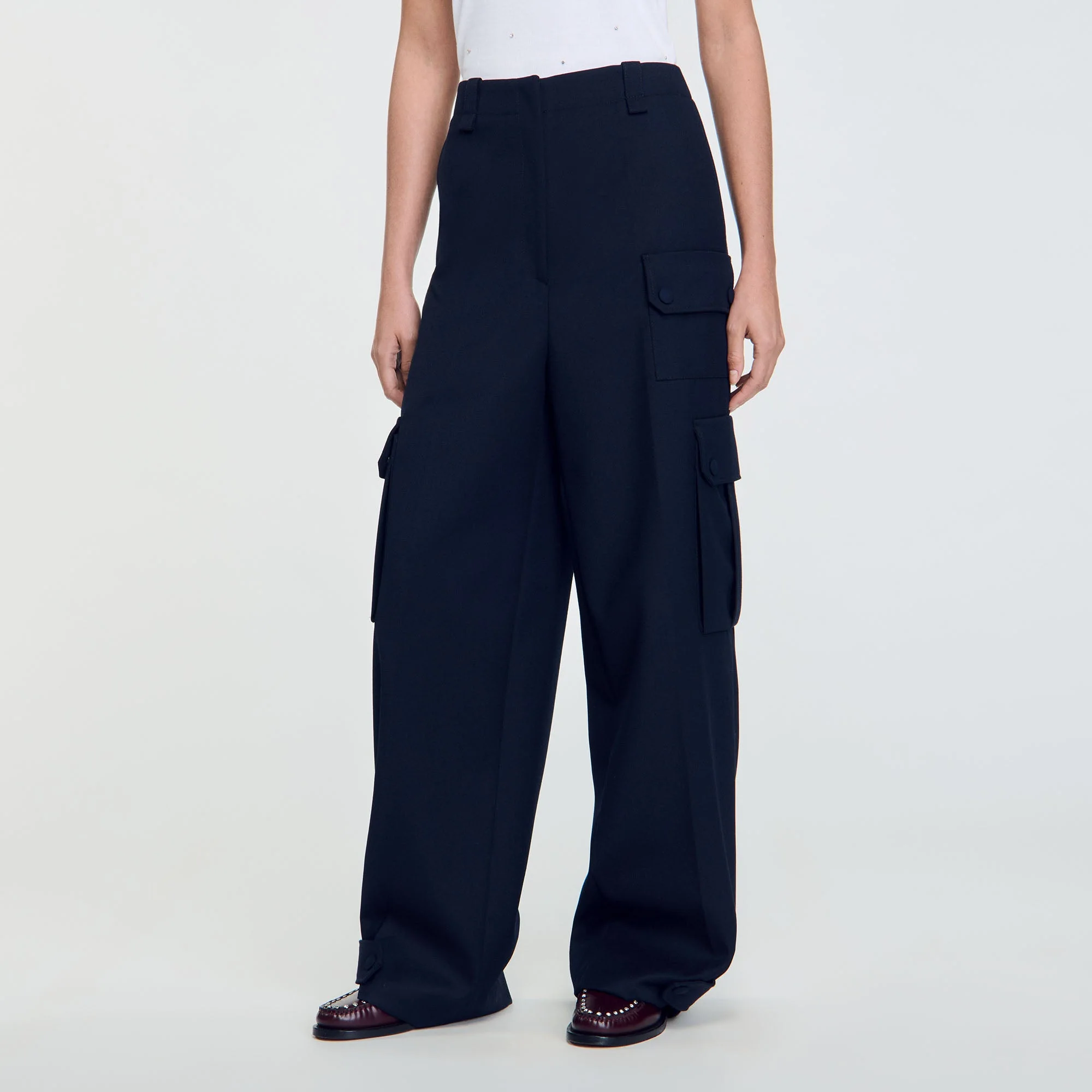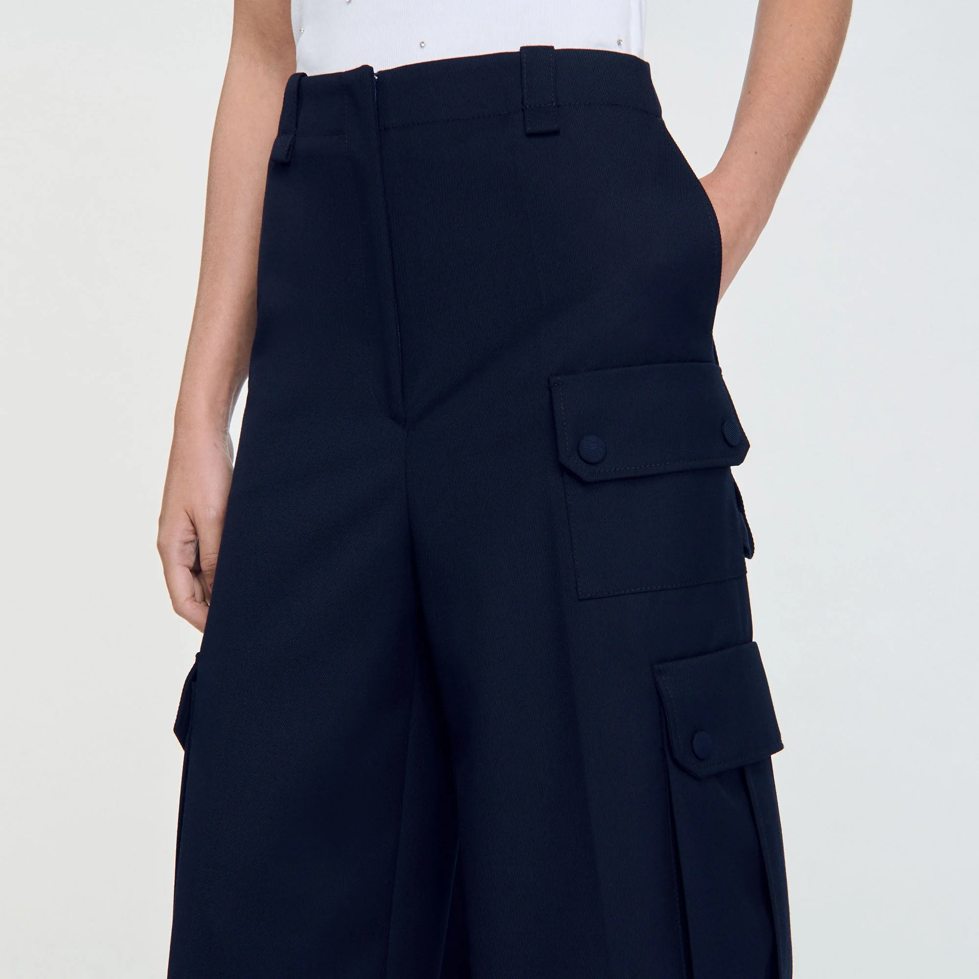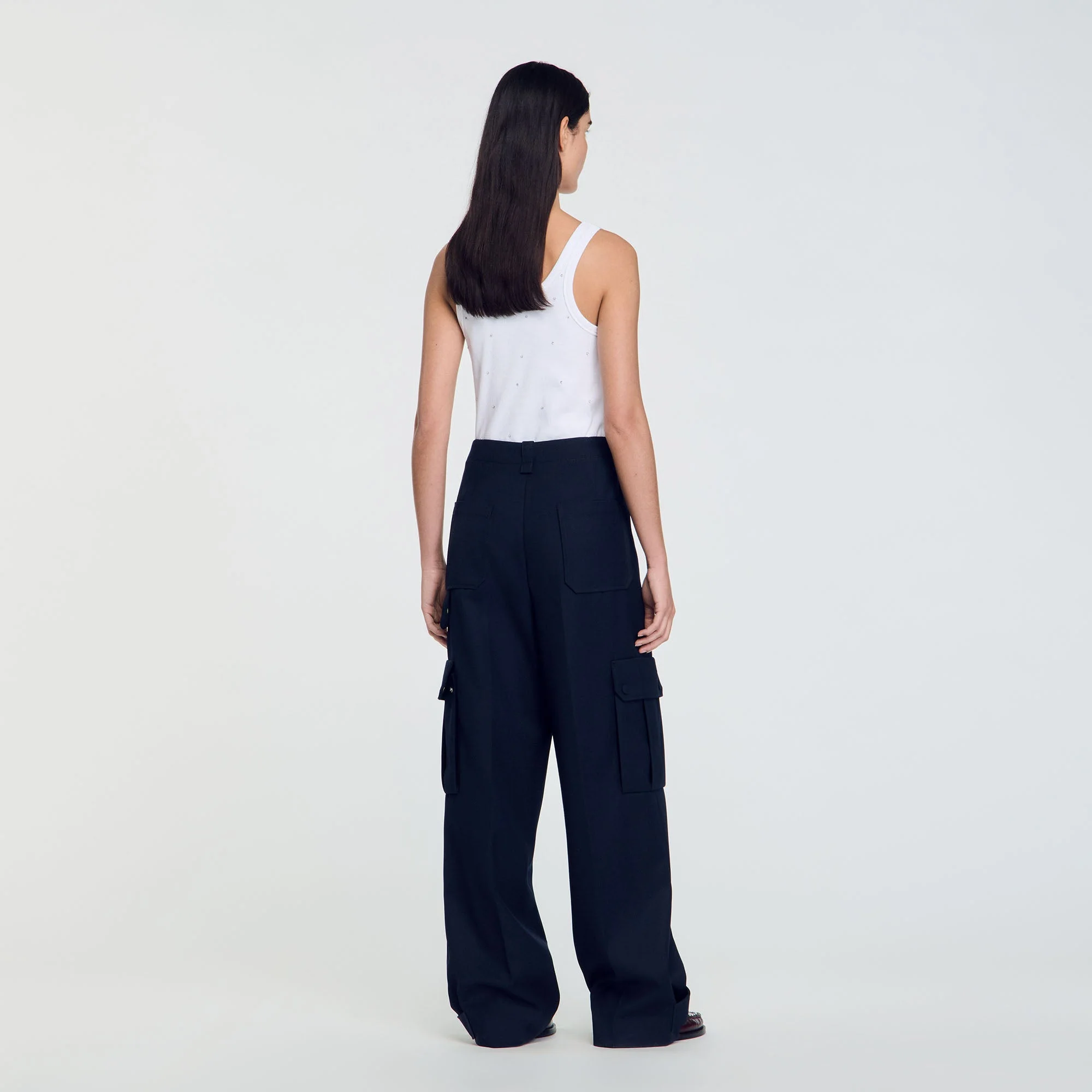 Pantalón cargo ancho con múltiples bolsillos laterales, trabillas en la cintura y raya marcada.