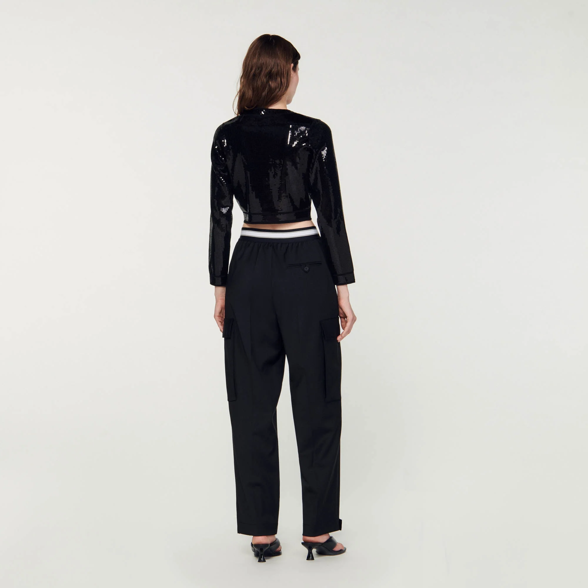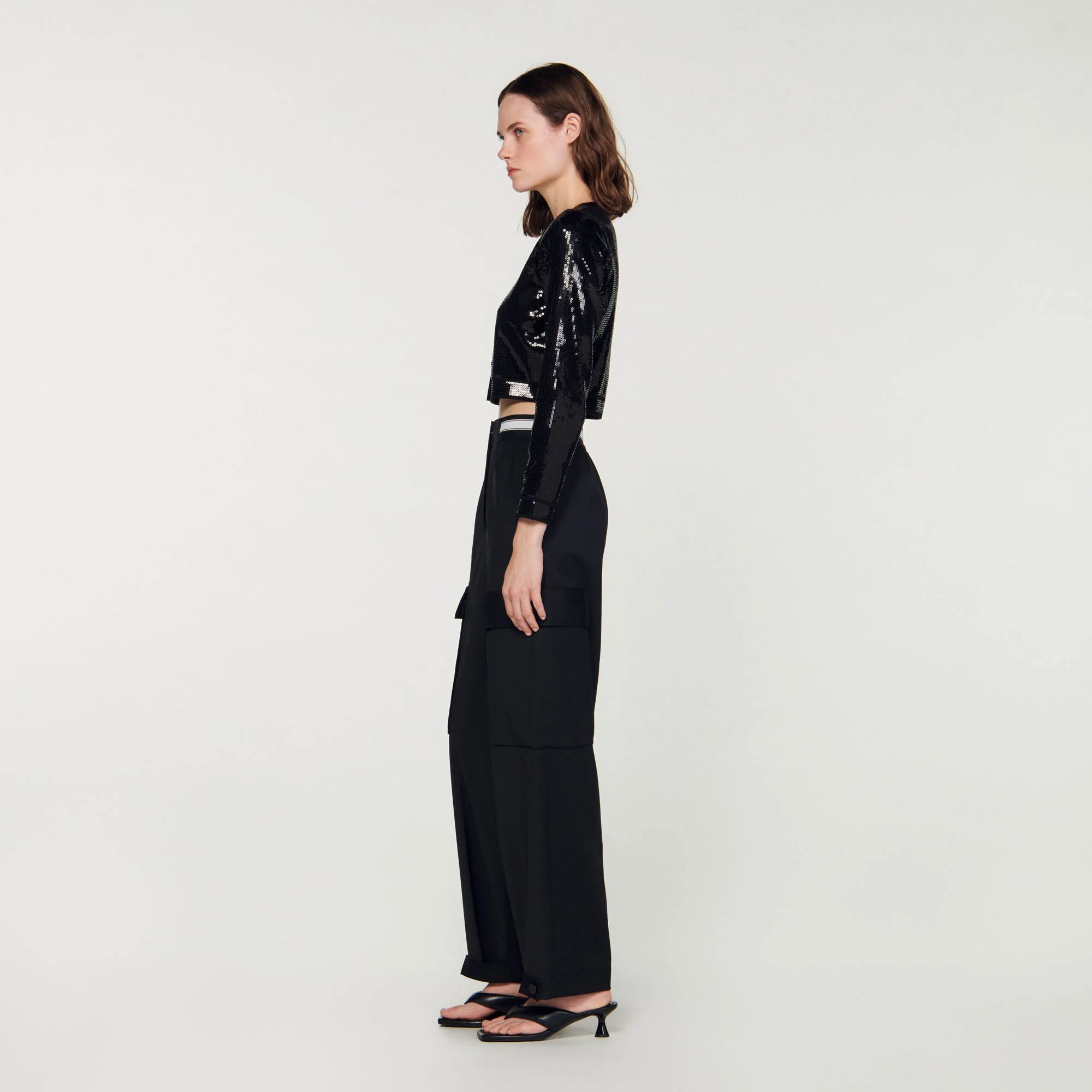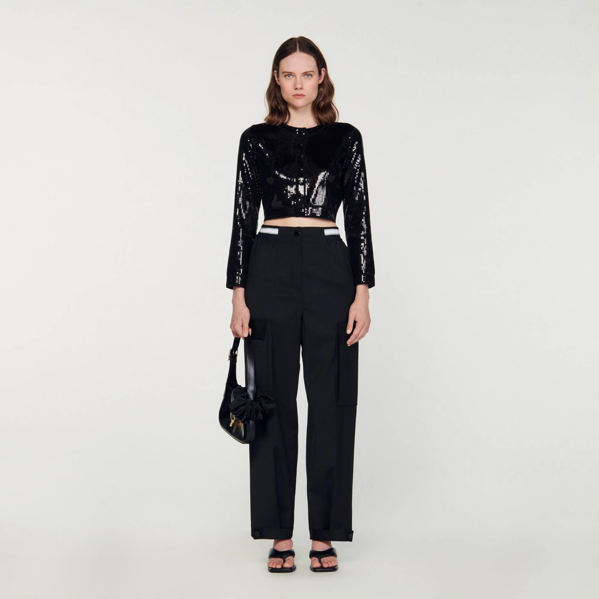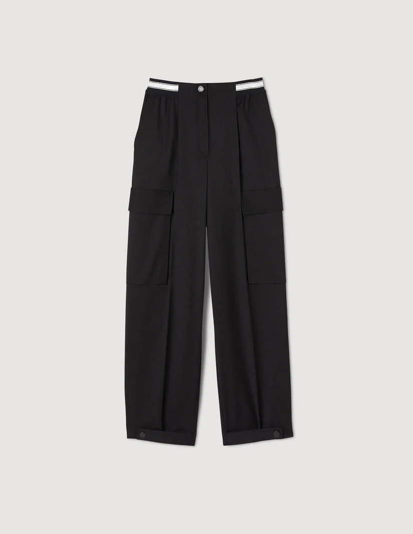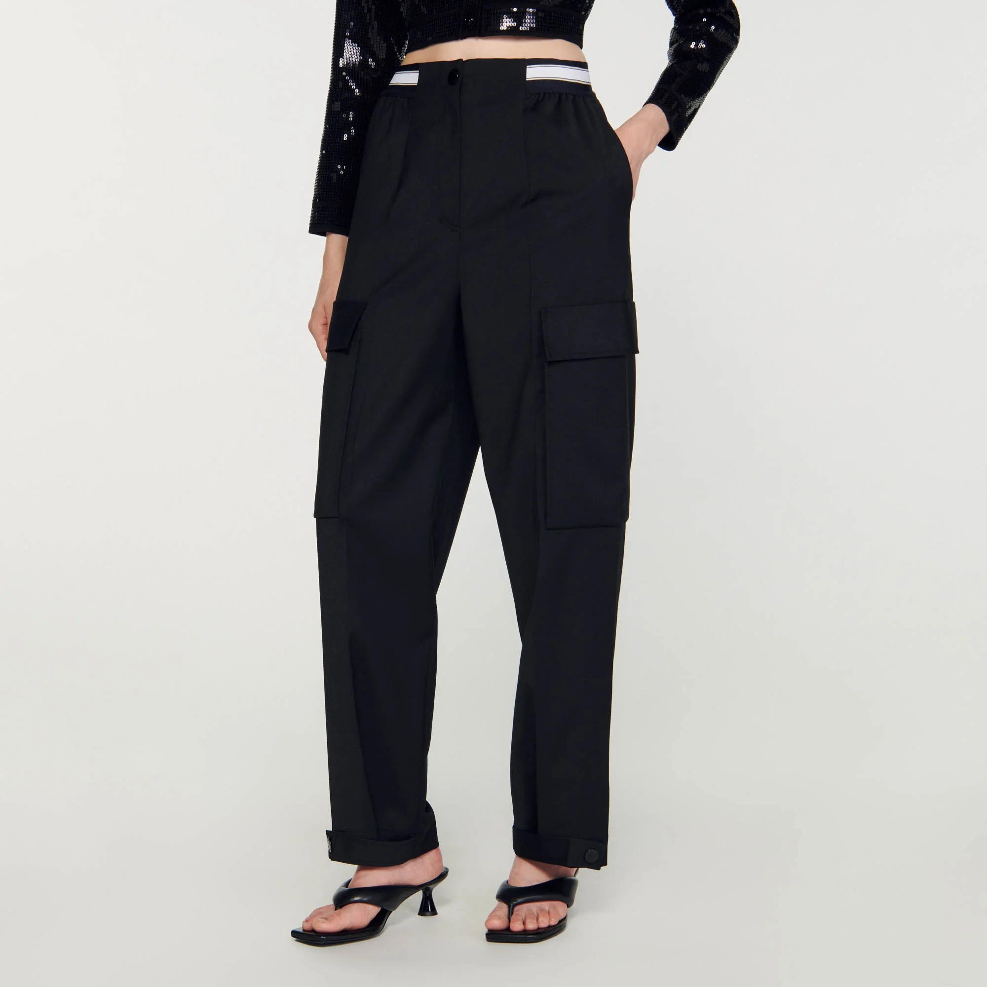 Pantalón cargo de corte ancho con cintura elástica en contraste con la firma SANDRO, frunces en la cintura y grandes bolsillos de parche con solapa en los laterales.