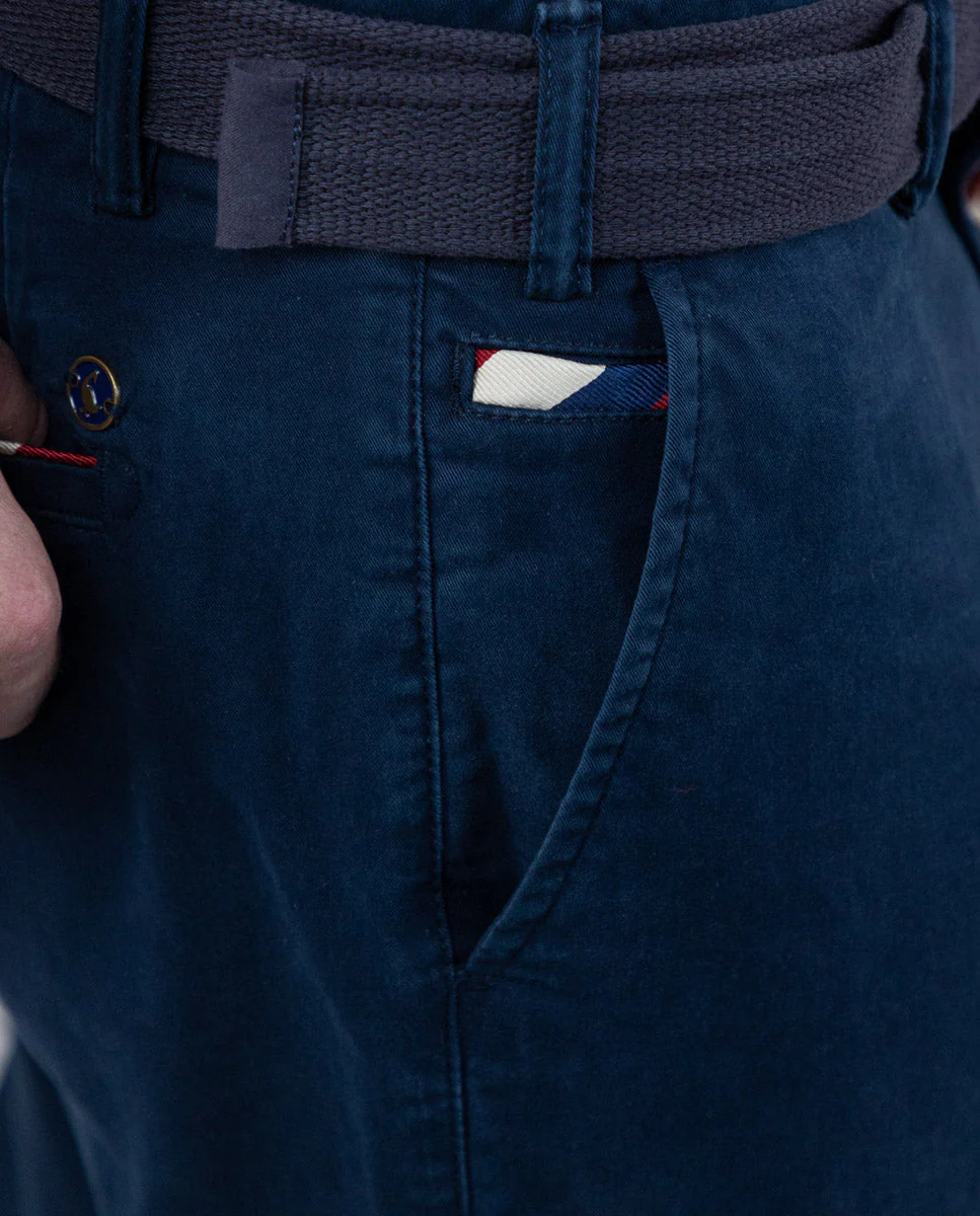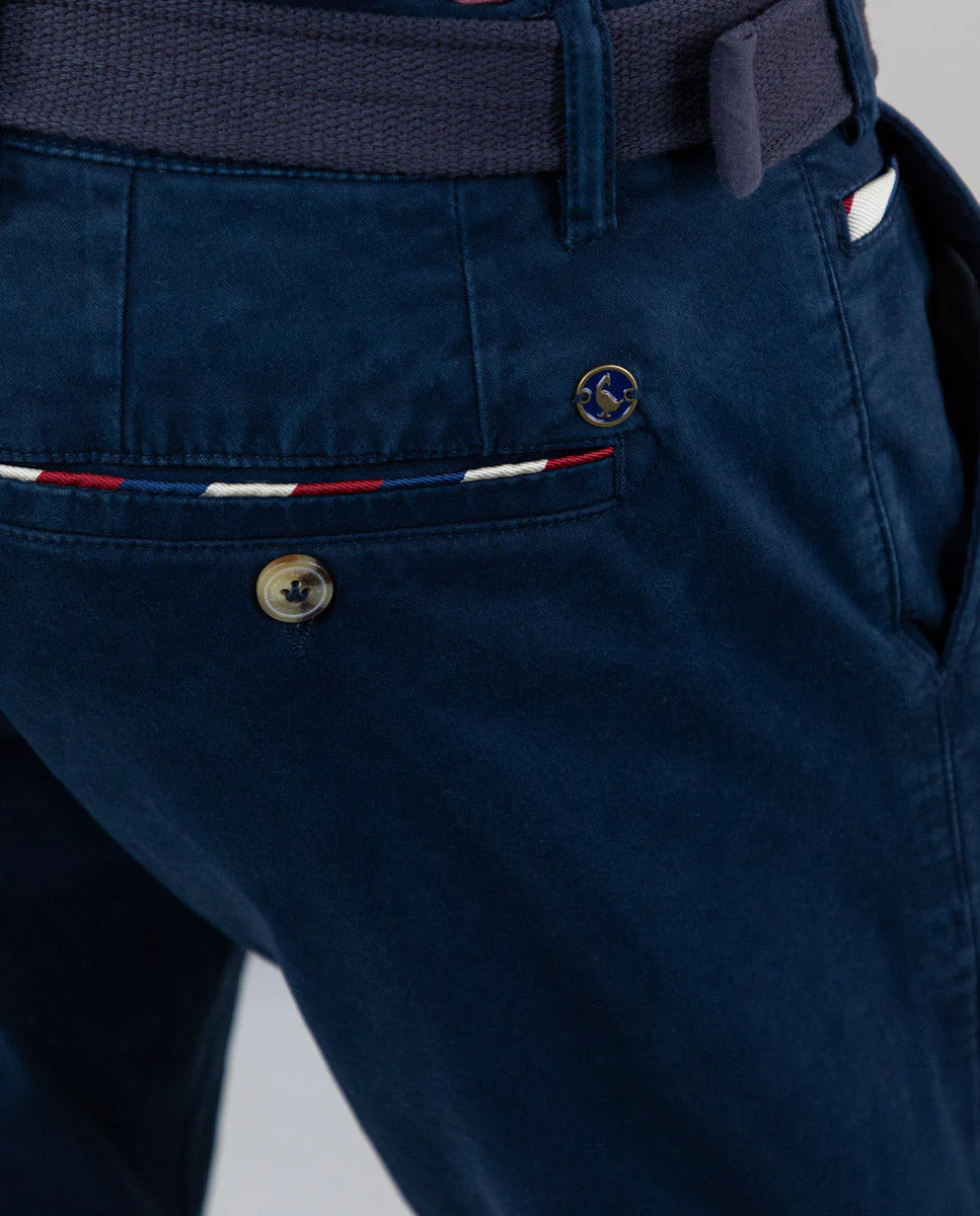 Pantalón chino de hombre confeccionado en tejido gabardina con 78% algodón, 20% de algodón reciclado y 2% elastano. Lleva un proceso de tintado que le da un aspecto desgastado. Corte Slim Fit, cierre mediante cremallera oculta por tapeta y botón. Tiene bolsillos delanteros y en los traseros lleva vivo en tejido principal con un piping a contraste. Lleva también como detalle en el bolsillo cerillero un piping. Tiene el chapón del logo cosido encima del bolsillo trasero. Incluye cinturón de canvas.