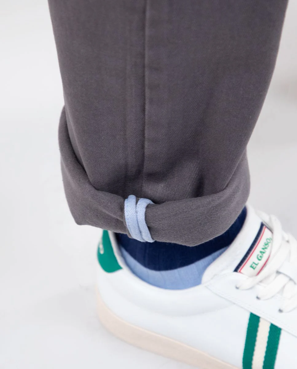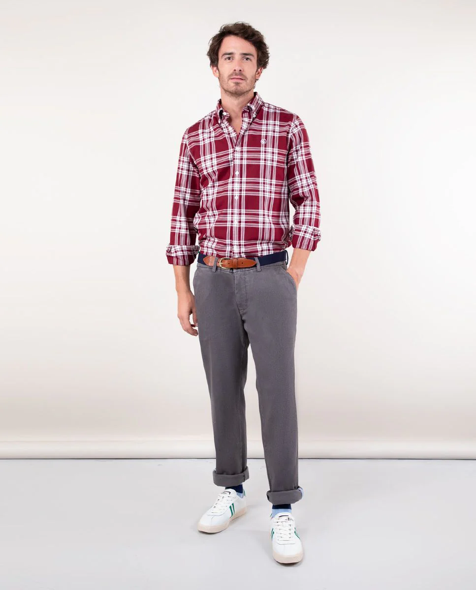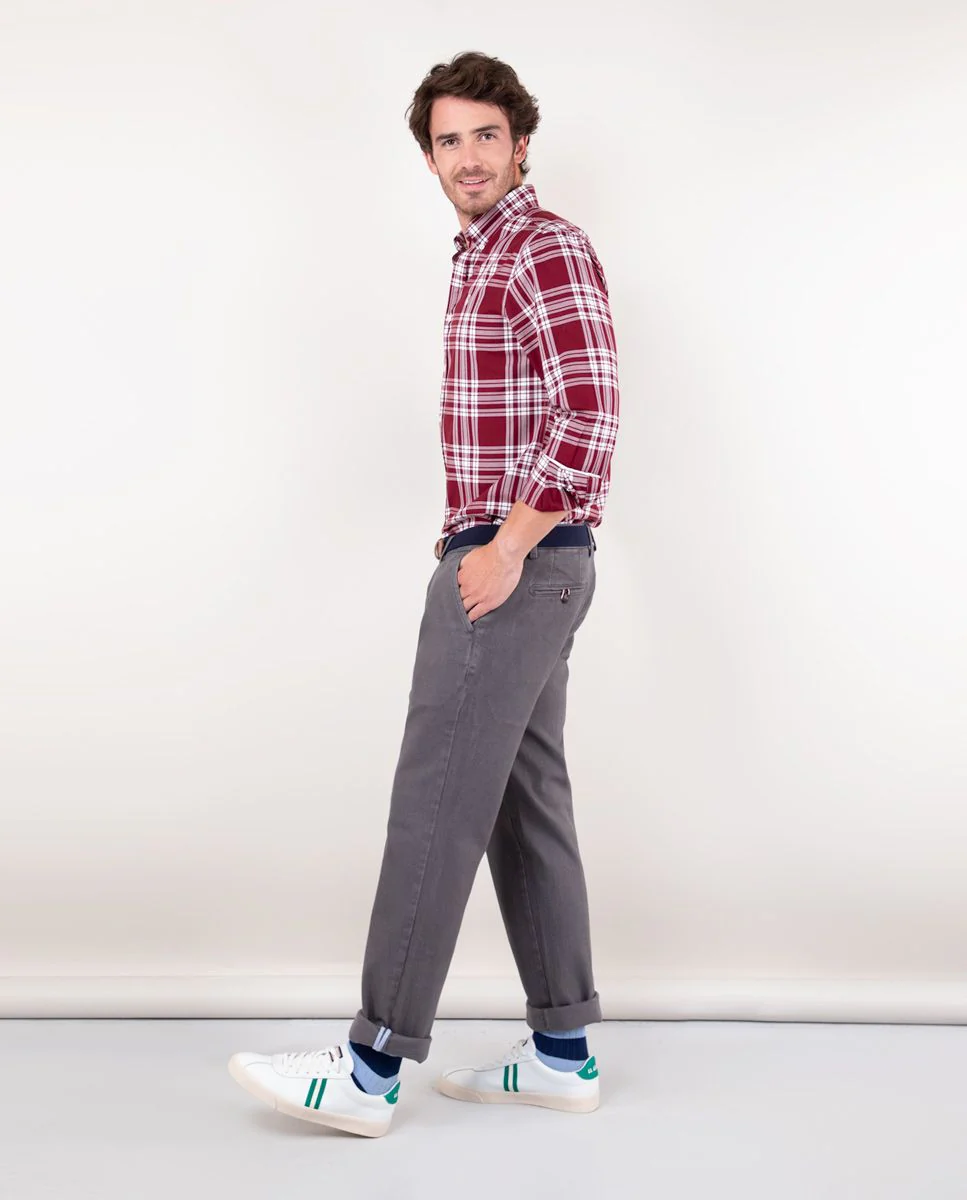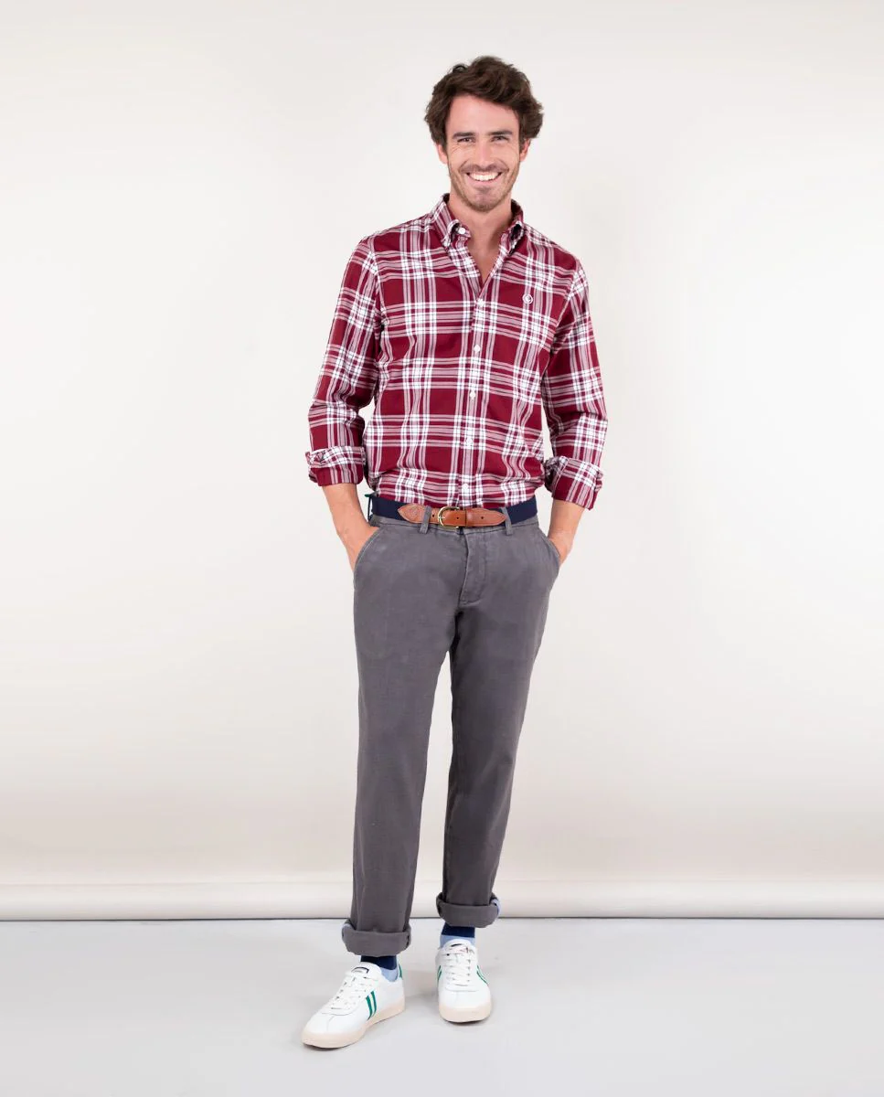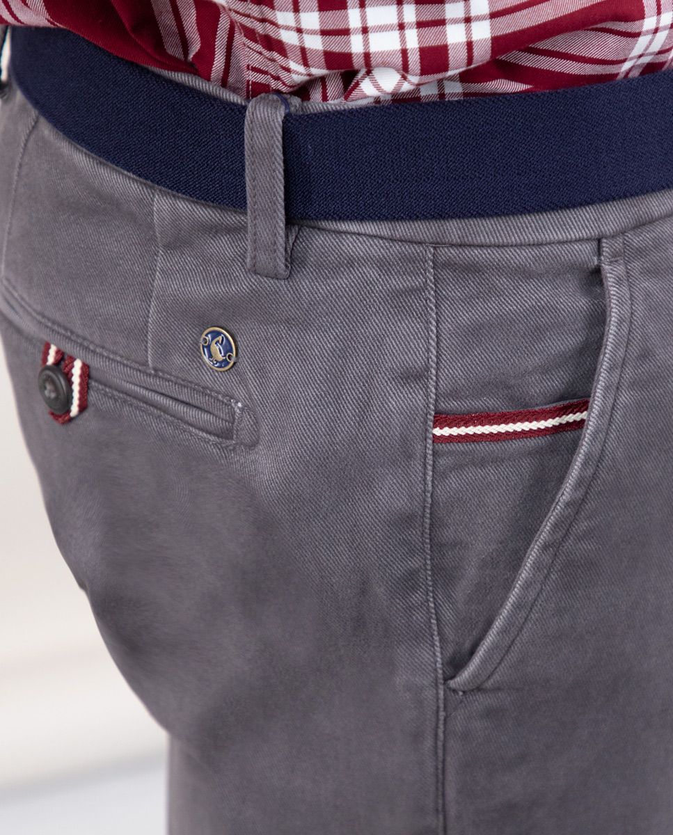 Pantalón chino de hombre confeccionado en tejido twill con 98% algodón y 2% elastano. Lleva un proceso de perchado que le da un acabado más suave y caliente. Corte Regular Fit. Cierre mediante cremallera oculta por tapeta y botón. Bolsillos traseros de vivo con detalle de cinta en el botón. Logo cosido sobre bolsillo trasero.