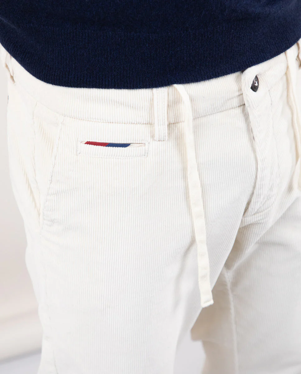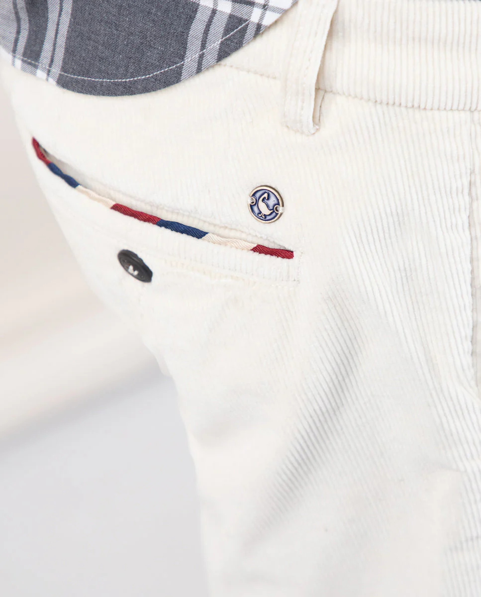 Pantalón chino de hombre confeccionado en tejido de pana con 98% algodón y 2% elastano. Corte Slim Fit, cierre mediante cremallera oculta por tapeta y botón. Bolsillos delanteros y traseros. Detalle de cinta corbatera en vivos de los bolsillos traseros y en bolsillo cerillero del delantero .
