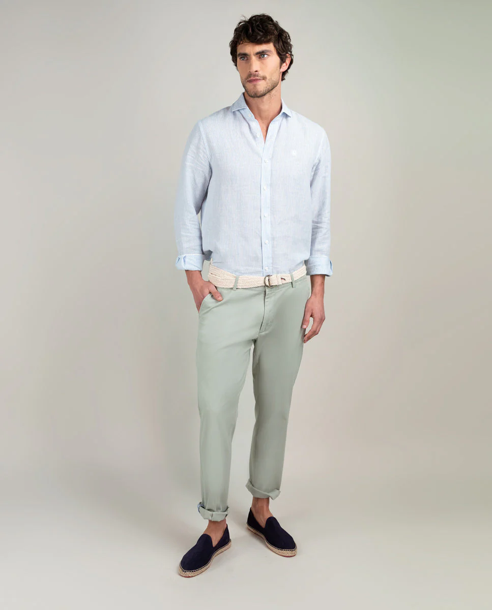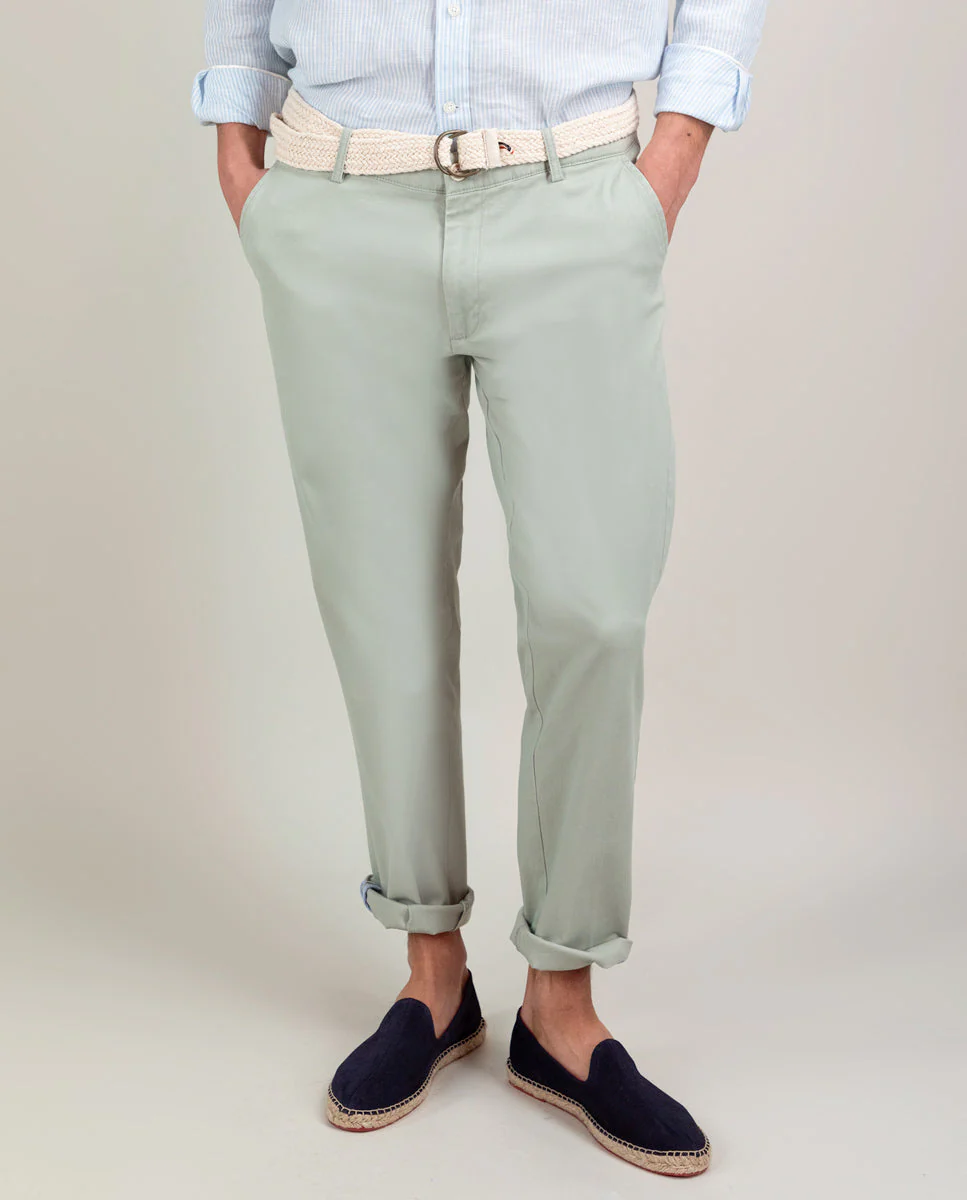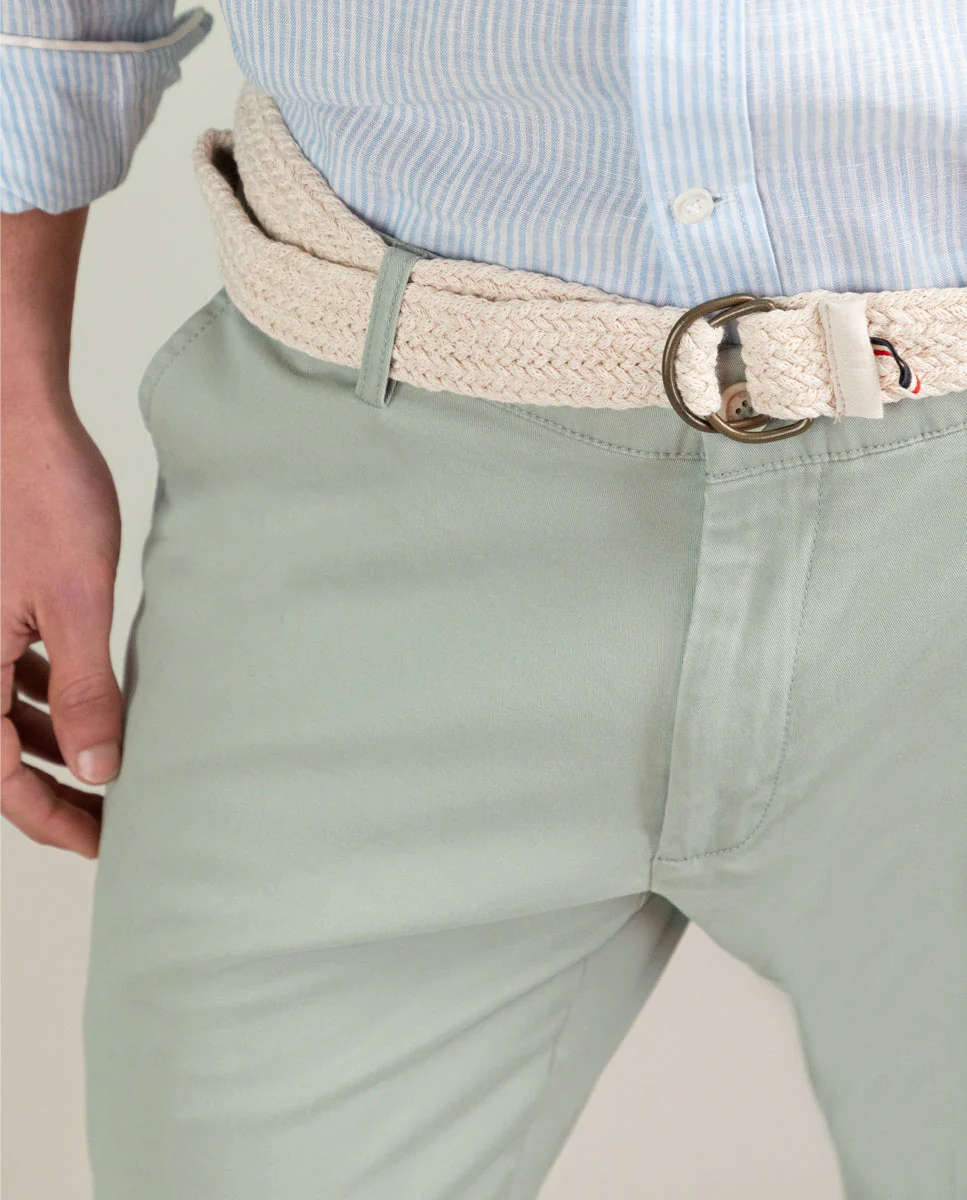 Pantalón chino confeccionado en tejido gabardina con 82% algodón, 15% de algodón reciclado y 3% elastano. Lleva un lavado final con enzima ácida lo que le da un aspecto desgastado. Corte Slim Fit, cierre mediante cremallera oculta por tapeta y botón. Tiene bolsillos delanteros y en los traseros lleva vivos a contraste. Tiene el chapón del logo cosido encima del bolsillo trasero. Incluye cinturón de canvas.
