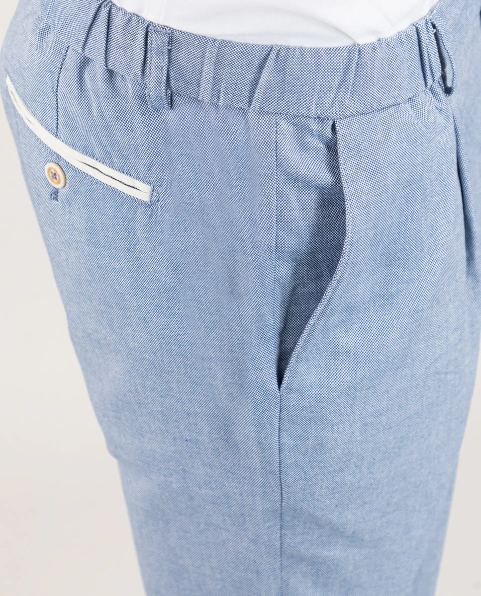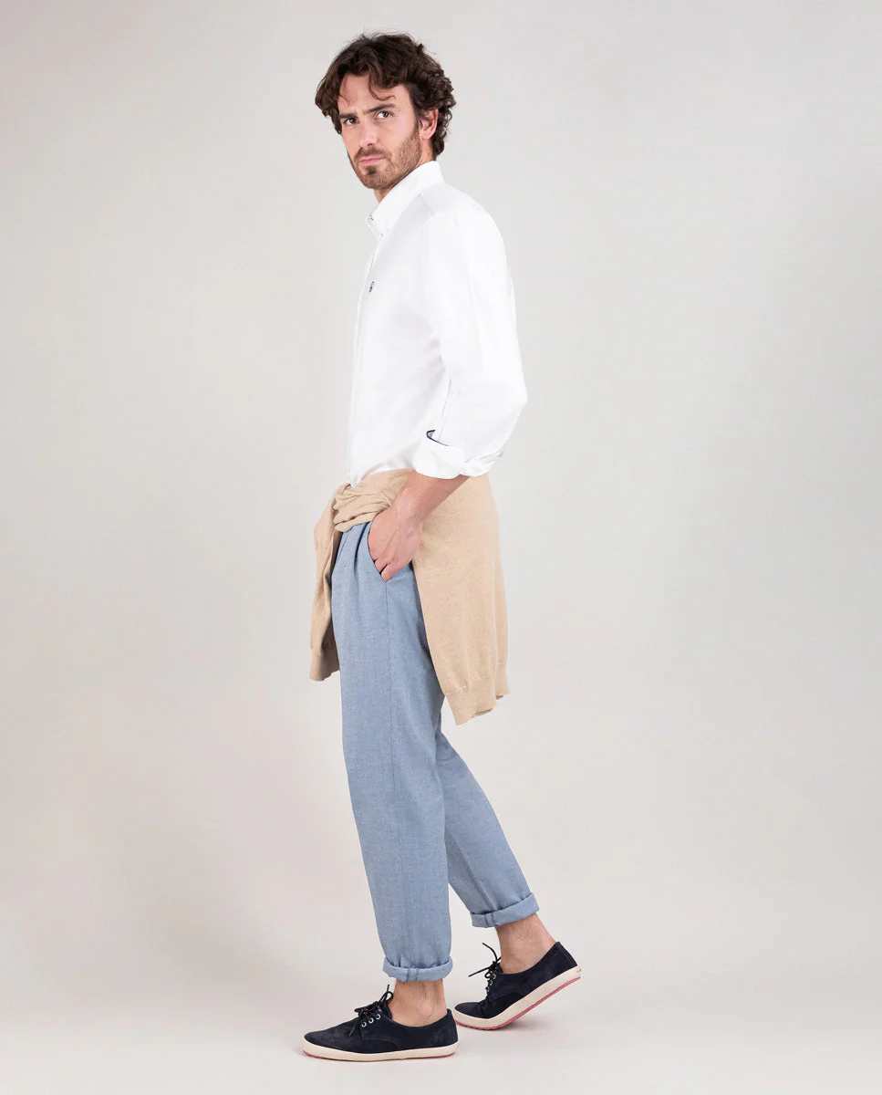 Pantalón de hombre coordinado Oxford. Tiene un corte regular fit. Cierre mediante cremallera y botón. Dos bolsillos laterales, uno monedero y bolsillos traseros con vivos y abotonado. Trabillas para el cinturón. Cuenta con detalles en tejido corbatero marino con rayas rojas y blancas.