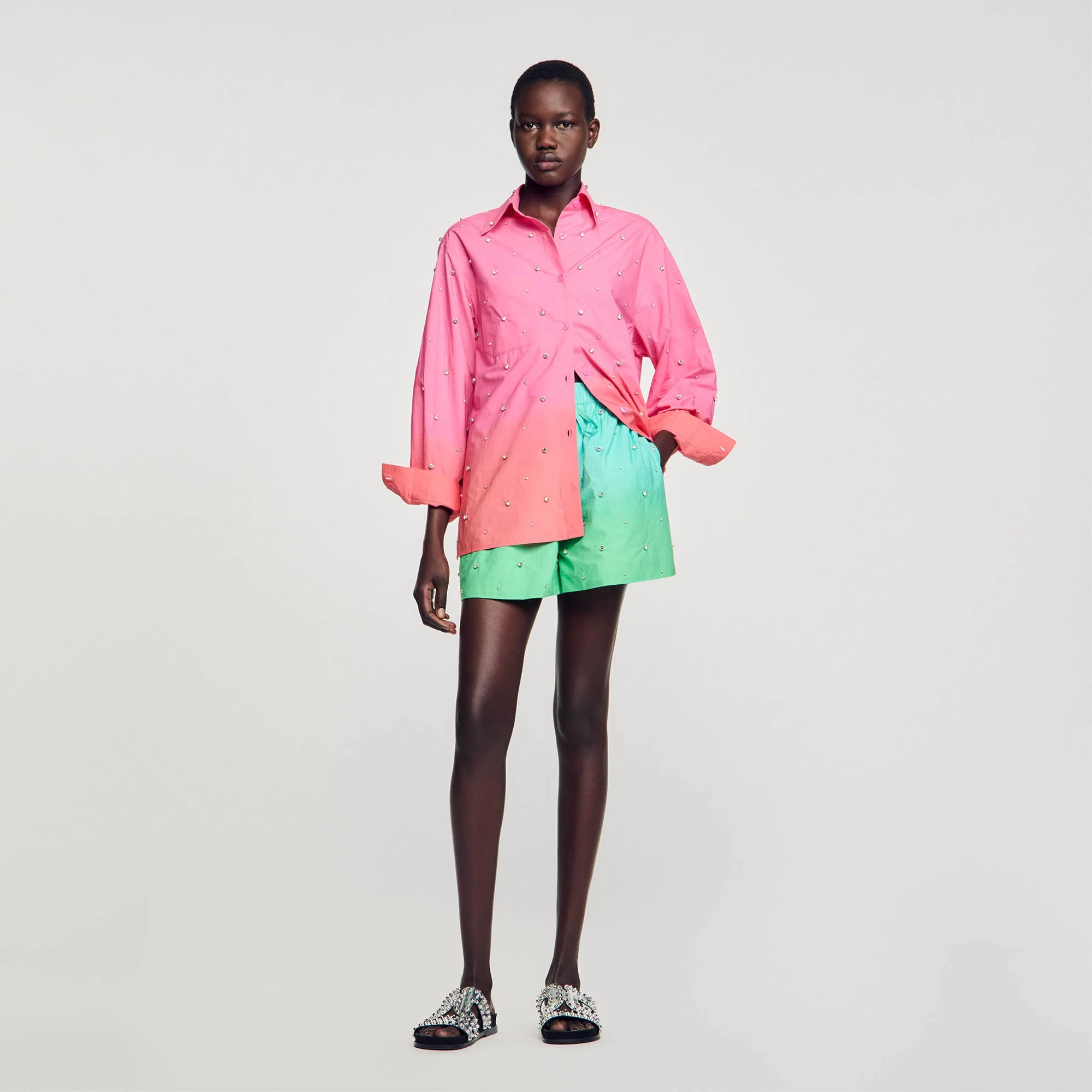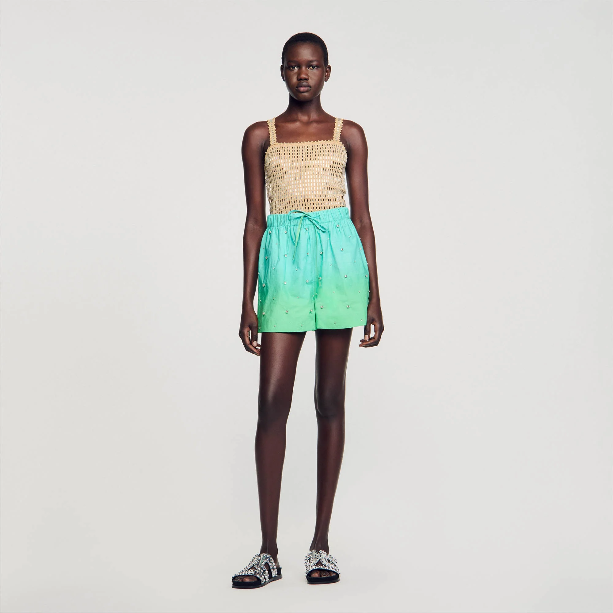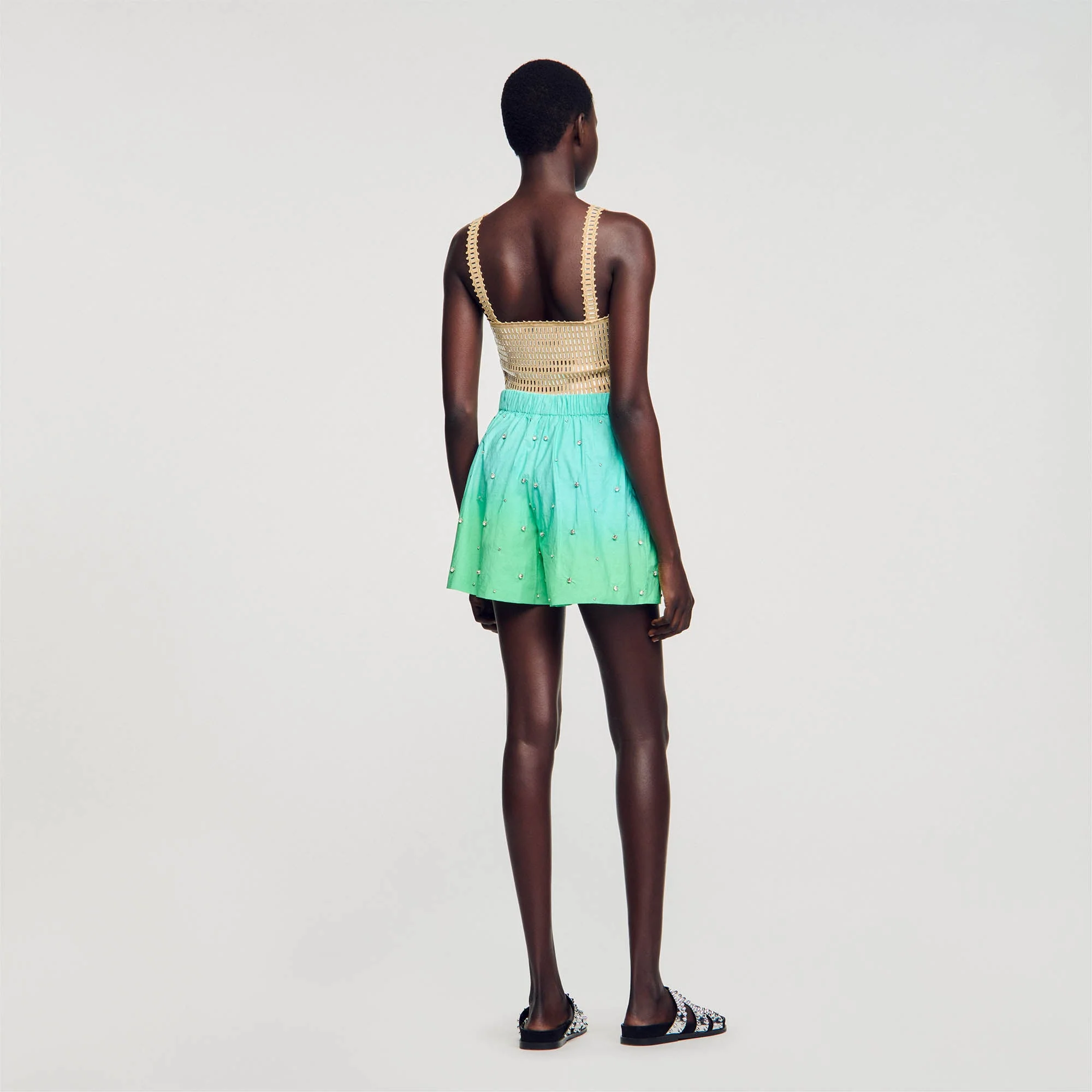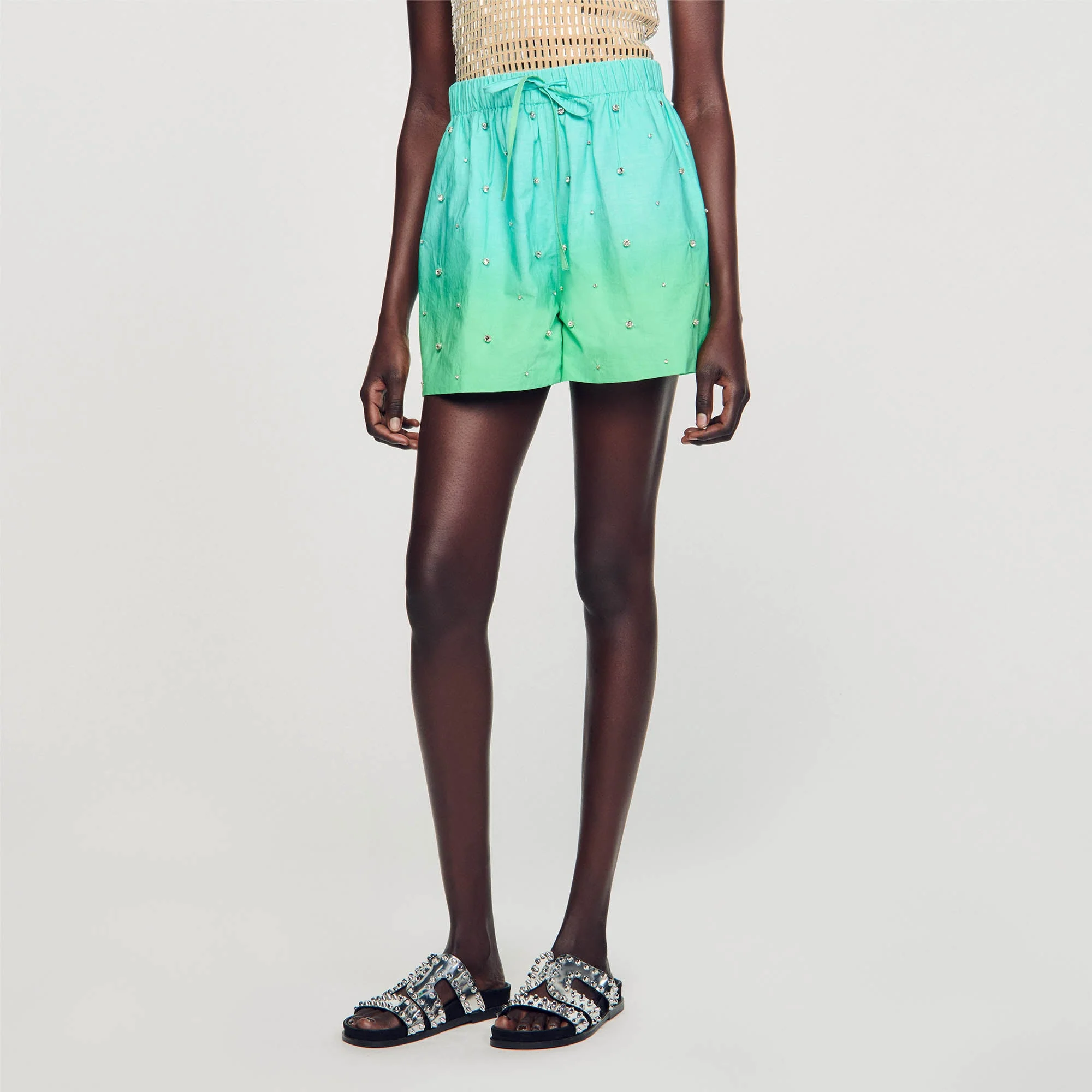 Pantalón corto y ancho de popelina dip dye con detalle de piezas de strass bordadas a mano por toda la prenda y cintura ancha con cordones.