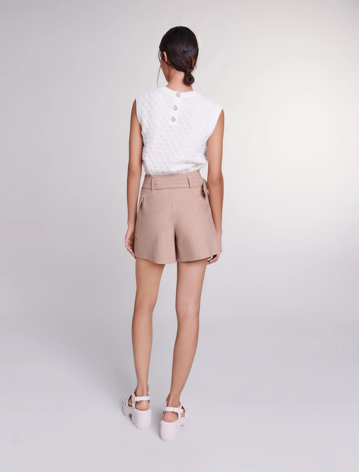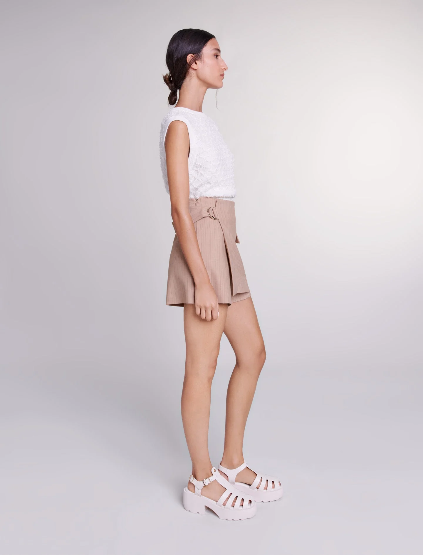 Esta temporada, nuestro estudio reinventa con audacia piezas intemporales, mezclando con elegancia códigos de sastrería en tonos suaves.Decorado con rayas, esta falda pantalón revela un efecto trampantojo para estructurar su silueta con un toque atrevido. Tiene un cierre de cremallera, un faldón ajustable en la parte delantera, una hebilla metálica y un bolsillo con solapa.Ref.: MFPSH00531