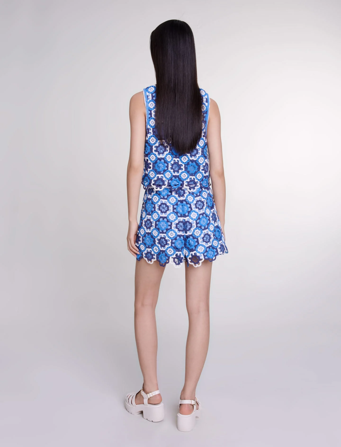 Maje le lleva a Grecia con esta cápsula inédita, donde el blanco deslumbrante y el azul azur se mezclan con tejidos ligeros para realzar sus celebraciones veraniegas. Desde la playa hasta elegantes veladas al aire libre, estos atuendos prometen un verano irresistible.Juegue la carta de la audacia con este pantalón corto de ganchillo lleno de carácter, en el que los contrastes y los detalles de la firma llaman la atención. Resaltado por ribetes en la cintura, presenta motivos de trébol en relieve en tonos azules, añadiendo un toque de sofisticación y frescura a su estilo veraniego.Pieza central de su maleta de verano, pote por un «look» total con un top a juego y sandalias de plataforma.Referencia: MFPSH00565_0201