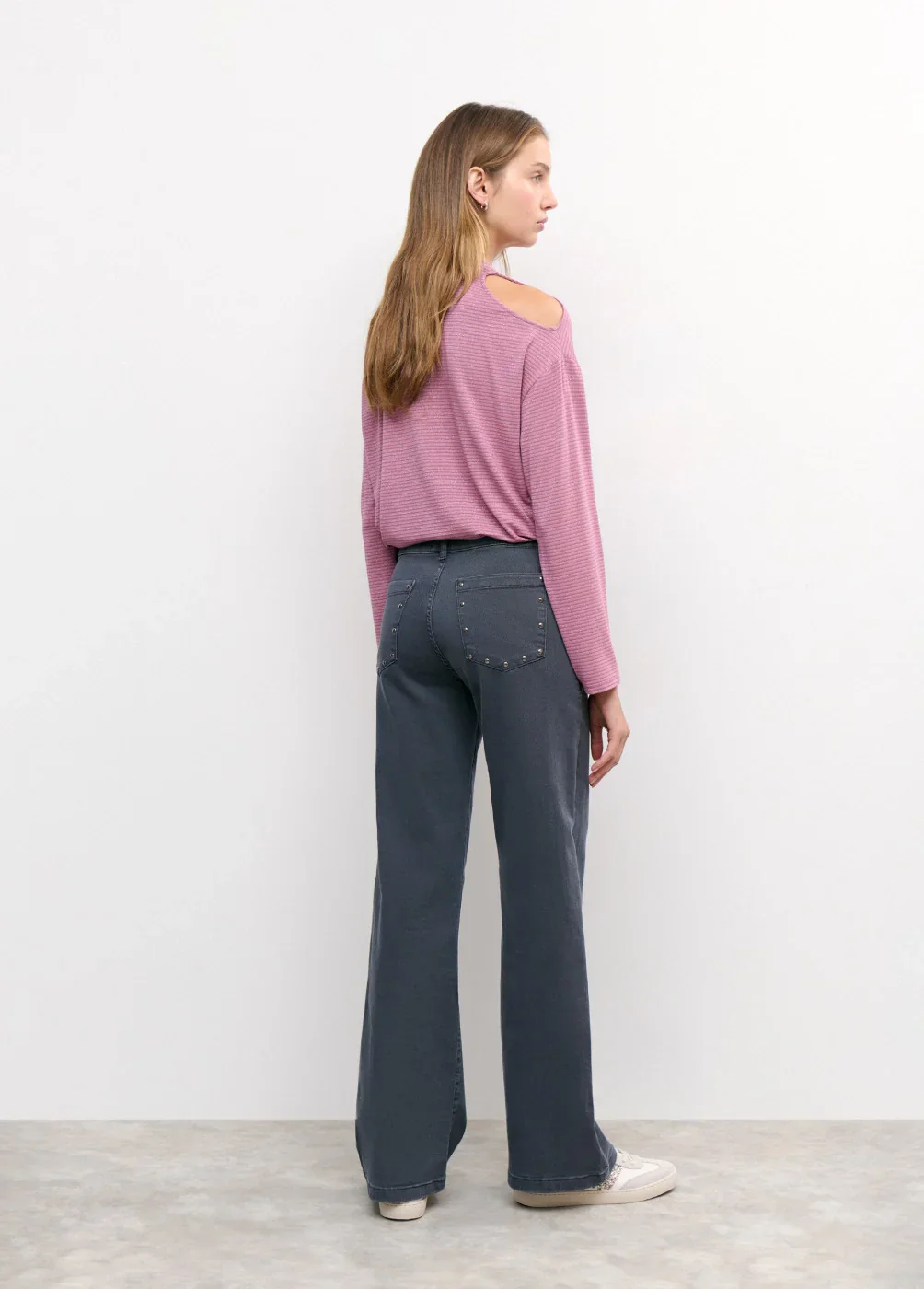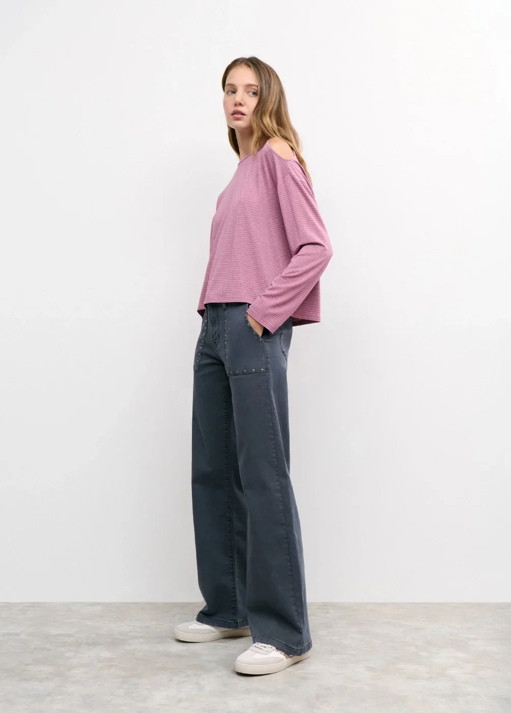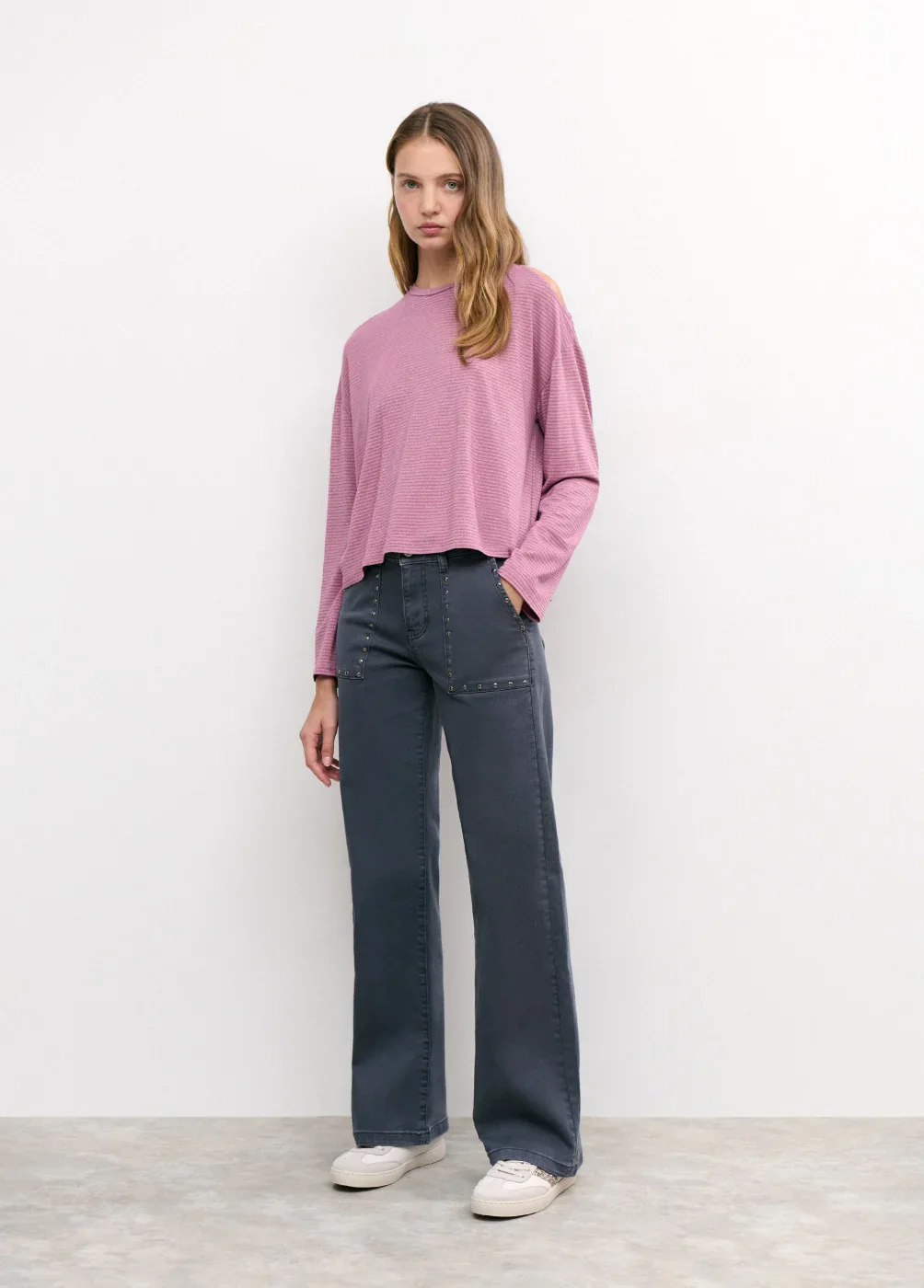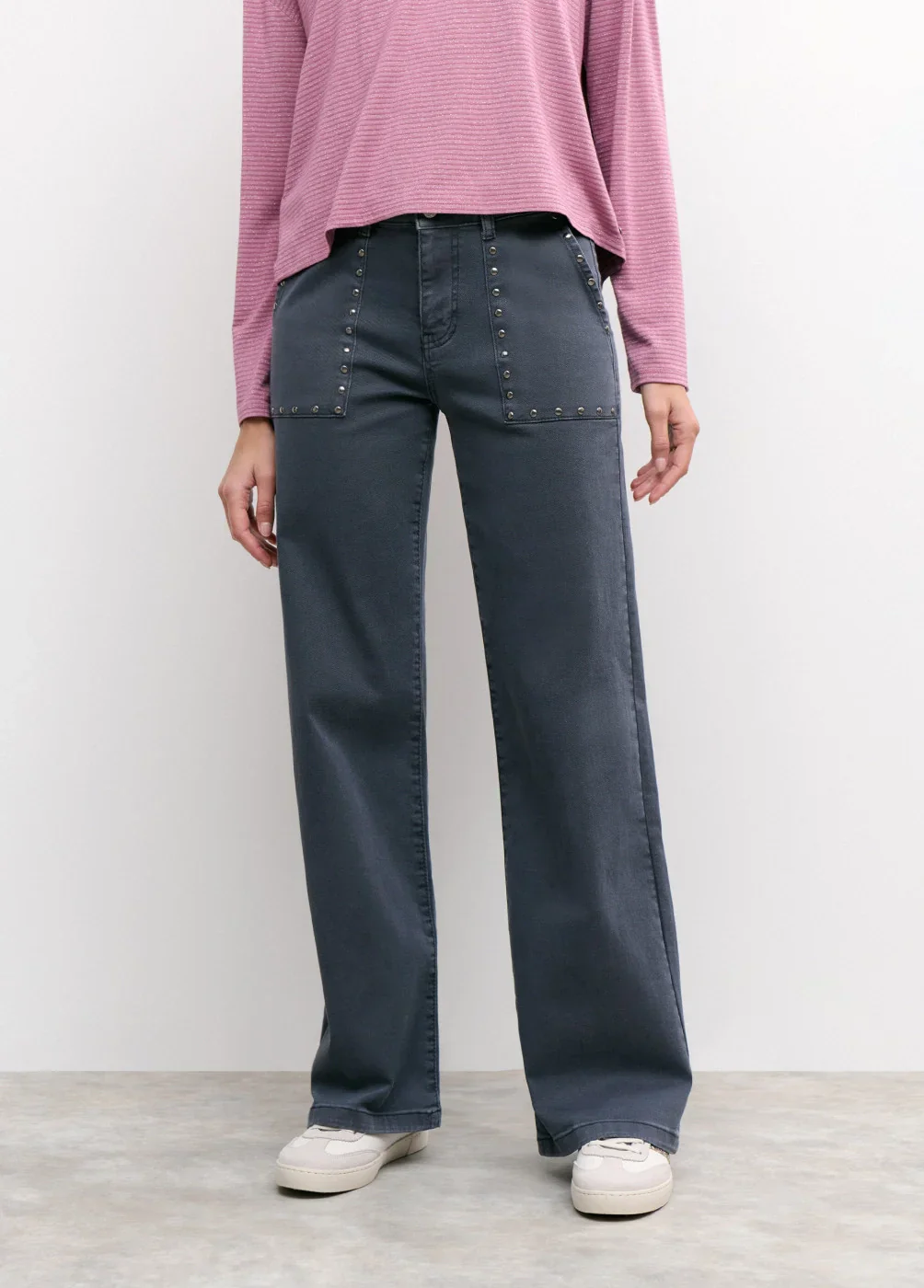 Pantalón culotte de tiro medio con maxi bolsillos en el frontal y detalle de tachas.