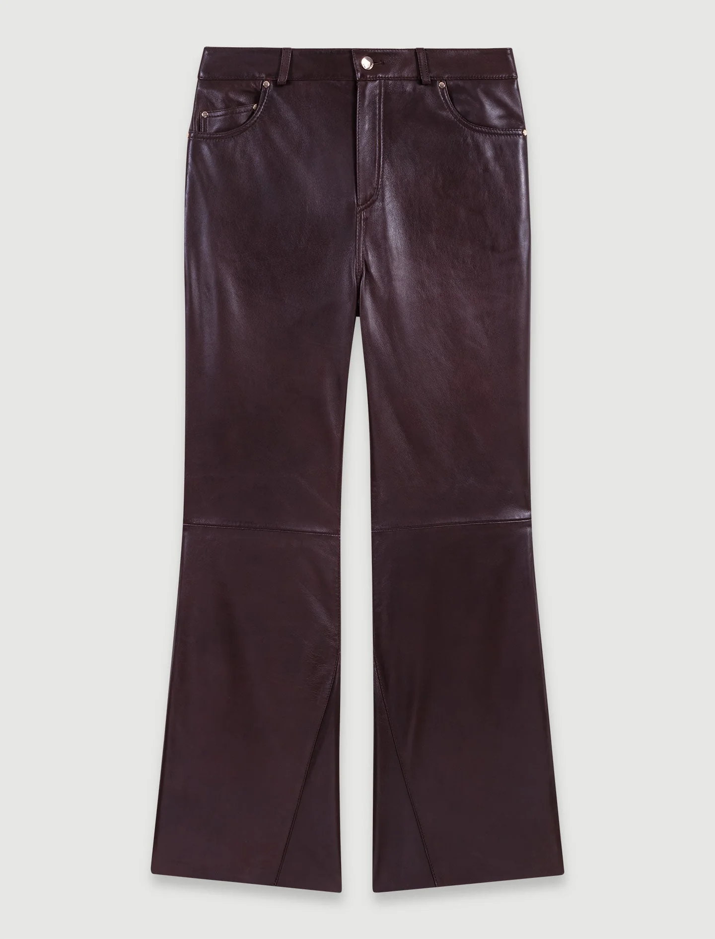 El color estrella de esta temporada aparece en estos pantalones de cuero de talle medio. El corte entallado, realzado por cinco bolsillos y pespuntes en las rodillas, tiene un bajo ligeramente acampanado.