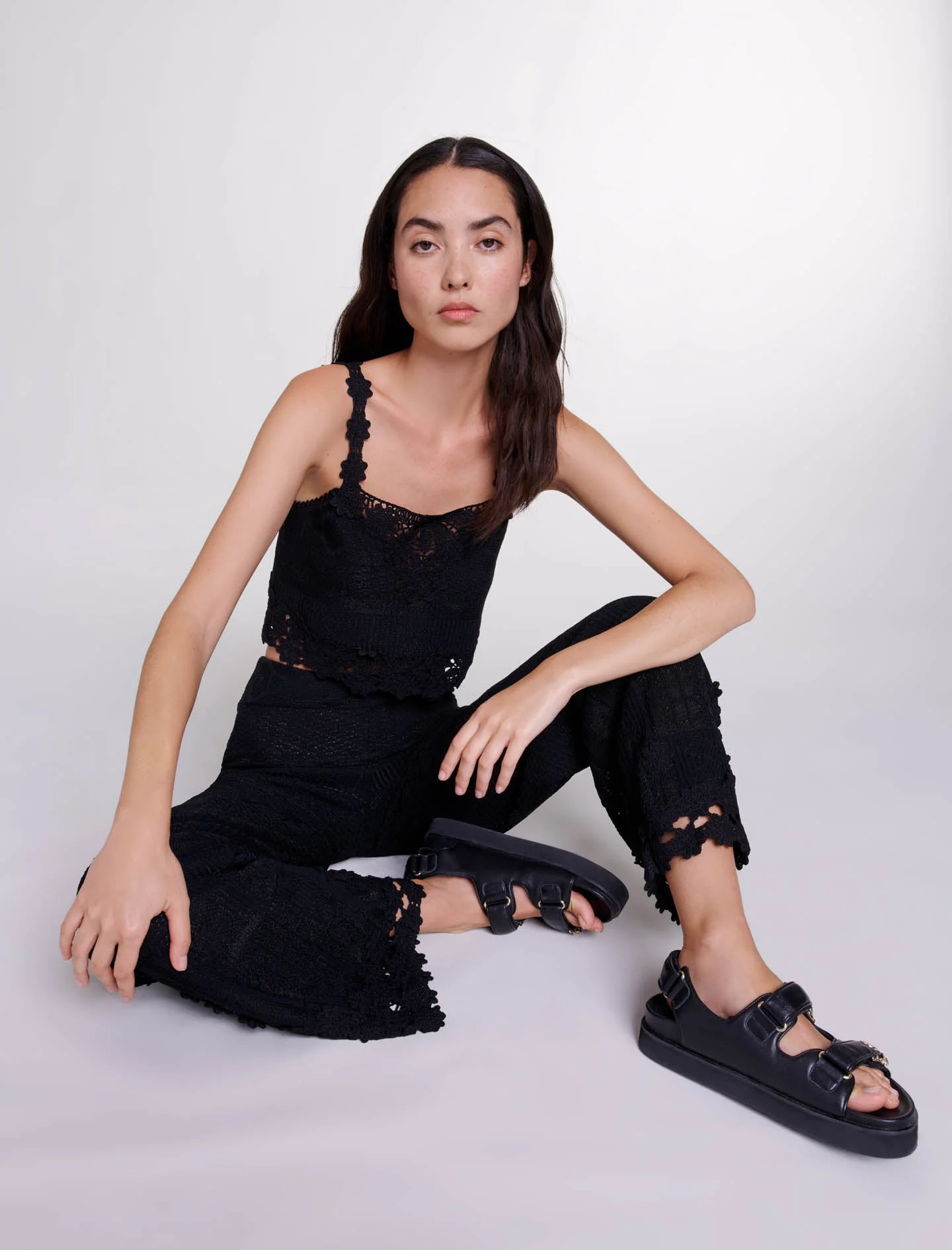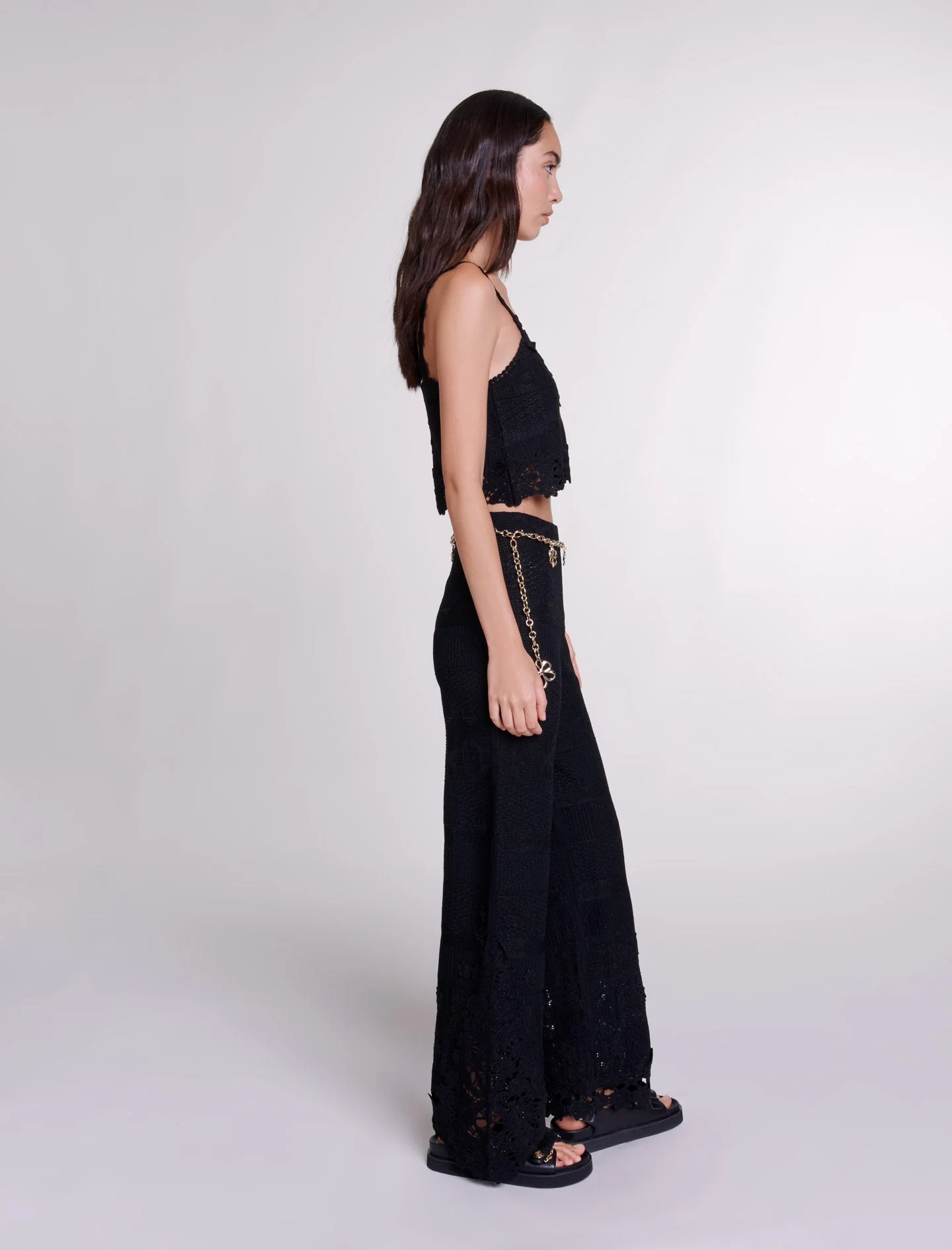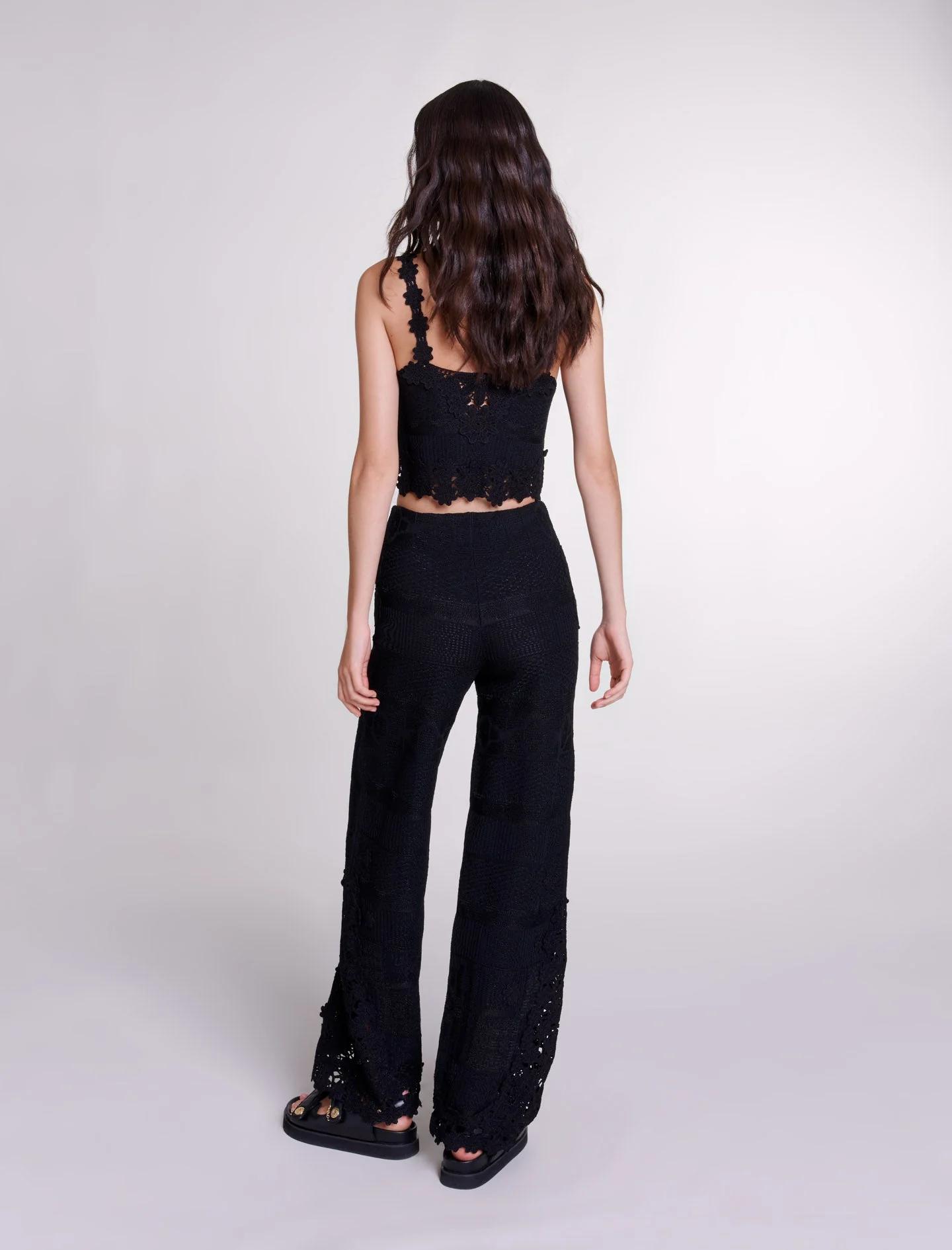 Para esta nueva colección, el estudio de Maje revisita piezas intemporales del guardarropa con un toque atrevido y cortes femeninos.De punto elástico, este pantalón ancho destaca por su juego de texturas y una forma acampanada que realza la silueta.Con cintura elástica, tiene un motivo de flores de guipur calado en los laterales y el bajo, dejando al descubierto la piel con una transparencia.Apueste por el «look» total añadiendo un cinturón para realzar la cintura, un top a juego y sandalias de plataforma.Ref.: MFPPA00630