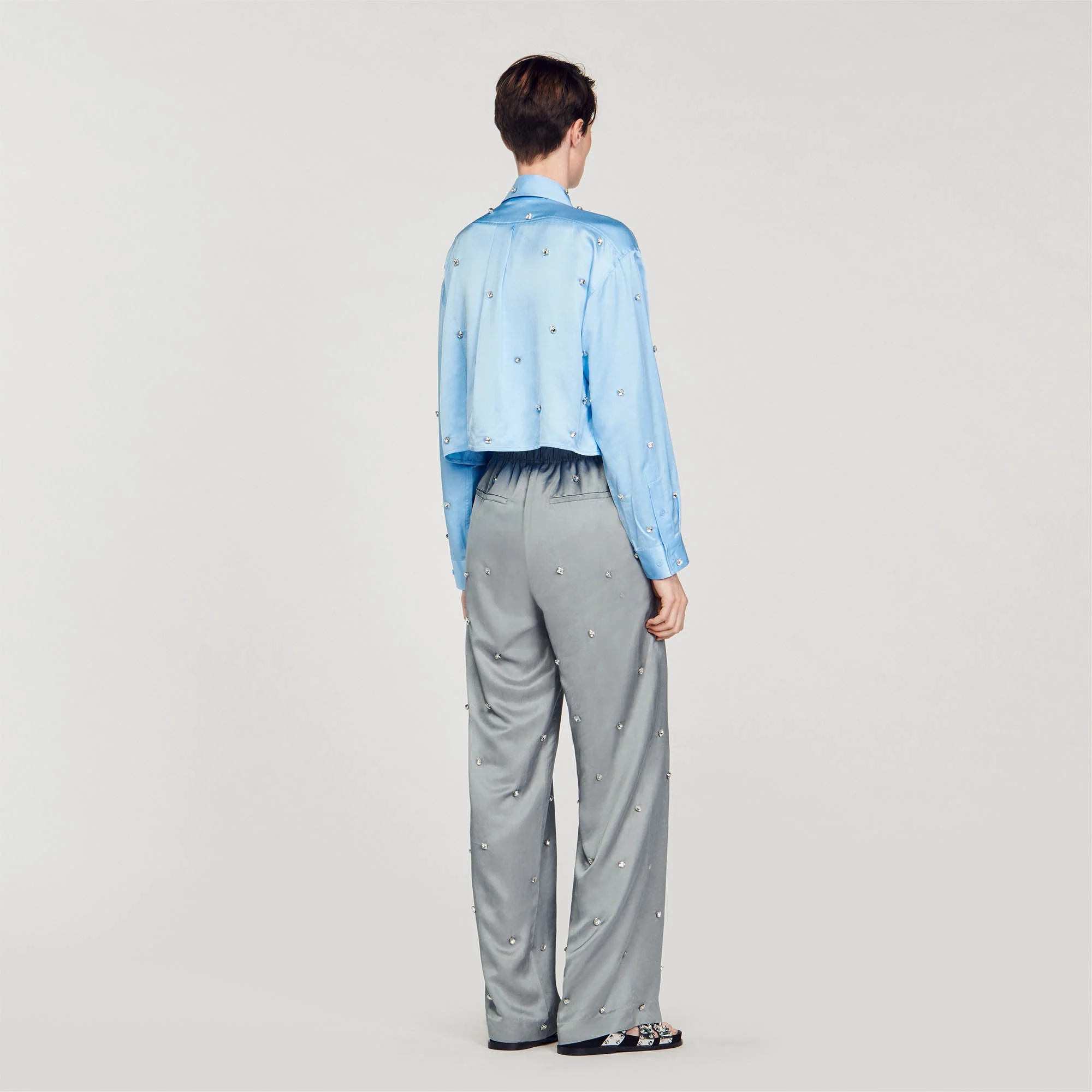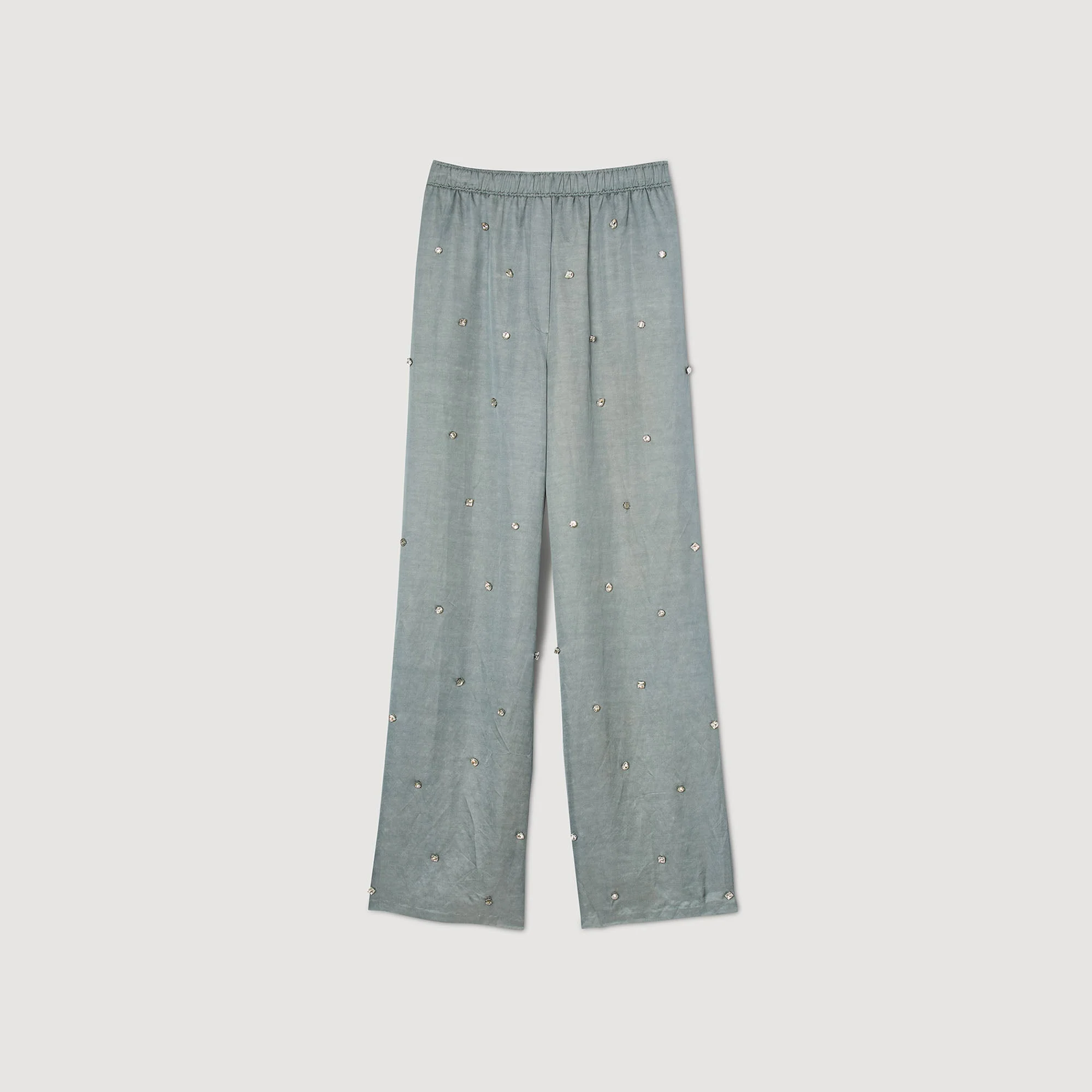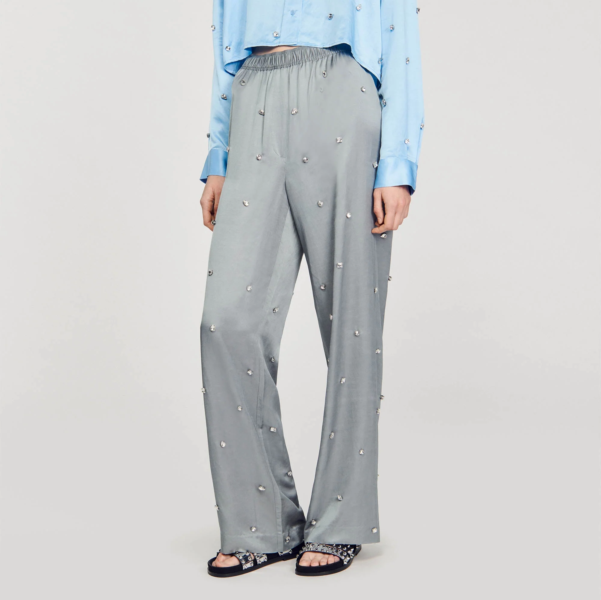 Pantalón ancho, fluido y satinado con cintura elástica y detalle de bordados de strass.