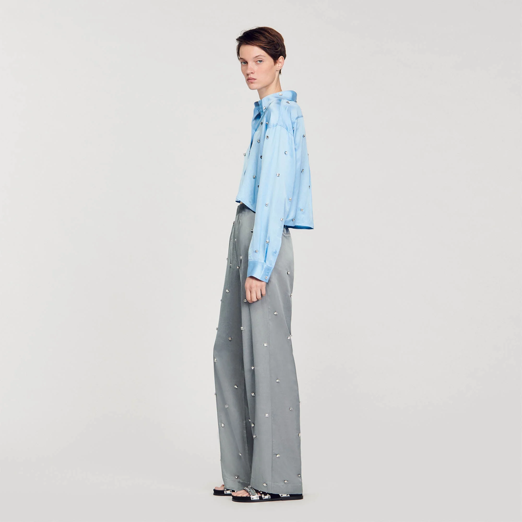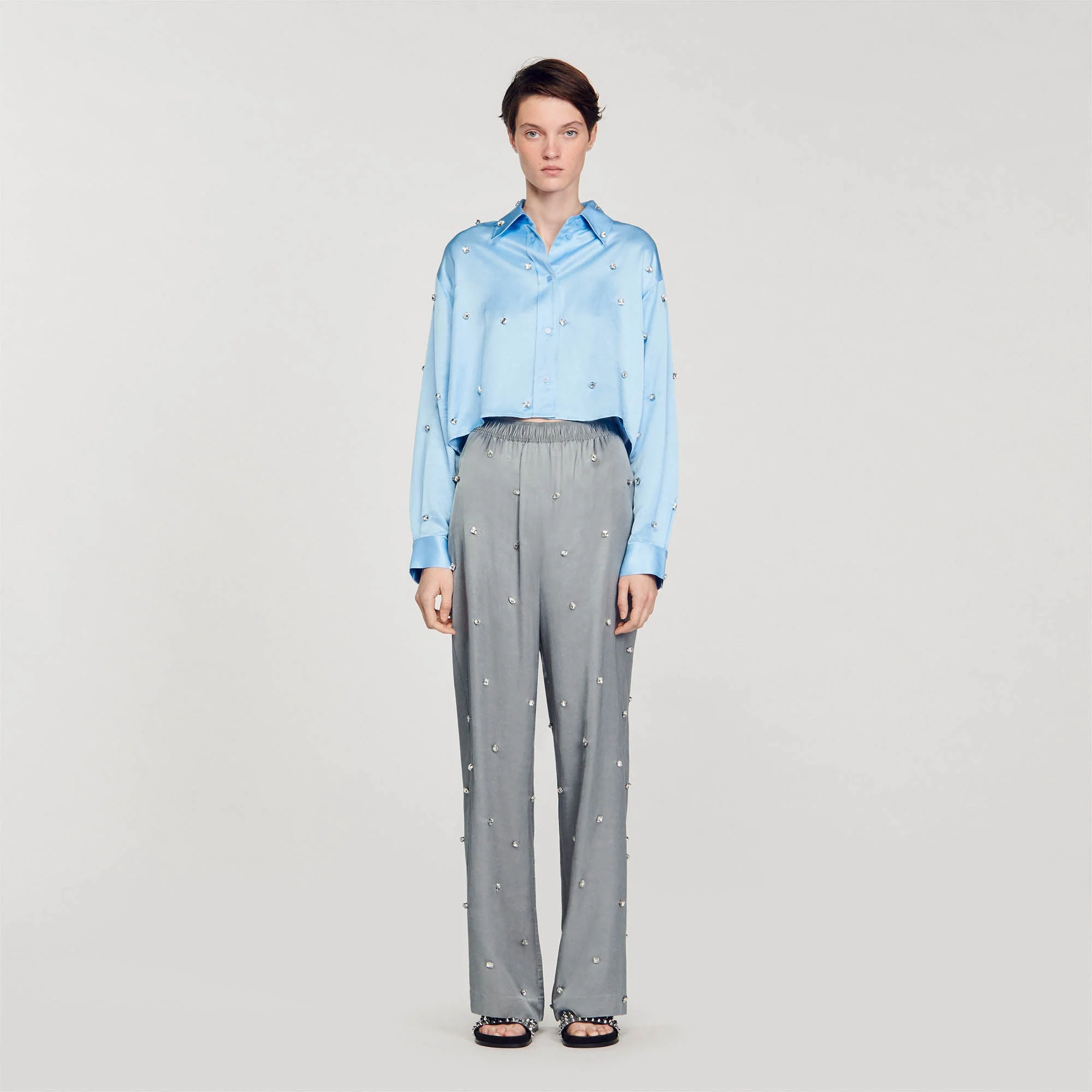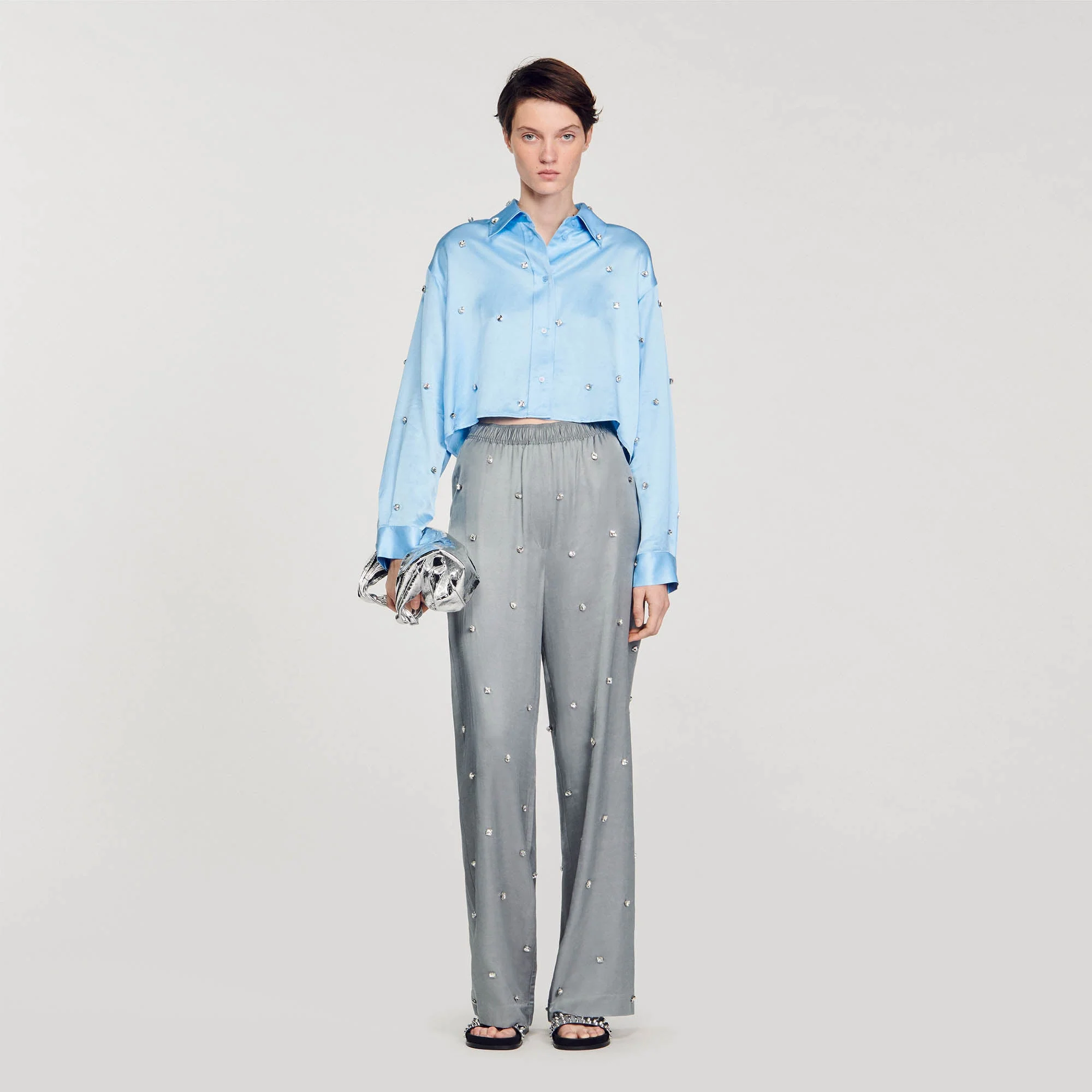 Pantalón ancho, fluido y satinado con cintura elástica y detalle de bordados de strass.