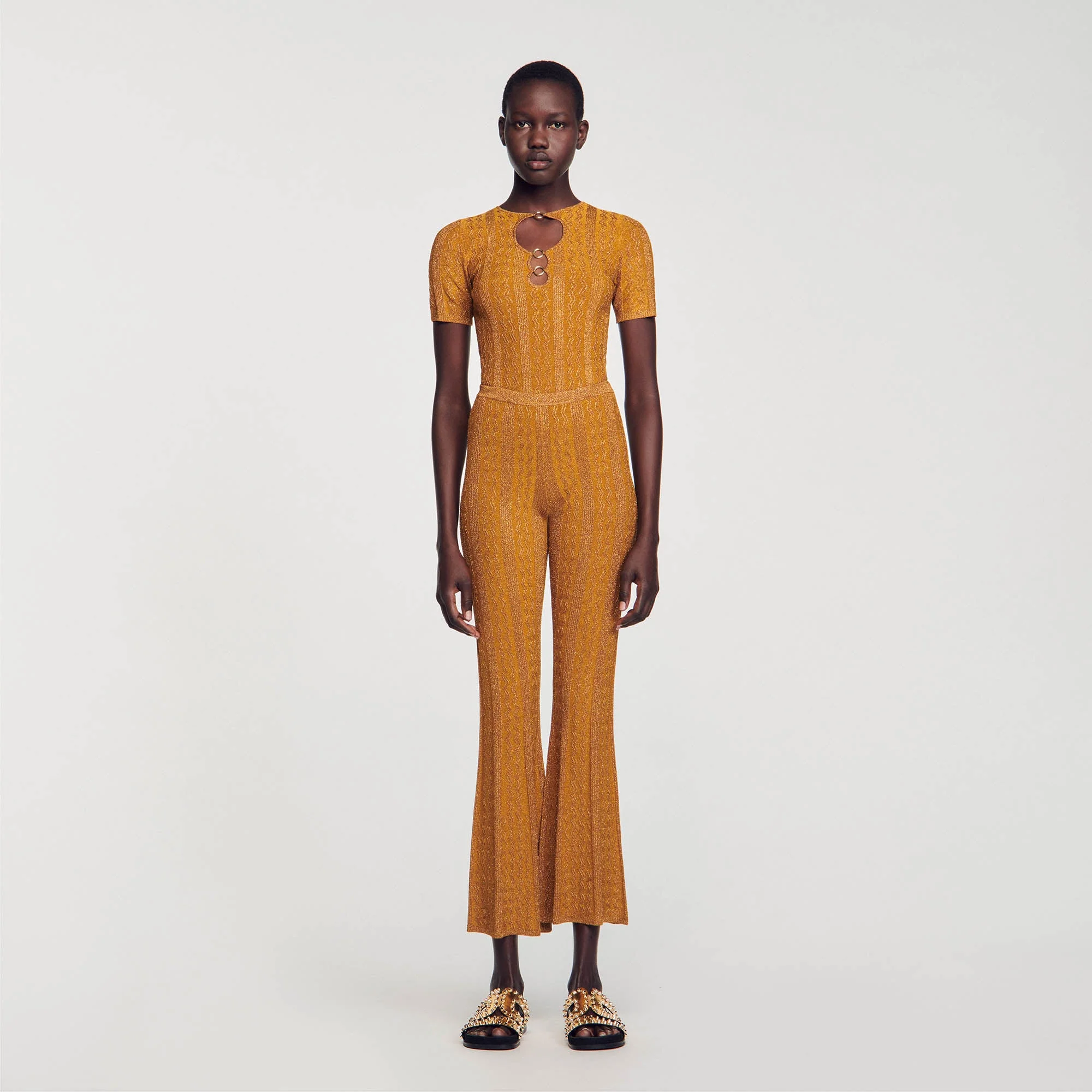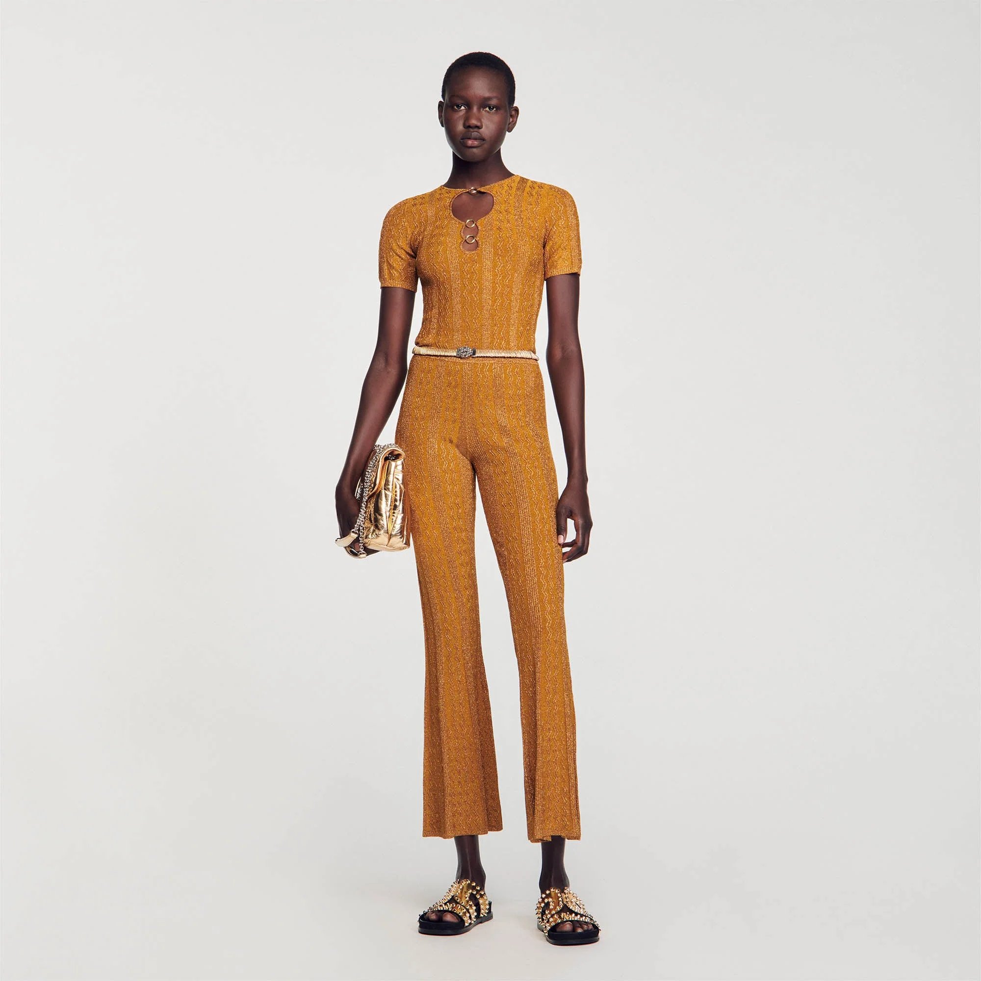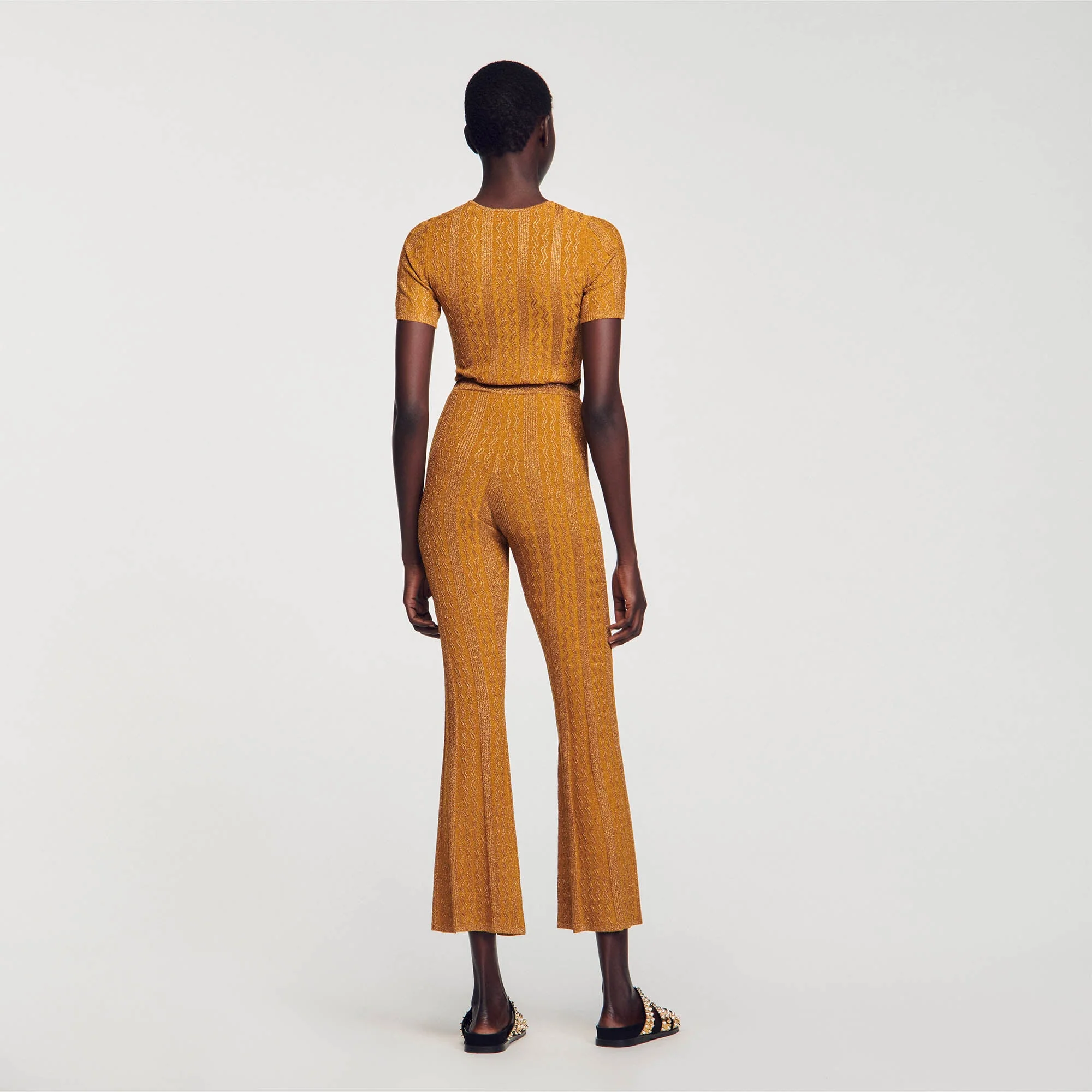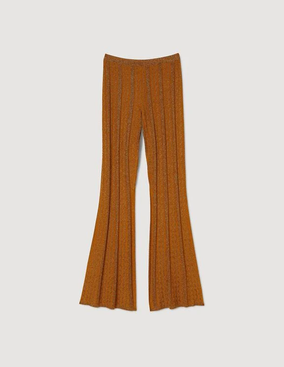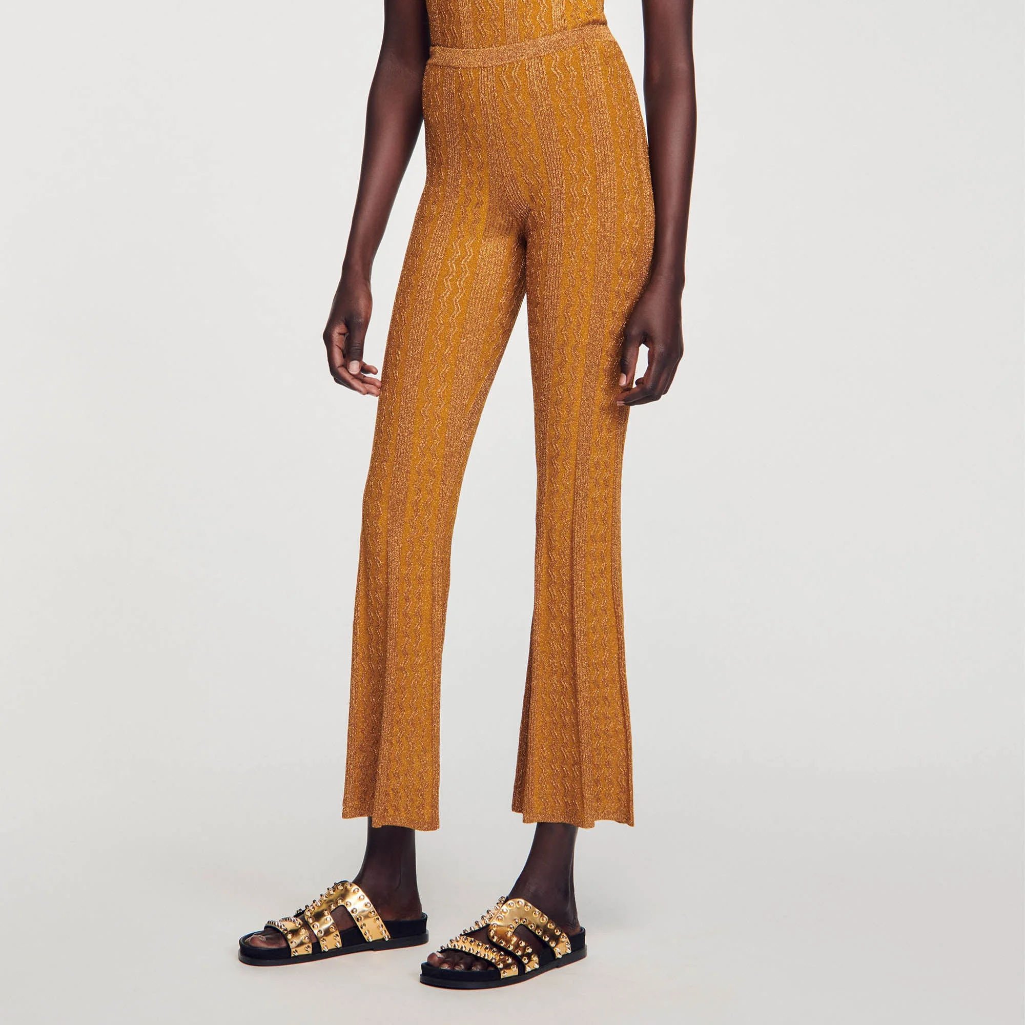 Pantalón acampanado de punto trenzado con incrustaciones de fibras metalizadas brillantes.
