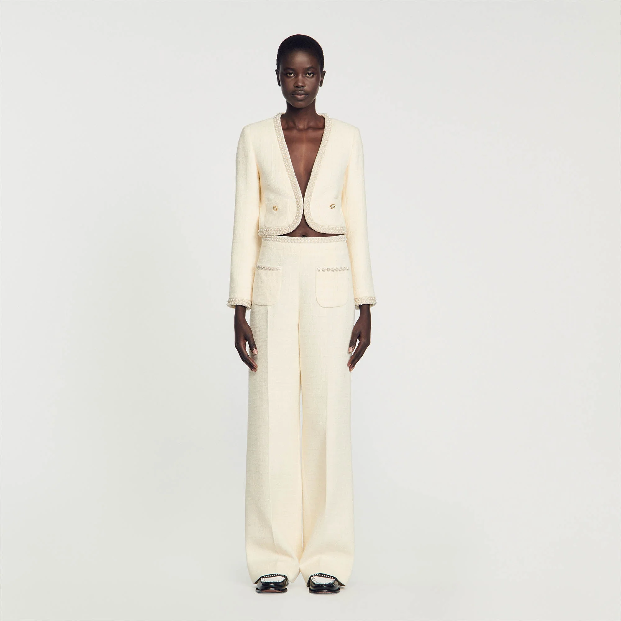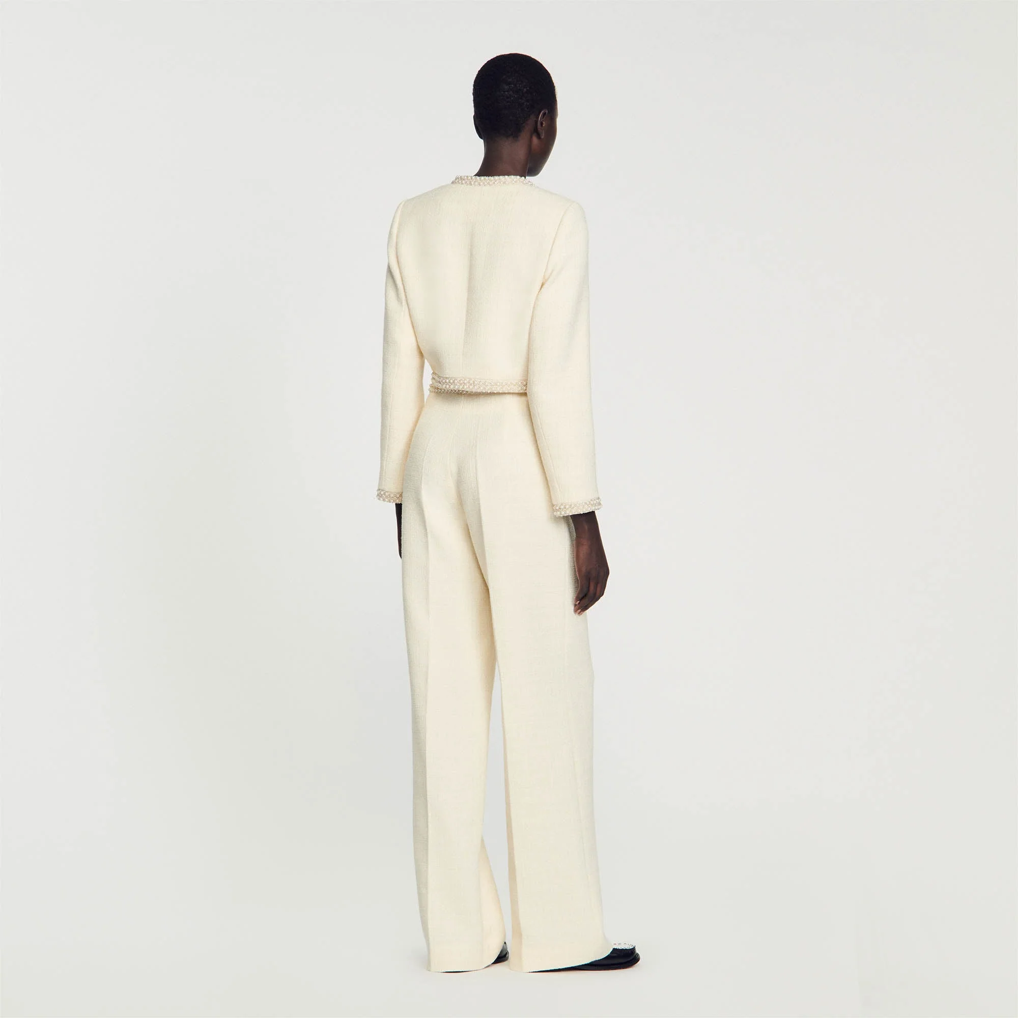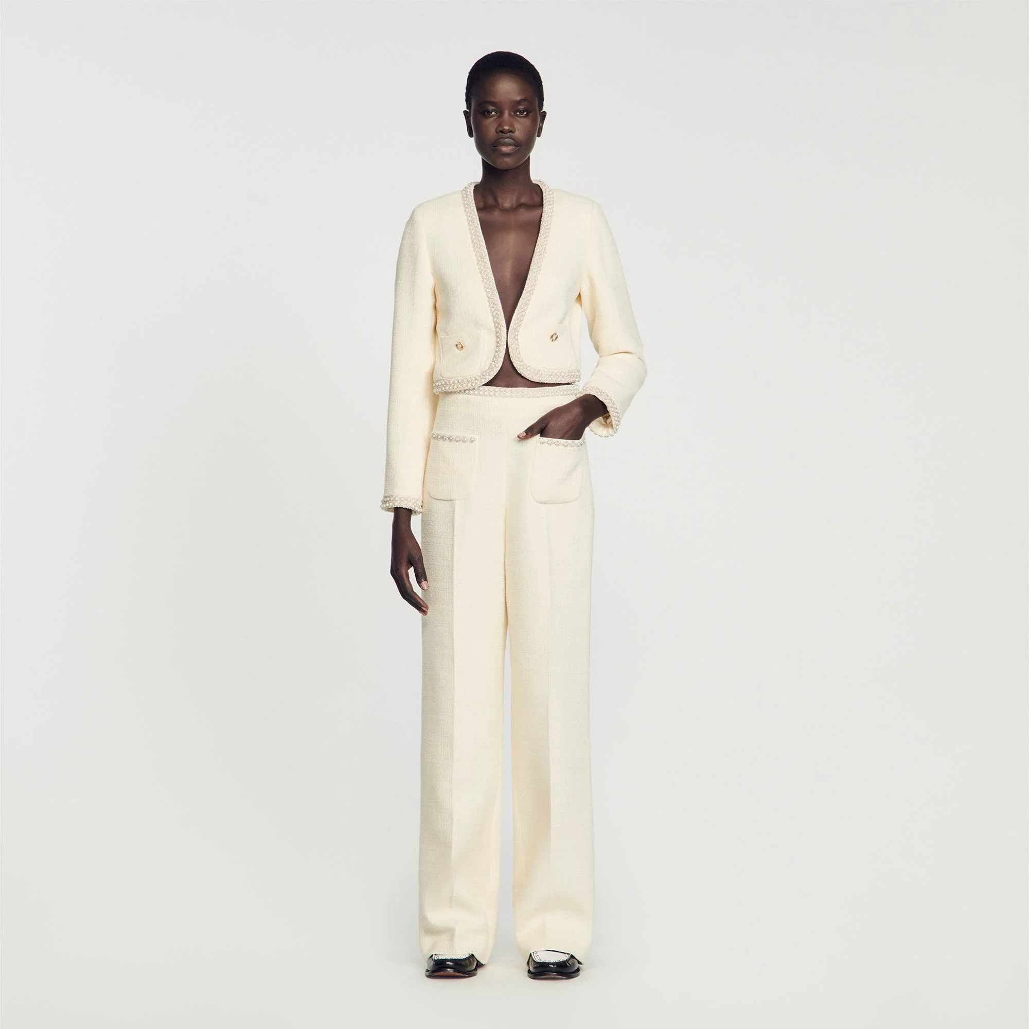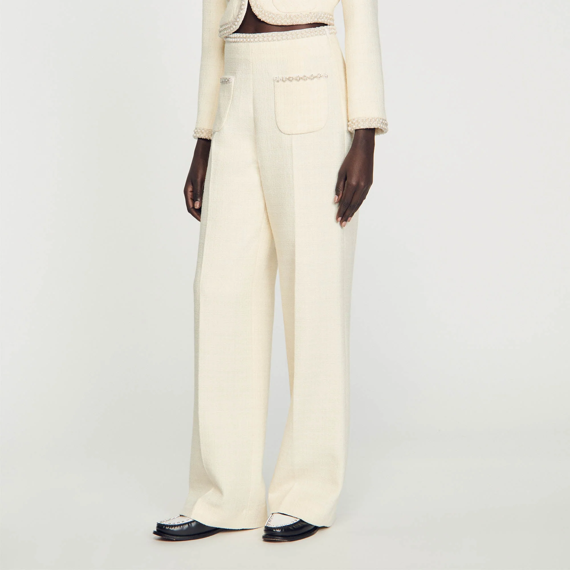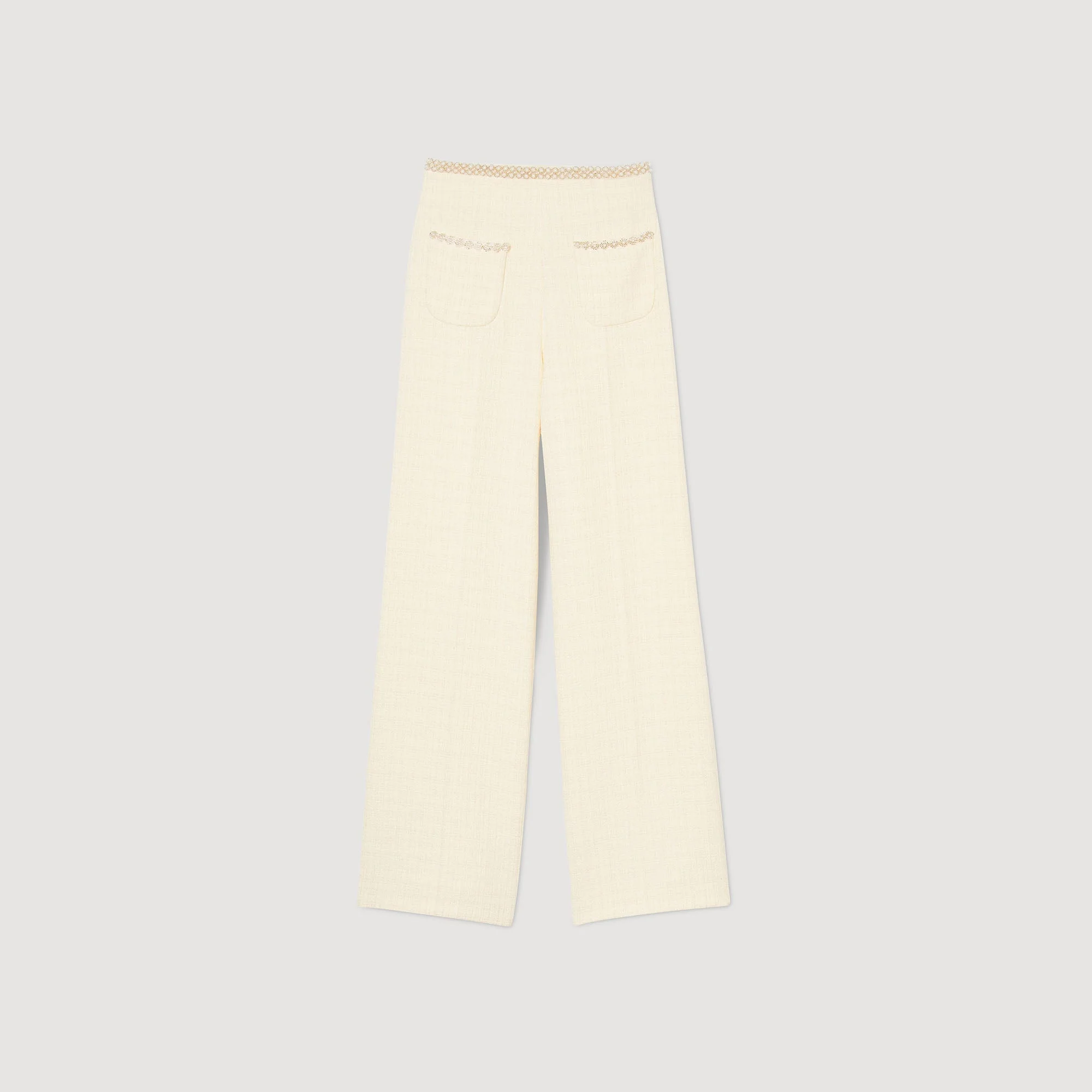 Pantalón de sarga de talle alto decorado con trenza de pedrería y bolsillos de parche en la cintura.