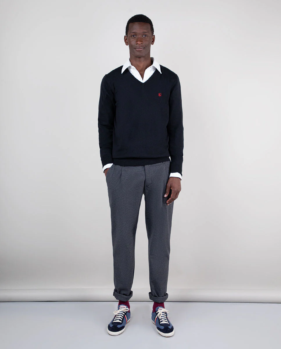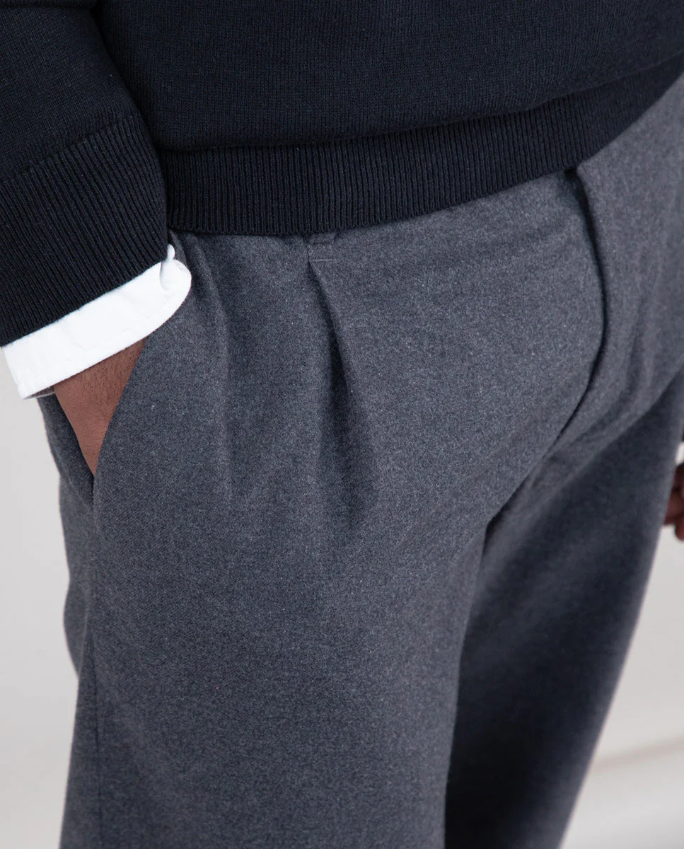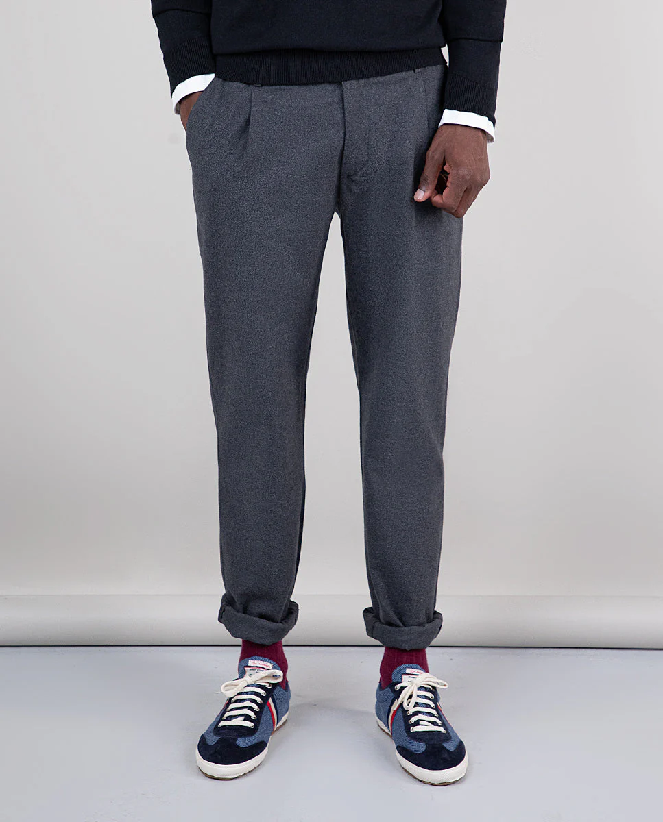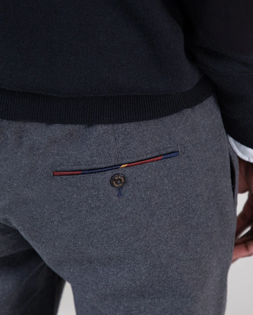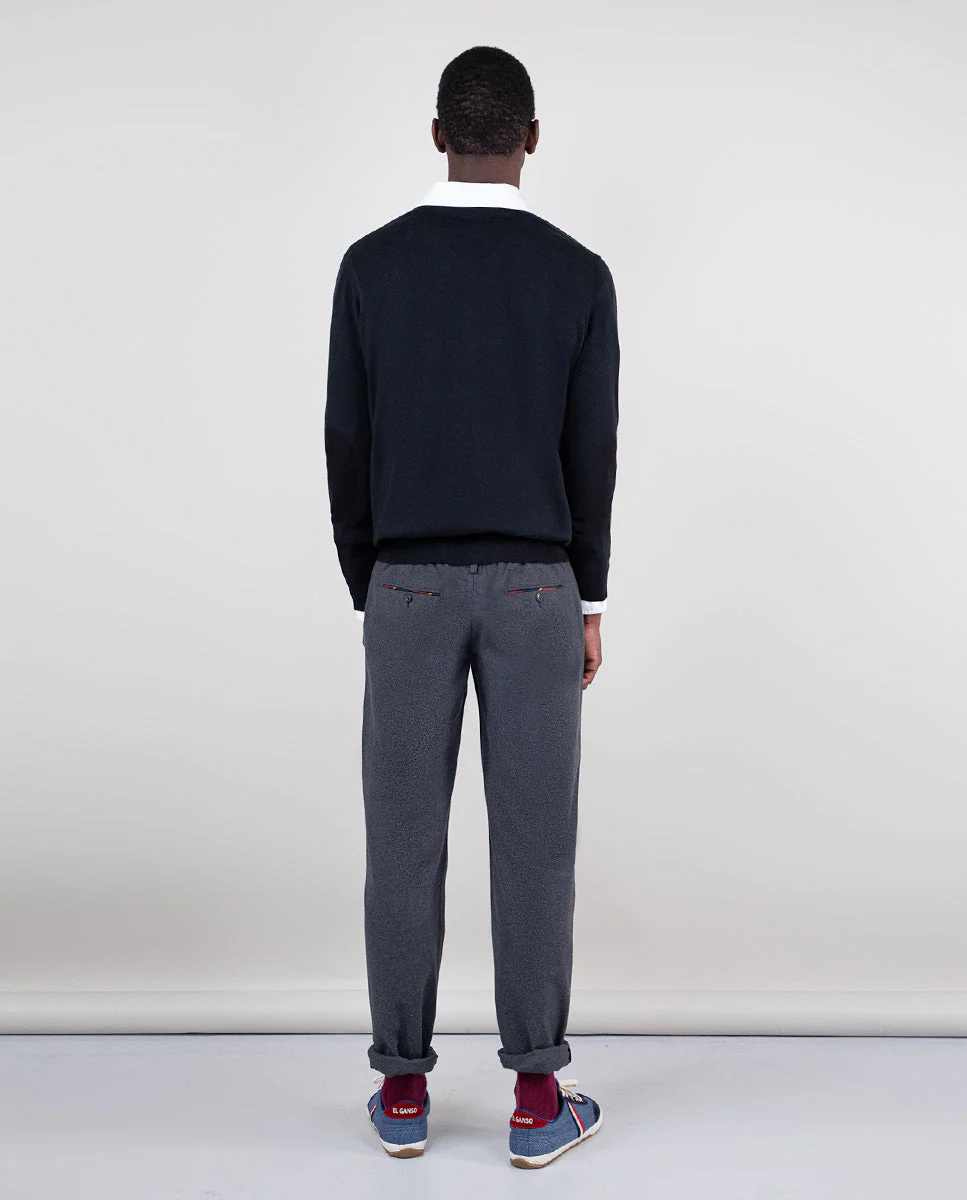 Pantalón de hombre confeccionado en tejido tipo franela algodón y elastano del fabricante Italiano Tessuti di Sondrio. Tiene un corte regular con pinzas en la cintura y cierre mediante cremallera oculta por tapeta y botón. Cuenta con bolsillos laterales y traseros con vivos a contraste.