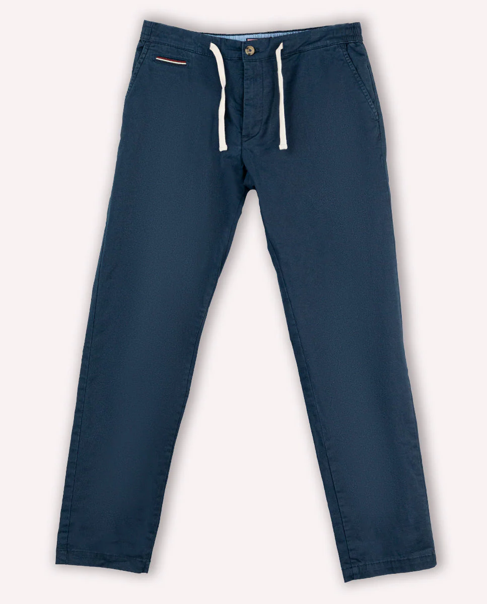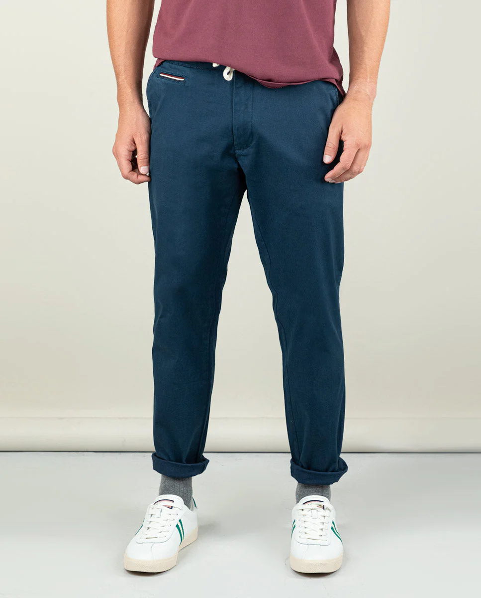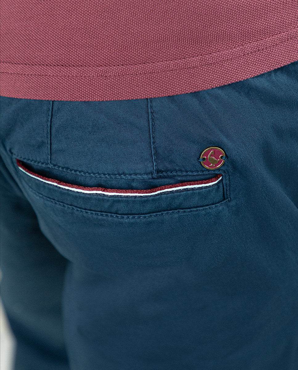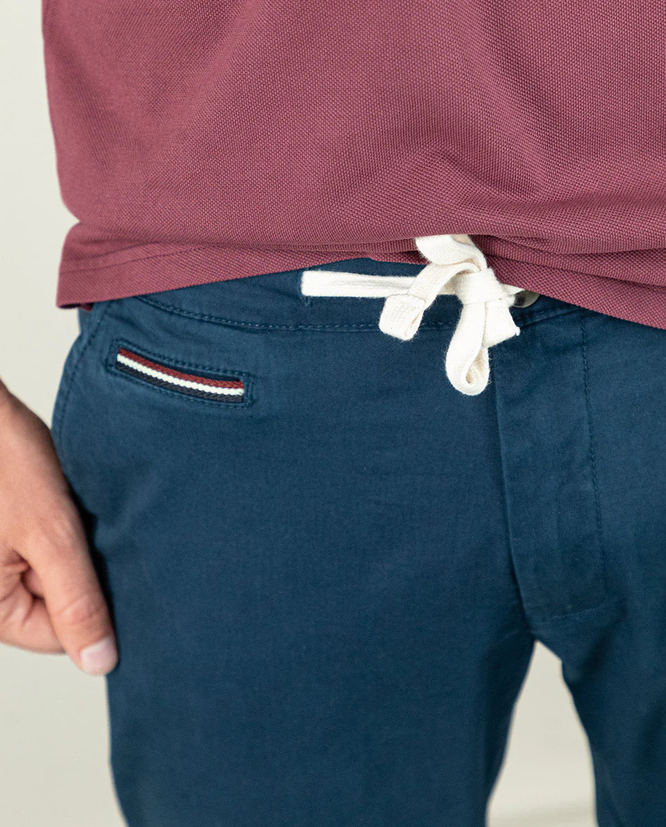 Pantalón de hombre liso tipo judo confeccionado 100% en algodón Better Cotton. Corte regular fit con cierre de cremallera y botón. Lleva cordones en la cintura. Bolsillos laterales y bolsillos de parche traseros. Detalles en bolsillo. Aporta un carácter informal y relajado, junto a una gran comodidad.