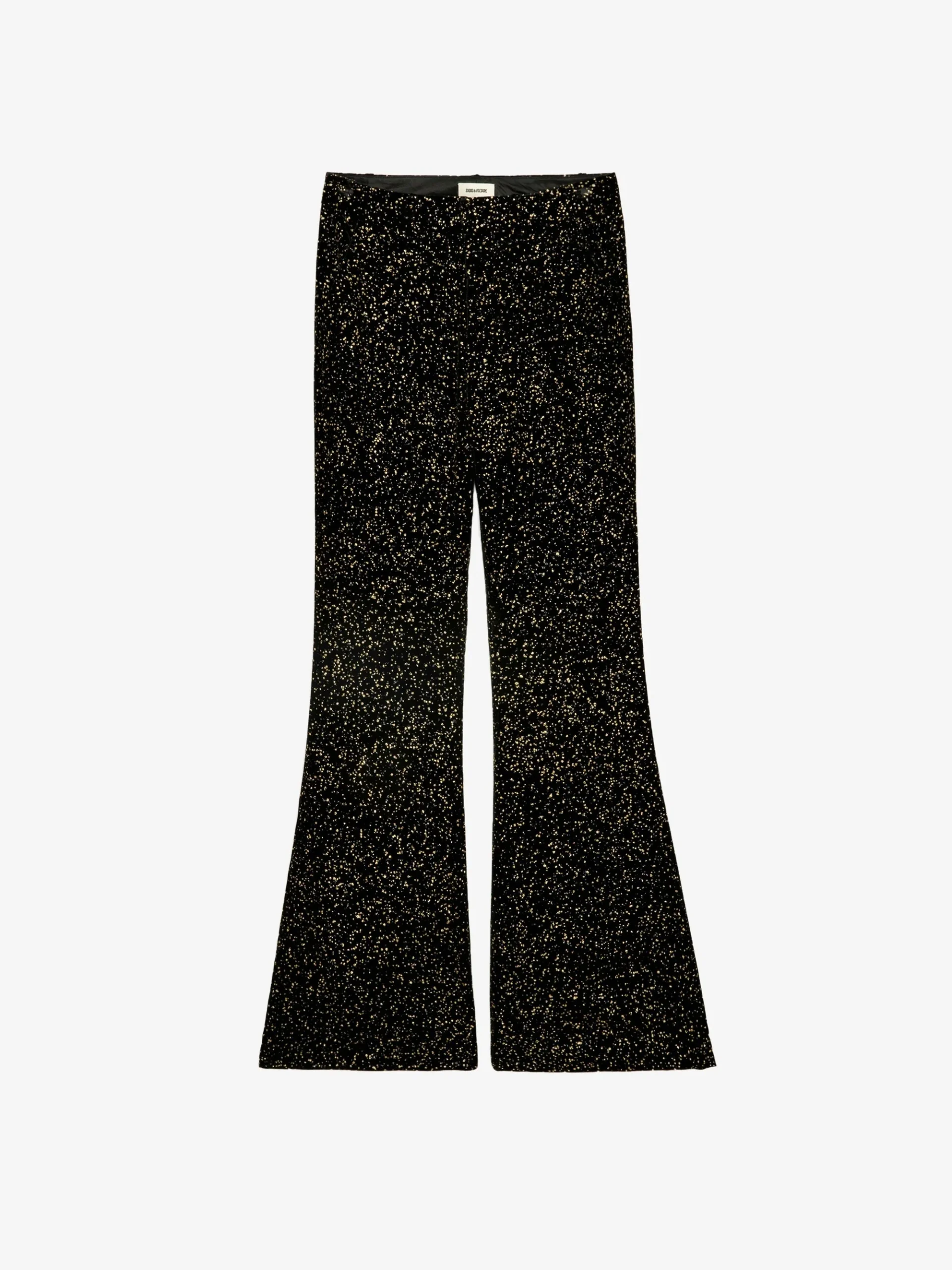 Pantalón acampanado negro de talle medio, con purpurina, perneras acampanadas y bolsillos.