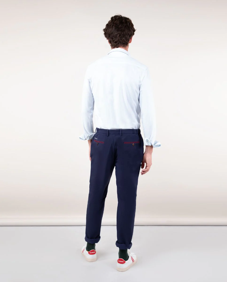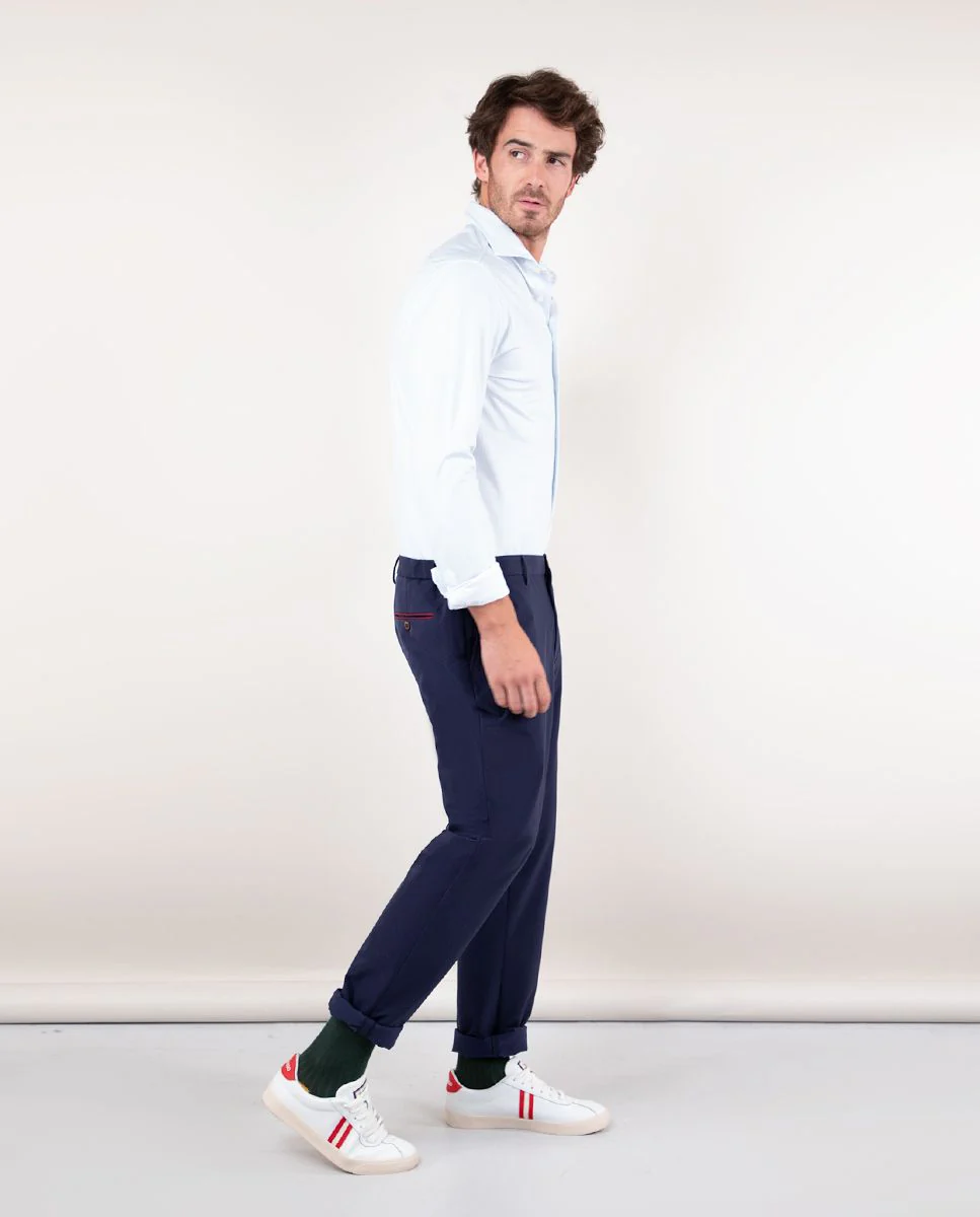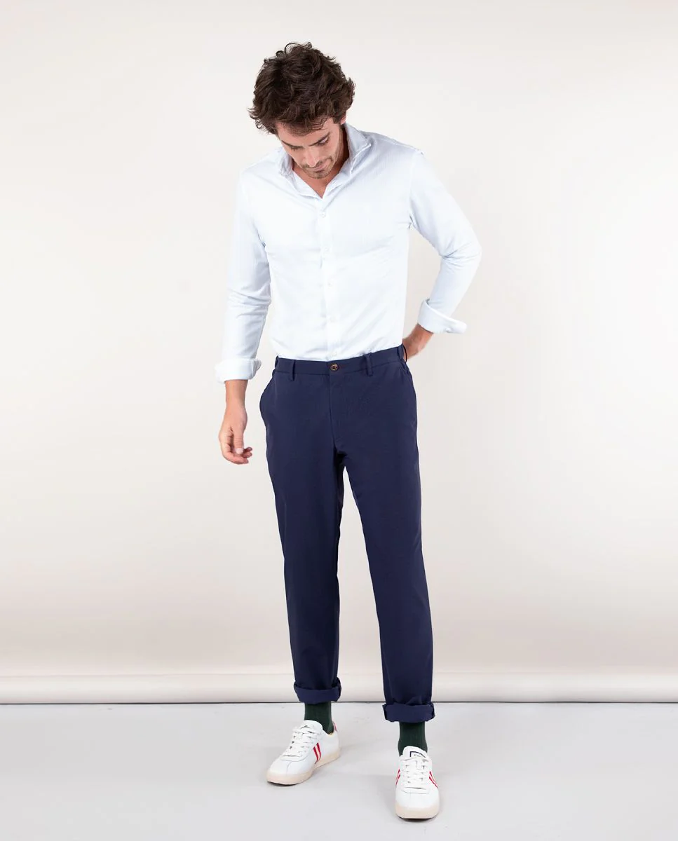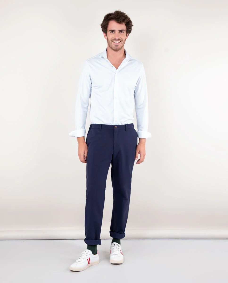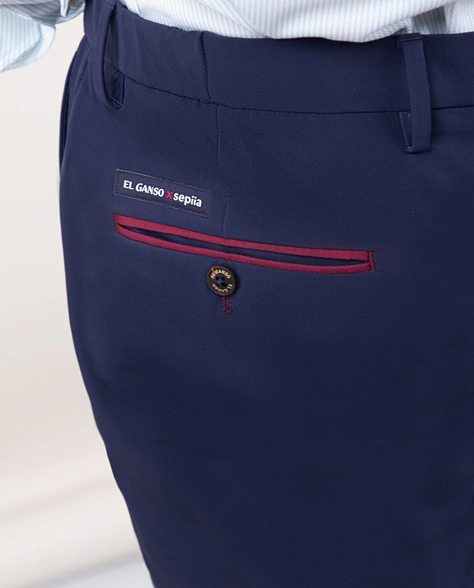 Pantalón liso de hombre confeccionado con tecnología de Sepiia en tejido 100% poliéster técnico antibacteriano reciclable. Corte Slim Fit, tiene cintura clásica en delantero y elástica por la espalda para que sea más confortable. Cuenta con bolsillos laterales y traseros de vivo. Disponible americana a juego. Estos tejidos han sido producidos en España y las prendas han sido confeccionadas en Portugal de una forma sostenible.