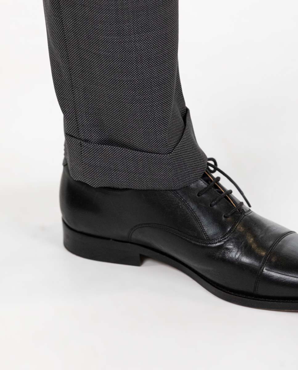 Pantalón ojo de perdiz gris confeccionado en 100% lana del fabricante italiano Marzotto con un acabado repelente al agua. Corte regular fit. Cierre mediante cremallera oculta por tapeta y botón. Dos bolsillos laterales, uno monedero y bolsillos traseros con vivos. Trabillas para el cinturón. Detalle de tejido corbatero de rayas en vivo bolsillo trasero. Hecho en Portugal.