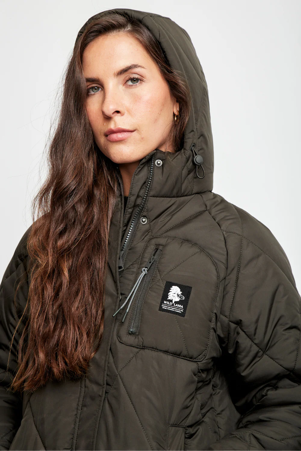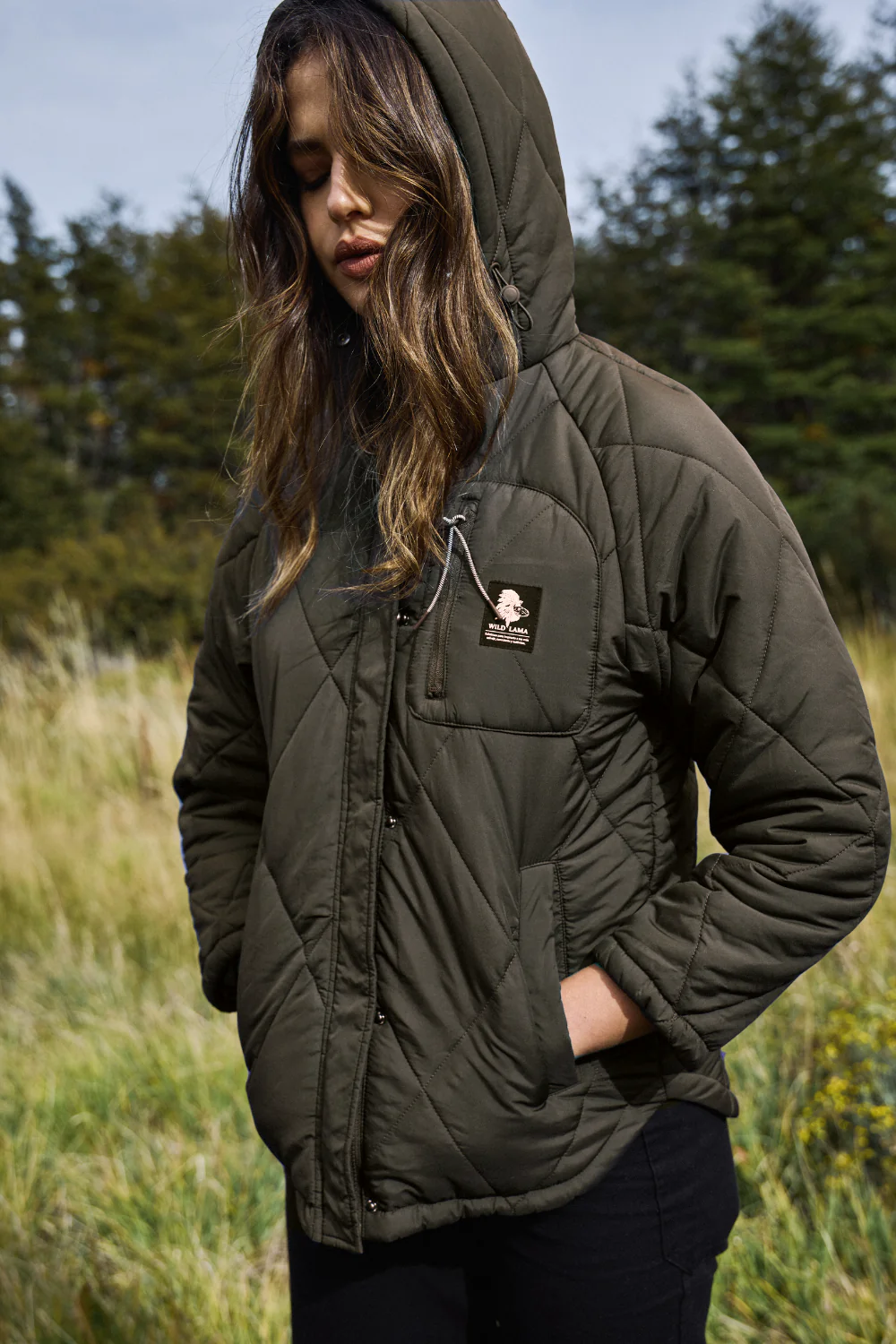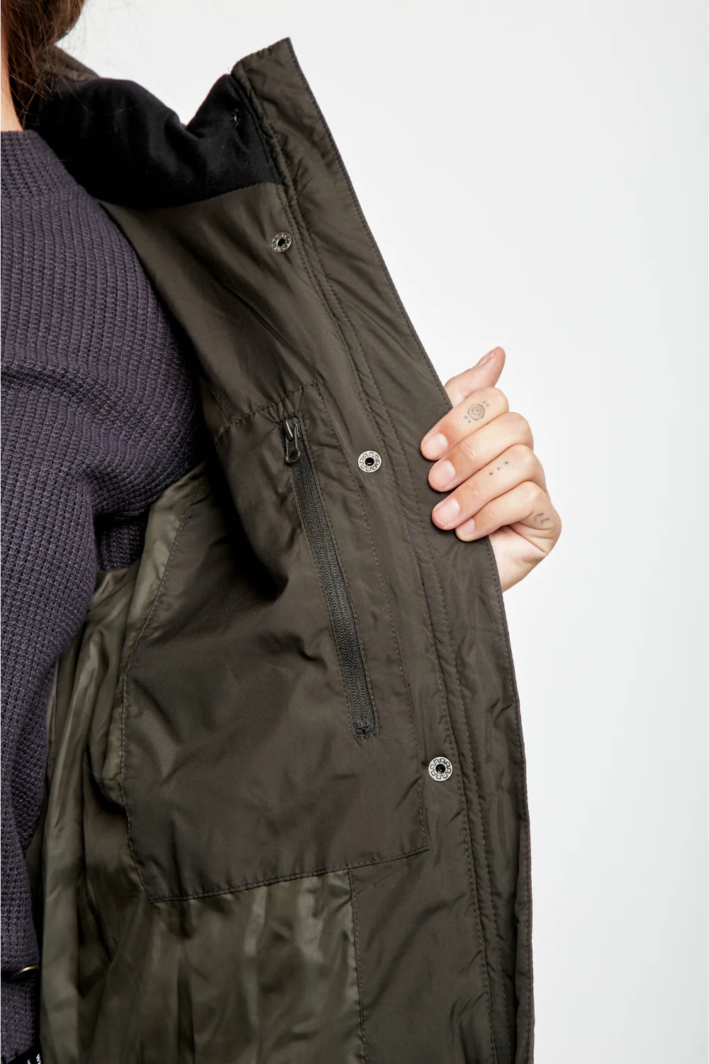 Sea caminando por la ciudad o escapando a la montaña, está diseñada para mantenerte abrigada y cómoda. Tiene bolsillos para todo (porque siempre hay algo que guardar), gorro ajustable y un cierre completo de cuello alto reforzado con broches que no dejan entrar el viento. No es impermeable.