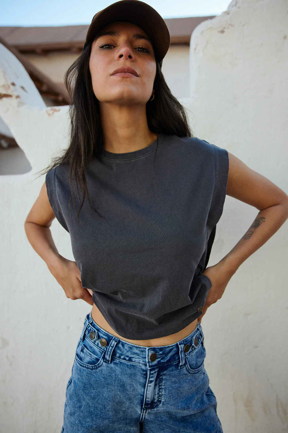 La versátilidad es su razón de existir. Fue diseñada con cuello redondo clásico y corte sin mangas para mayor libertad de movimiento. Ideal para los días de calor o para sumar estilo relajado a tu look diario.