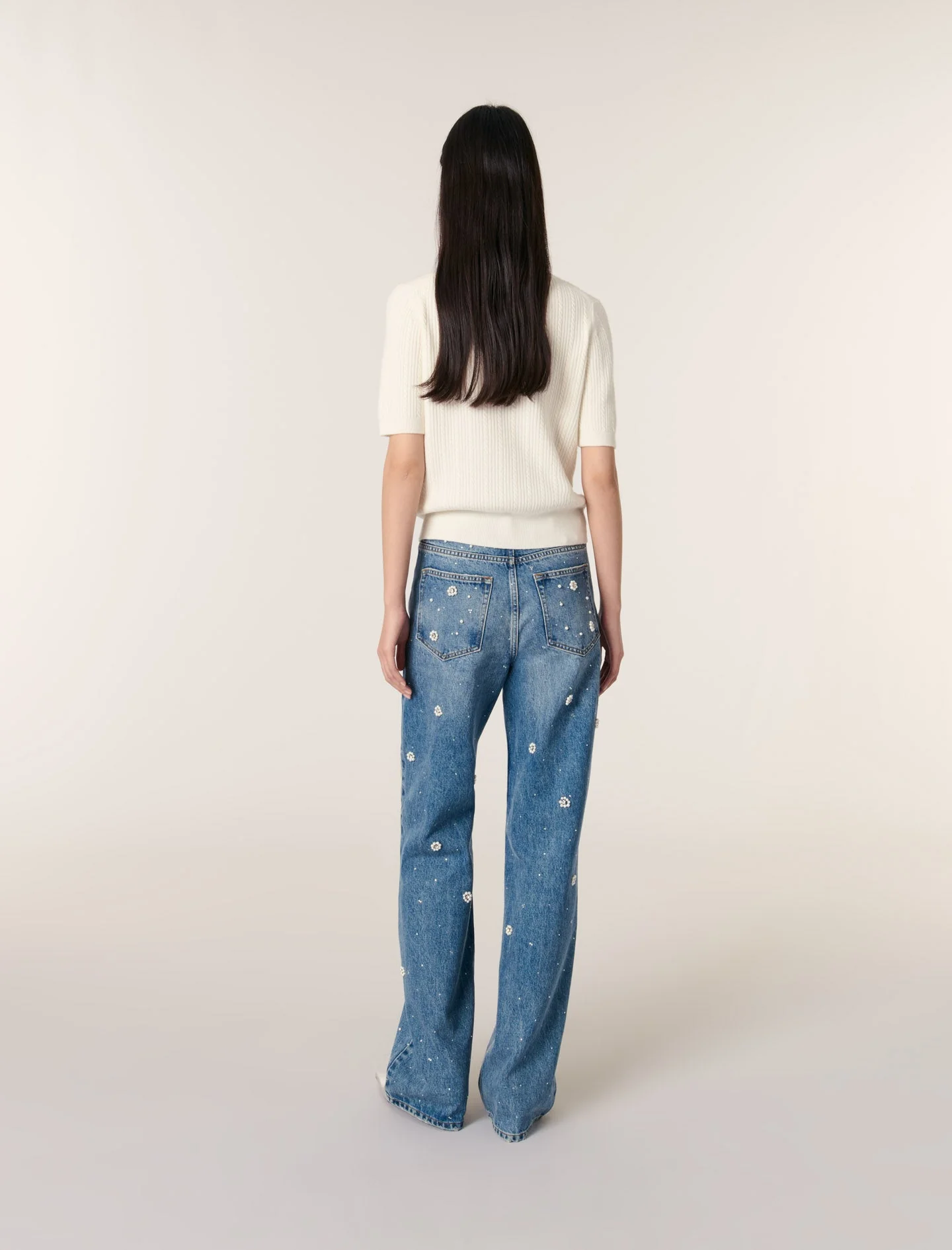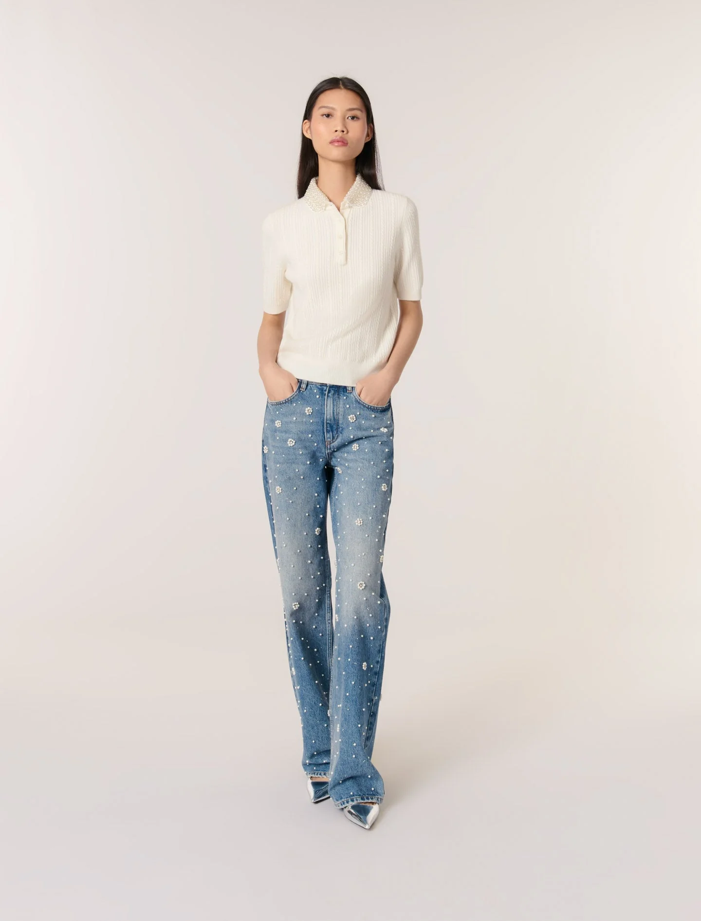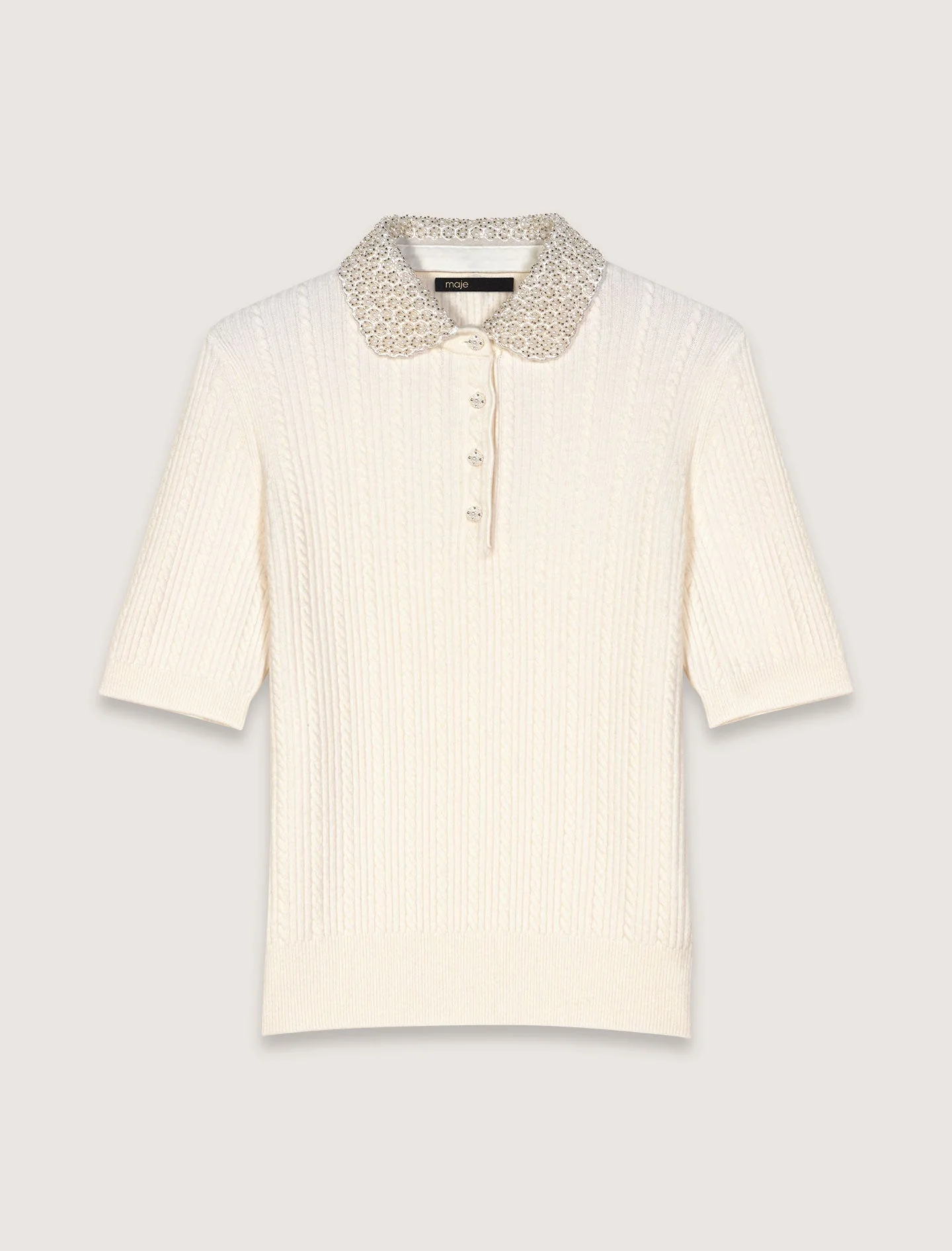 Confeccionado con punto suave y de ochos, este polo dibuja una silueta entallada. El cuello Peter Pan desmontable está iluminado con abalorios y estrás bordados. Para conservar toda la belleza de los detalles de esta prenda, el cuello está forrado y no debe lavarse a máquina.