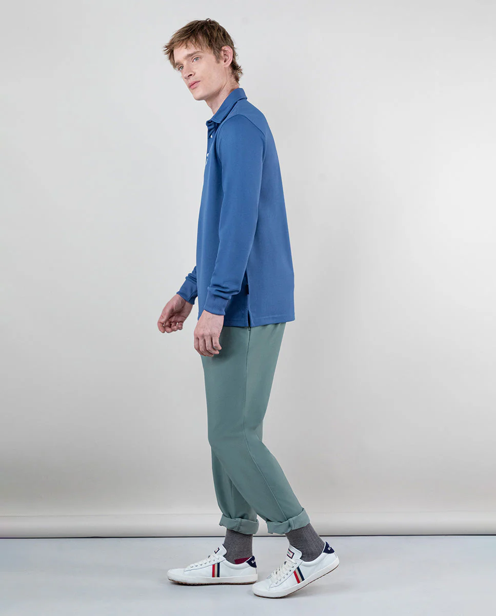 Polo de hombre liso con tecnología Sepiia de manga larga confeccionado en tejido 100% poliéster técnico antibacteriano reciclable. Corte slim fit, cuello clásico, cierre mediante tapeta de dos botones. Logo bordado a contraste a la altura del pecho. Estos tejidos han sido producidos en España y las prendas han sido confeccionadas en Portugal de una forma sostenible.