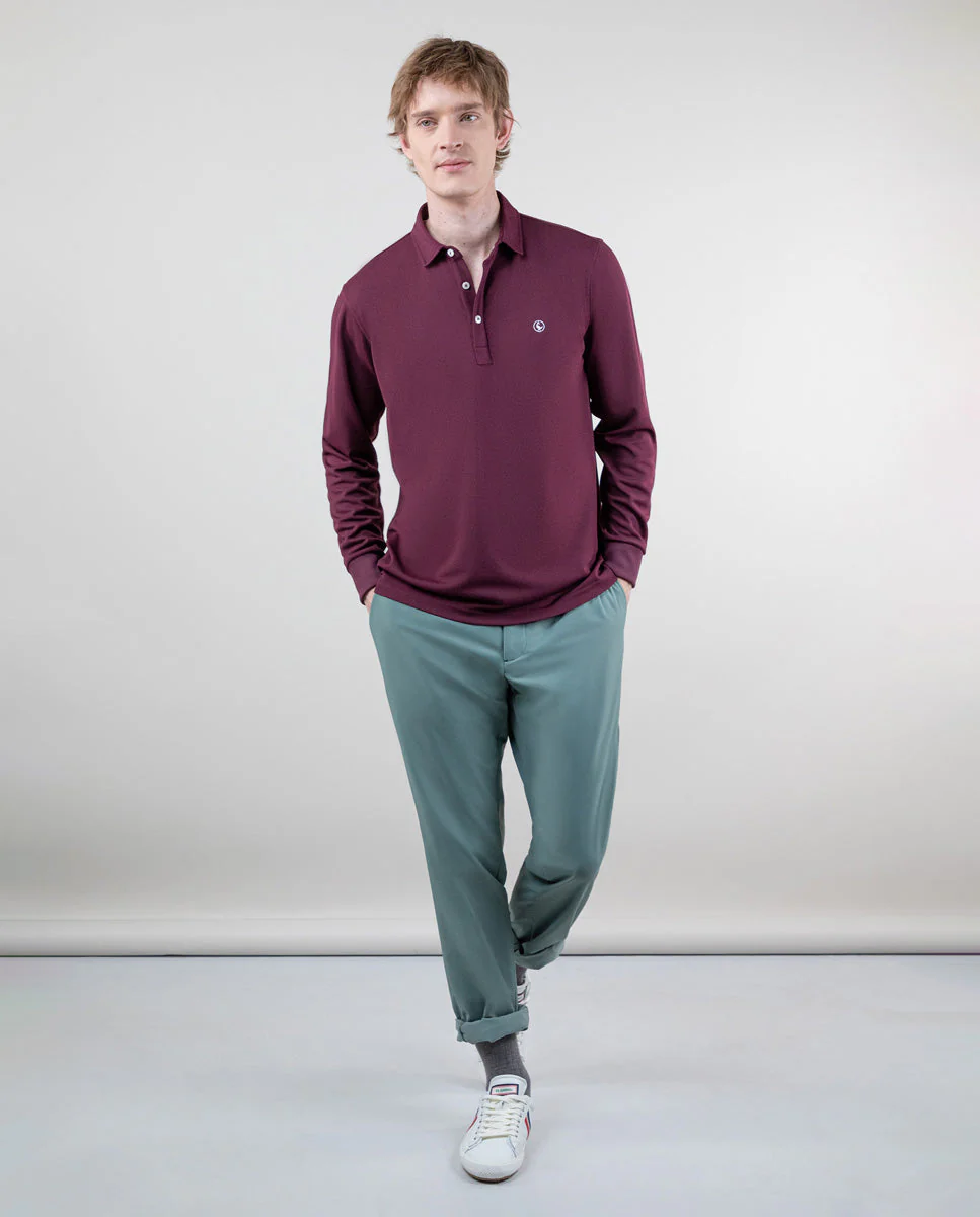 Polo de hombre liso con tecnología Sepiia de manga larga confeccionado en tejido 100% poliéster técnico antibacteriano reciclable. Corte slim fit, cuello clásico, cierre mediante tapeta de dos botones. Logo bordado a contraste a la altura del pecho. Estos tejidos han sido producidos en España y las prendas han sido confeccionadas en Portugal de una forma sostenible.