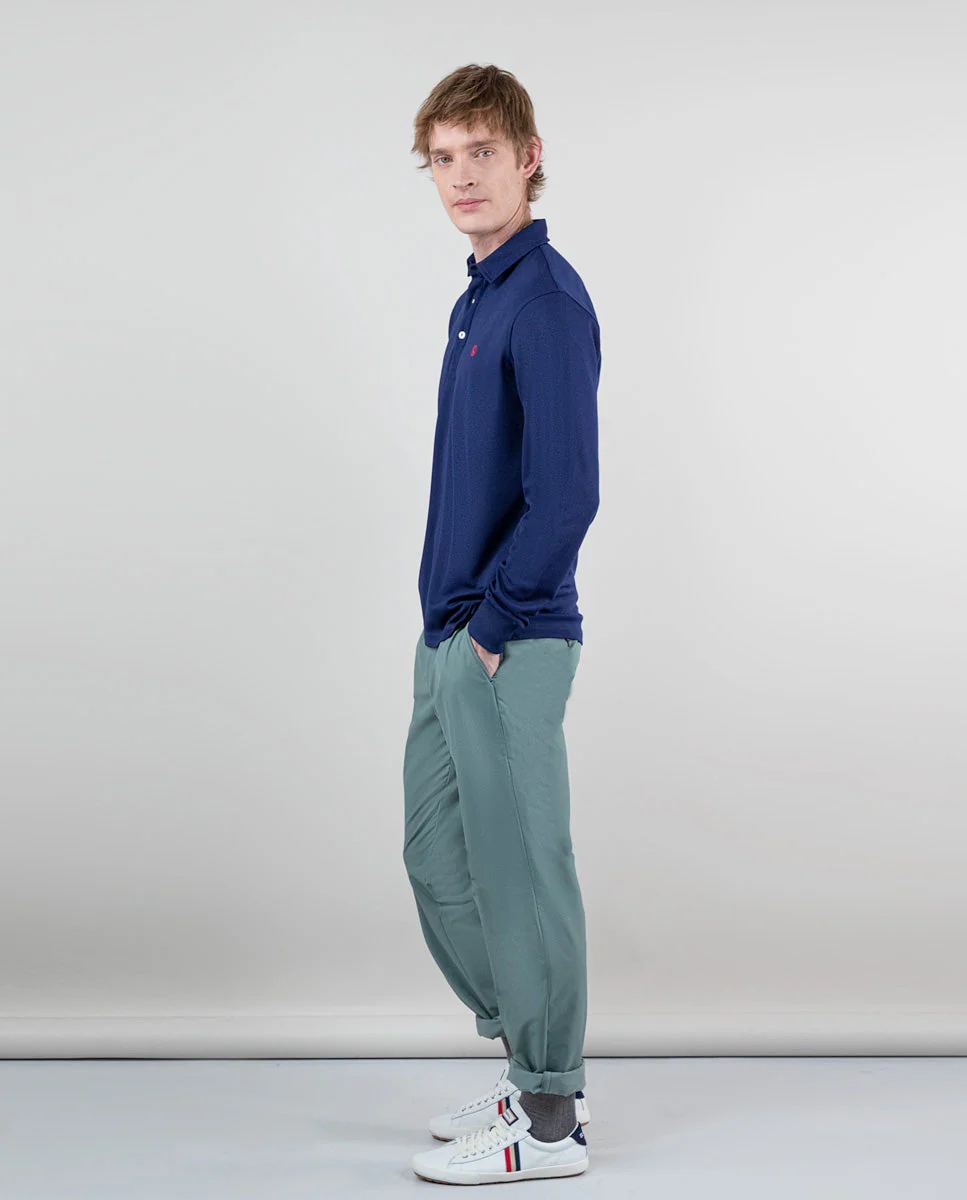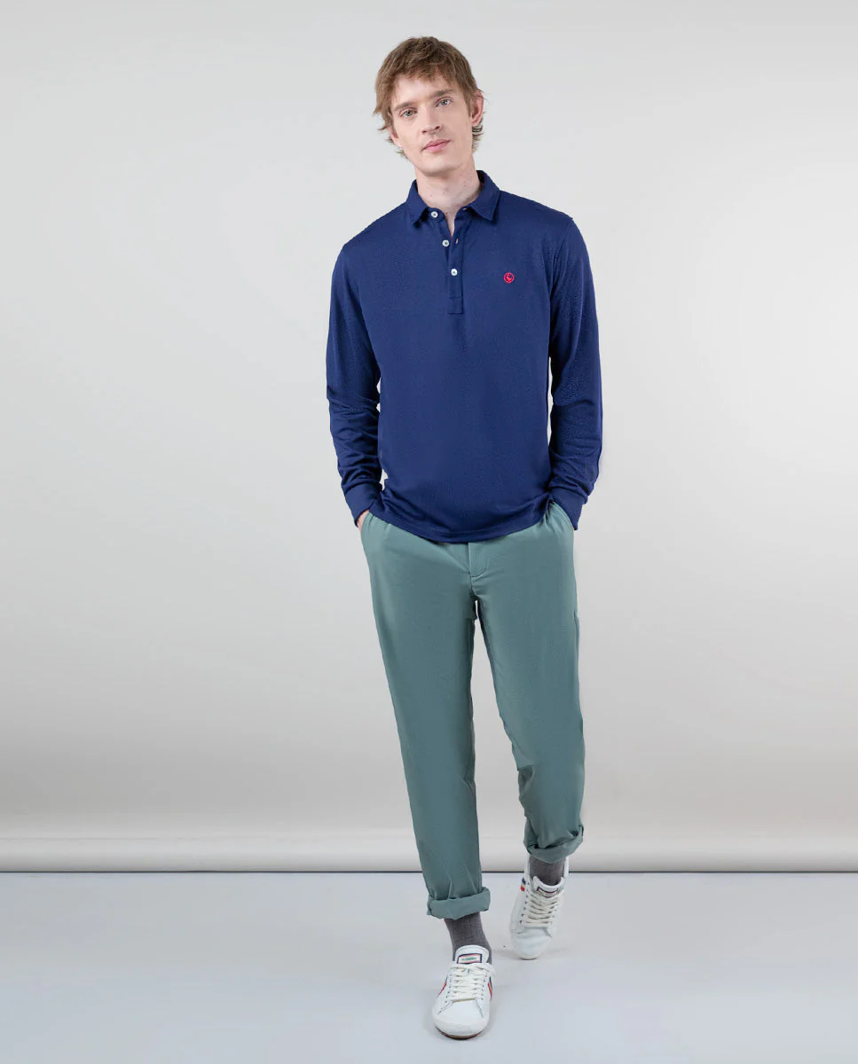 Polo de hombre liso con tecnología Sepiia de manga larga confeccionado en tejido 100% poliéster técnico antibacteriano reciclable. Corte slim fit, cuello clásico, cierre mediante tapeta de dos botones. Logo bordado a contraste a la altura del pecho. Estos tejidos han sido producidos en España y las prendas han sido confeccionadas en Portugal de una forma sostenible.