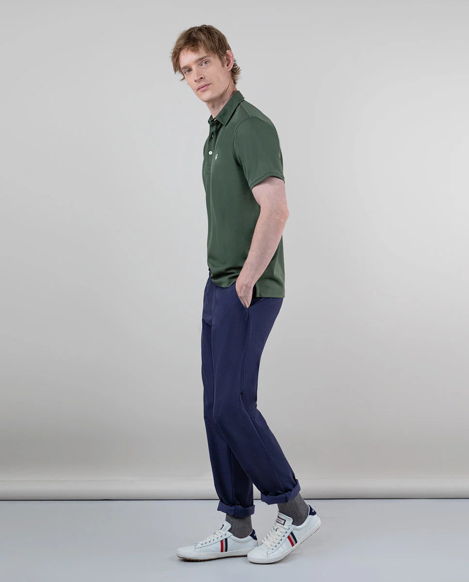 Polo de hombre liso con tecnología Sepiia de manga corta confeccionado en tejido 100% poliéster técnico antibacteriano reciclable. Corte slim fit, cuello clásico, cierre mediante tapeta de dos botones. Logo bordado a contraste a la altura del pecho. Estos tejidos han sido producidos en España y las prendas han sido confeccionadas en Portugal de una forma sostenible.